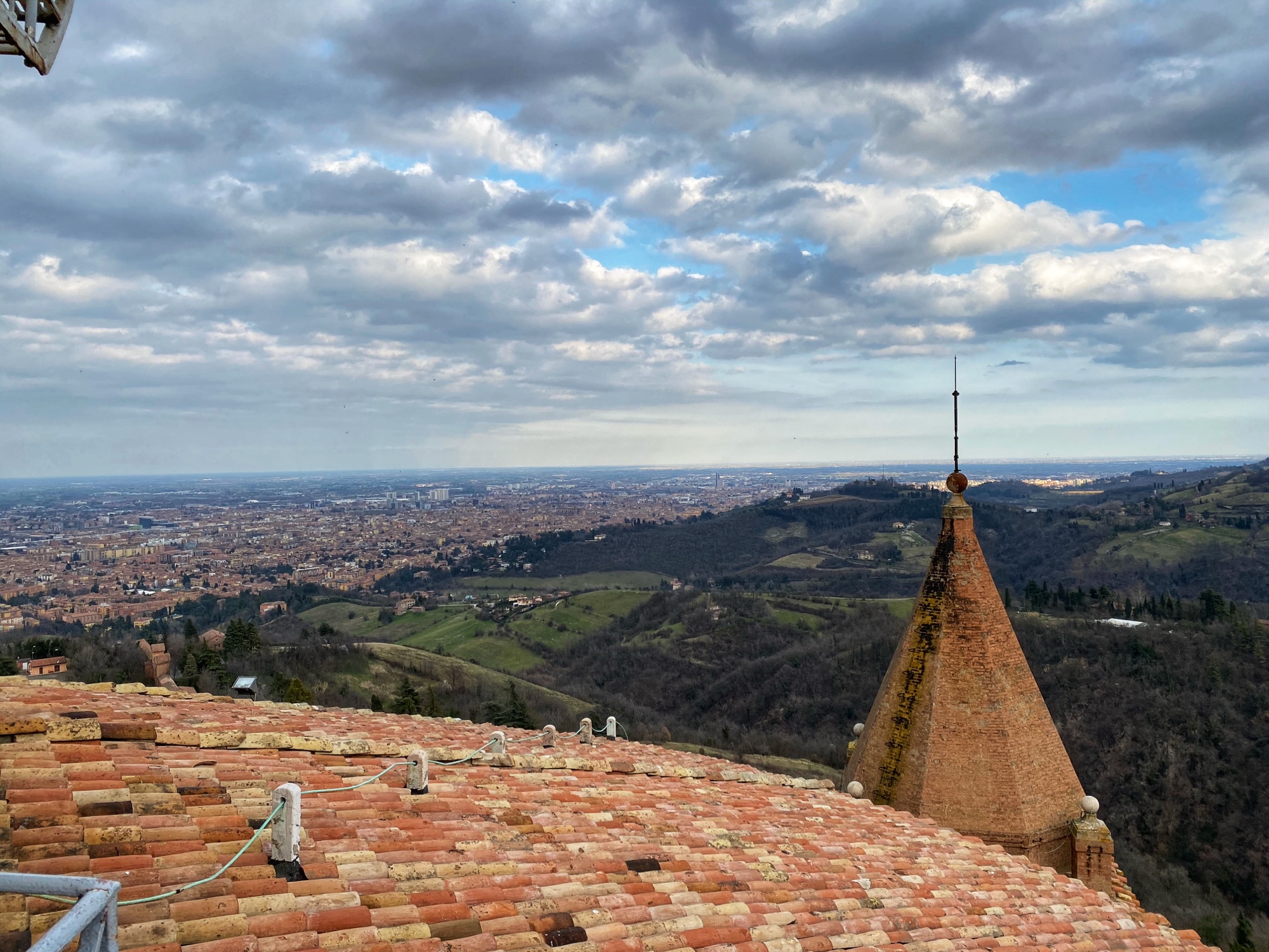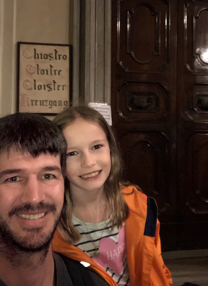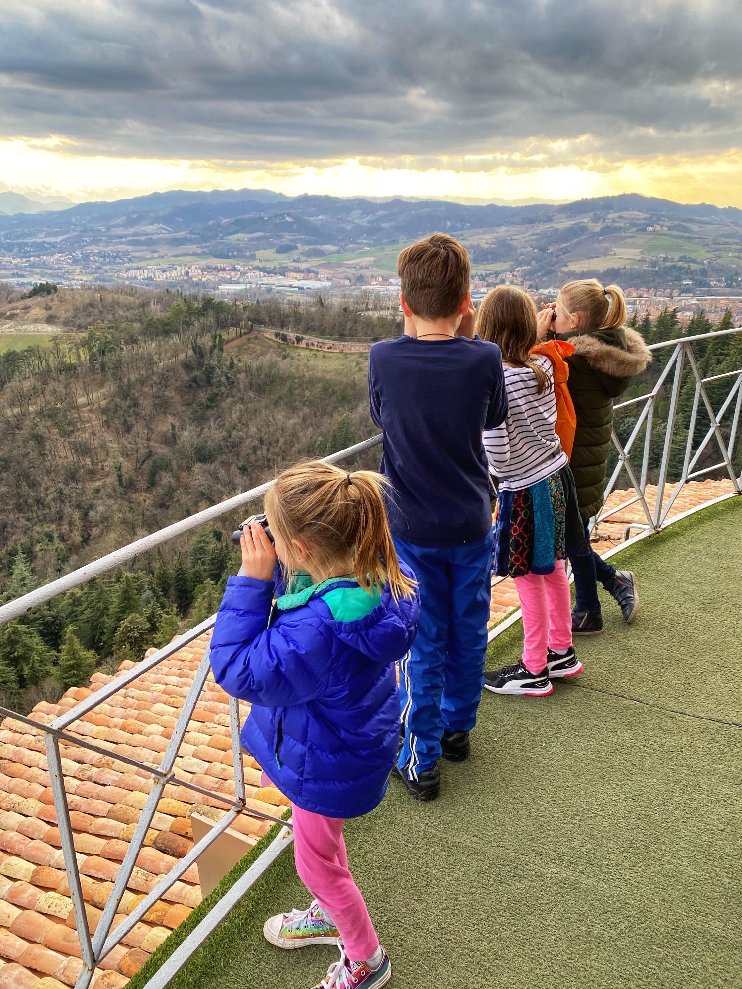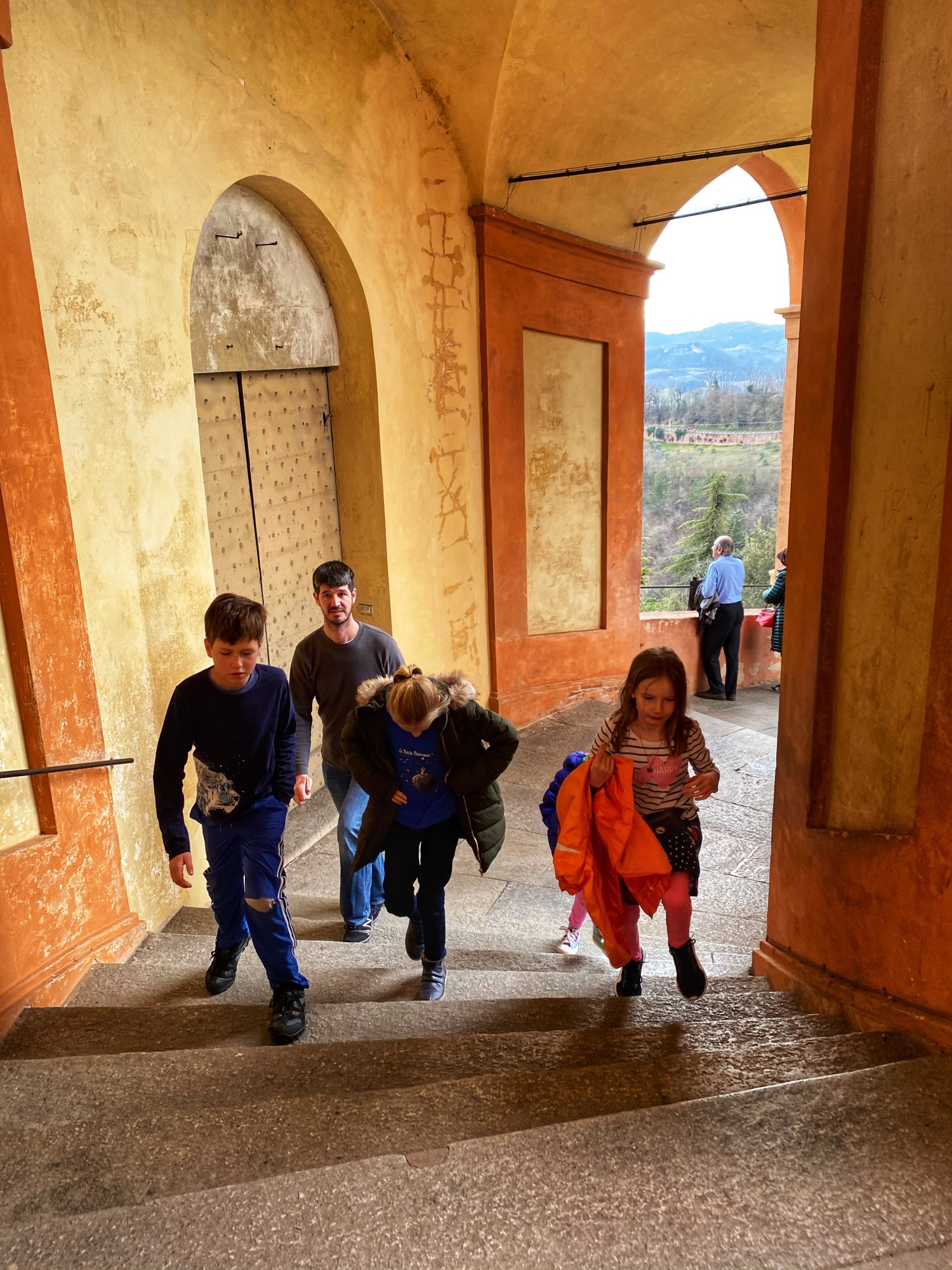 Bologna was an unplanned stop as we realized it was directly on our route. I knew of a worthwhile hilltop pitstop called Sanctuary of the Madonna di San Luca, and since visibility was good that day, we went for it. The city of Bologna boasts the world’s longest network of porticos, so it was especially fun to bring the kids here and show them the start of the portico system at the Sanctuary on top of the hill. I visited here last year on a tour through northern Italy with my friend (see blog here) but we weren’t able to climb to the top of the dome – only the Sanctuary. This time we enjoyed the views from the large dome, looking out over the Italian countryside in one direction and over the foodie city of Bologna in the other direction.