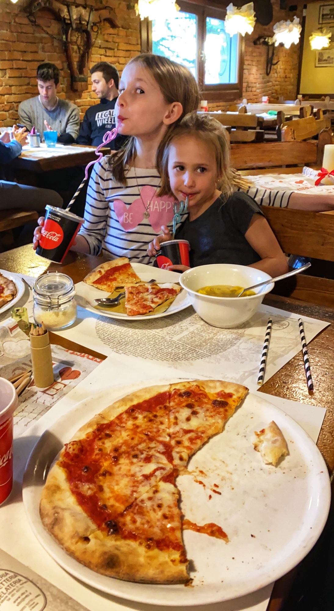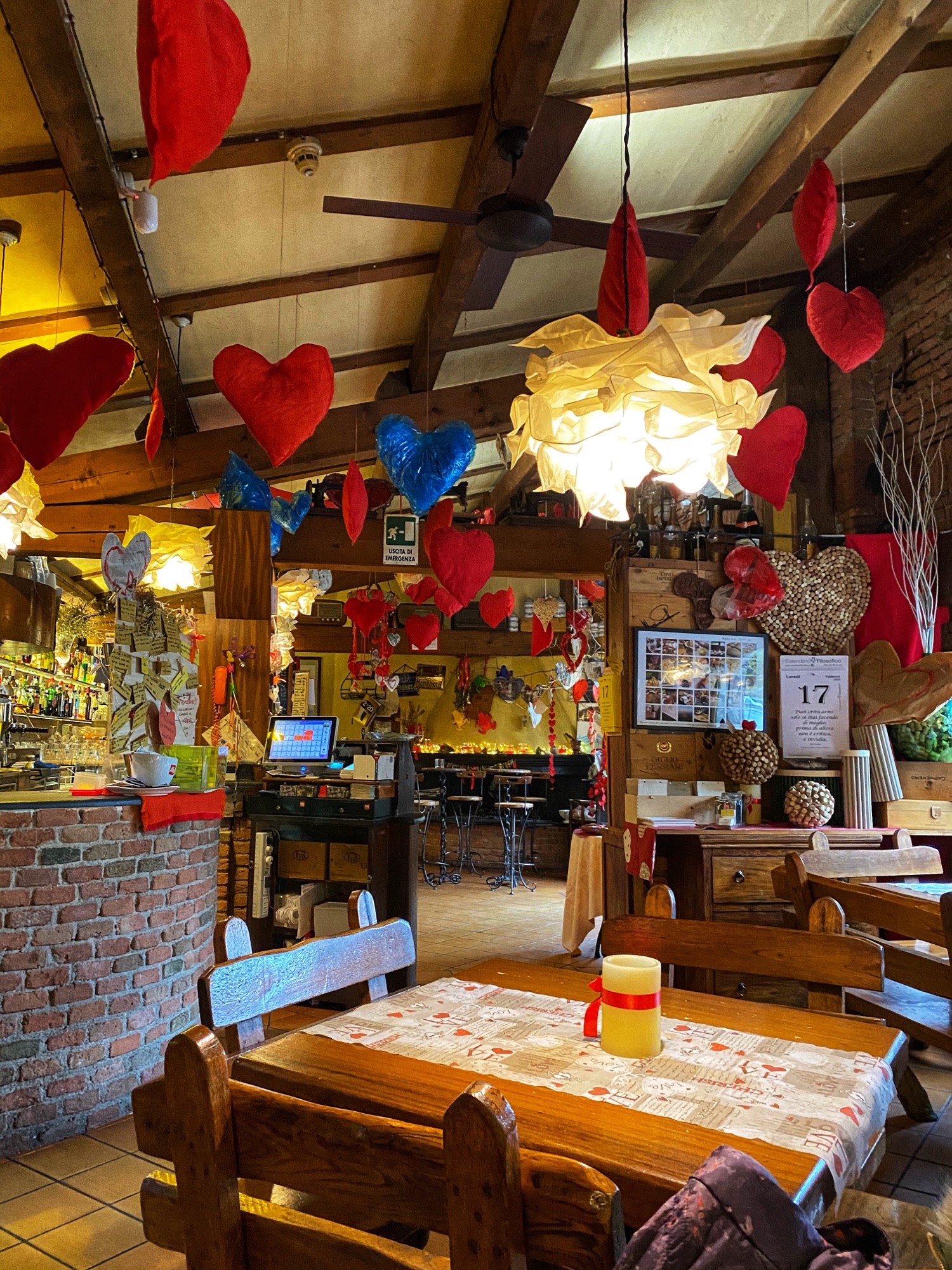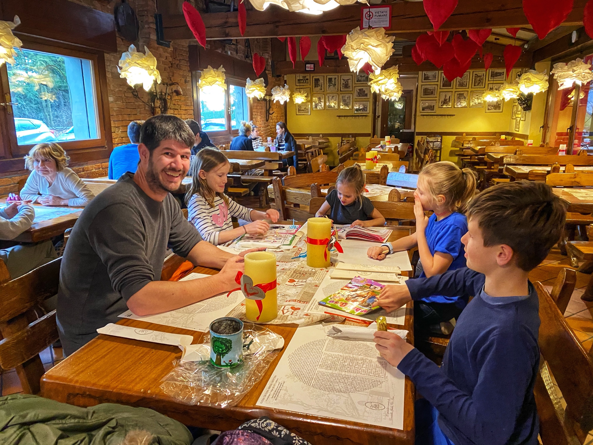 We had dinner at the nearby Vito a San Luca restaurant, where we enjoyed a delicious, authentic meal of brick oven pizza and tortellini con brodo, or homemade tortellini pasta in broth. The waiter took such good care of us here, and I was impressed by the elaborate and seasonally changing decor in this cozy eatery! Bro had his first pizza topped with arugula (I think he liked it!) and the kids took home little colored pencil packs as souvenirs. Super cute!