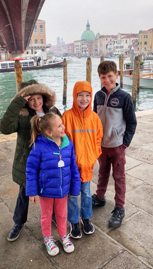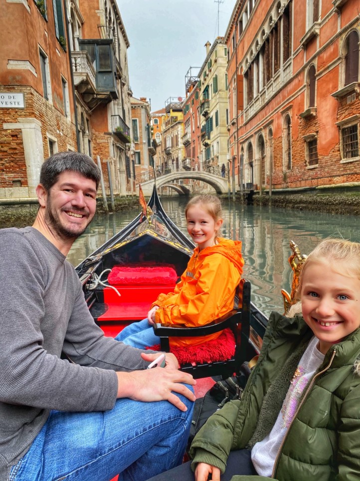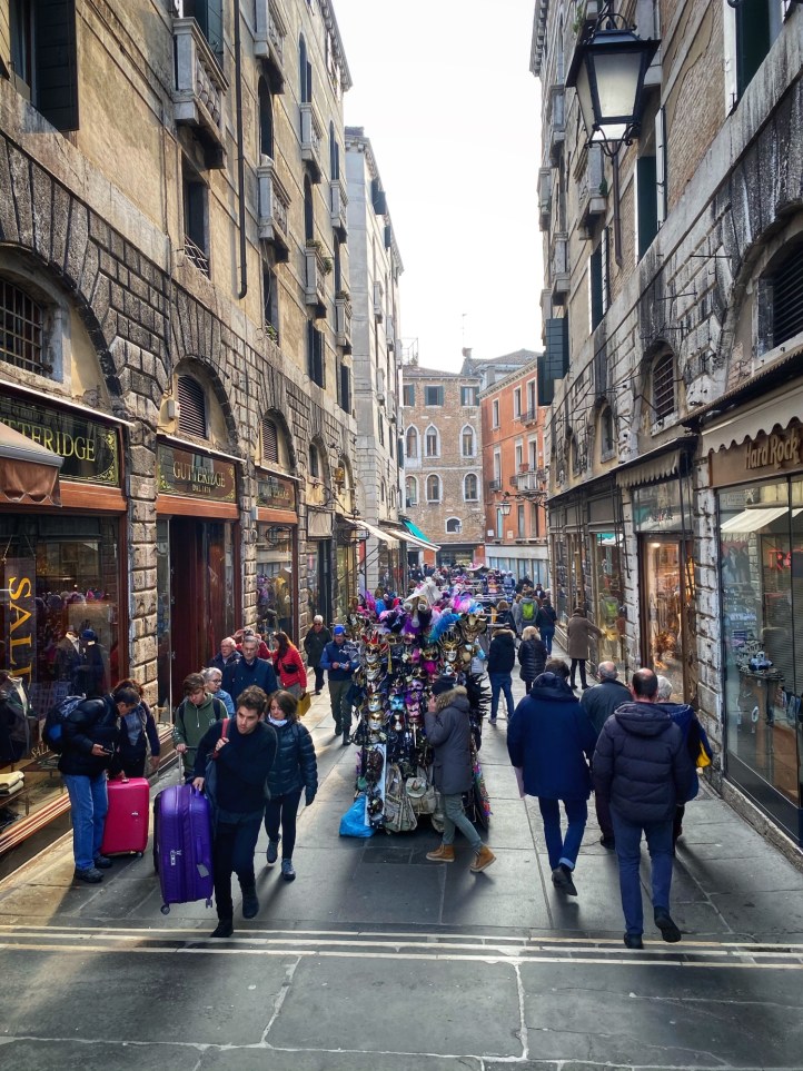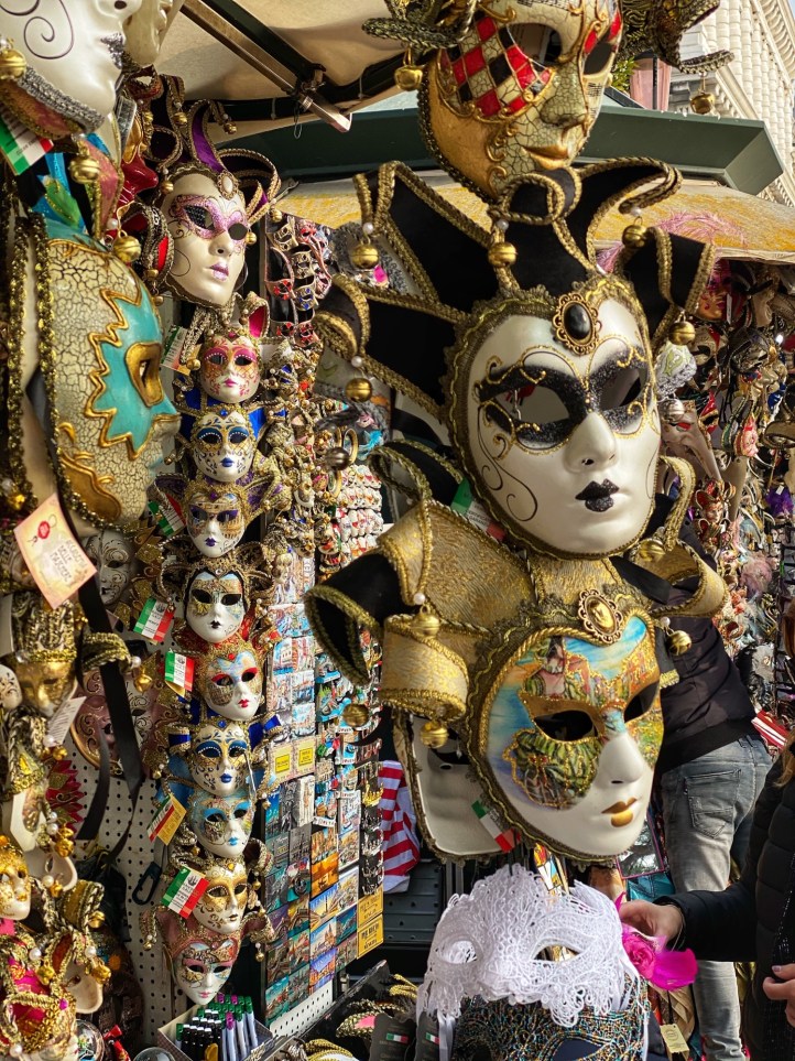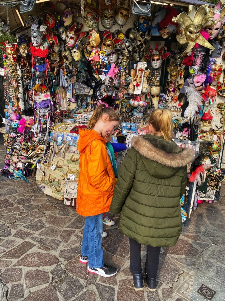 When traveling with our family, every morning is marked by some sort pitstop at a bakery or cafe to indulge in whatever pastry the area is famous for. On this trip, Bro grew to appreciate the beauty of espresso (delicious, smaller portions, less need to pee when touring around) so once we made it into the city of Venice on the bus, we stopped for a yummy cream filled donut and coffees before catching the water taxi. It was so convenient and affordable to park at Venice City Park and grab the bus into the city – it made all transport and navigation super easy. We got all-day passes for the vaporetto (water taxis) and made our way down the grand canal past the colorful buildings and countless boats and gondolas. We noticed it wasn’t that busy (is it just me or is this a trend for us?). We were very lucky that it wasn’t flooded and we were able to traverse the city on foot in beautiful weather and see all the sights on our list. Also it was terrific to be in the city during Carnivale, a little added bonus on our trip! Just a few days after we toured the city, the Veneto and Lombardi regions of Italy was put on alert due to a public health scare (Coronavirus) and the Carnivale activities were cancelled. We were very lucky to make it there when we did! Little did we know we were in the epicenter of Corona, the first region to lock down due to the pandemic, and to this day we can’t believe our luck with the timing of this trip. On the plane home Bro and cuz came down with an ailment but we will never know if it was the Coronavirus because there were no tests in the states in February, 2020. In hindsight, looking at us frolic through Venice carefree and mask-free was truly a gift!