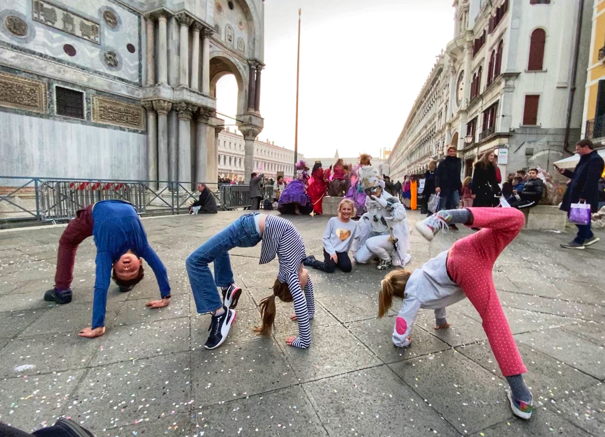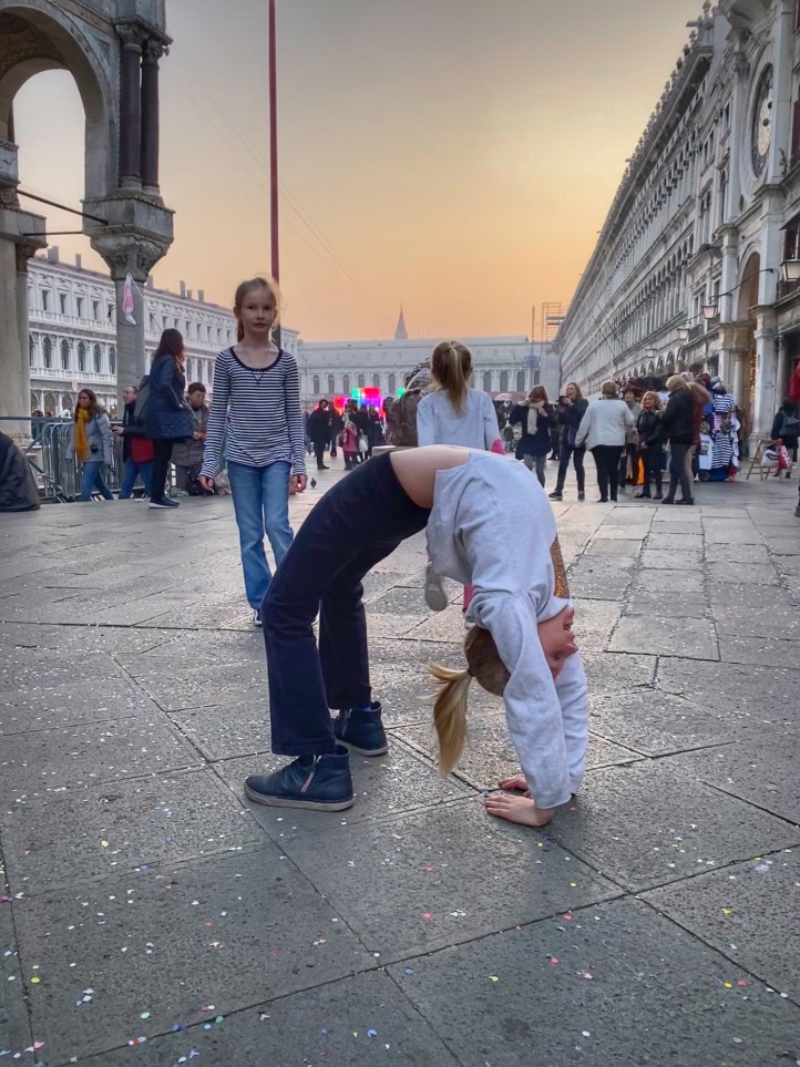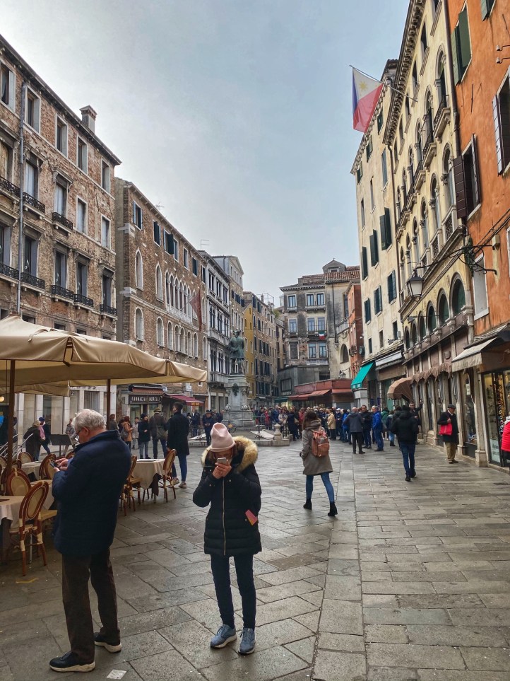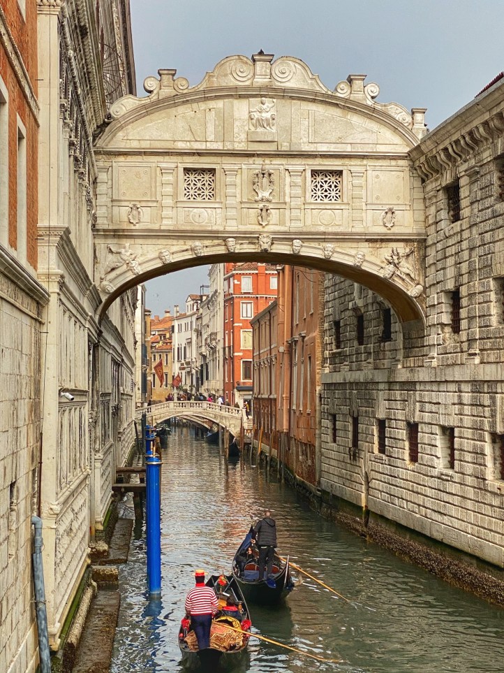 When traveling with our family, every morning is marked by some sort pitstop at a bakery or cafe to indulge in whatever pastry the area is famous for. On this trip, Bro grew to appreciate the beauty of espresso (delicious, smaller portions, less need to pee when touring around) so once we made it into the city of Venice on the bus, we stopped for a yummy cream filled donut and coffees before catching the water taxi. It was so convenient and affordable to park at Venice City Park and grab the bus into the city – it made all transport and navigation super easy. We got all-day passes for the vaporetto (water taxis) and made our way down the grand canal past the colorful buildings and countless boats and gondolas. We noticed it wasn’t that busy (is it just me or is this a trend for us?). We were very lucky that it wasn’t flooded and we were able to traverse the city on foot in beautiful weather and see all the sights on our list. Also it was terrific to be in the city during Carnivale, a little added bonus on our trip! Just a few days after we toured the city, the Veneto and Lombardi regions of Italy was put on alert due to a public health scare (Coronavirus) and the Carnivale activities were cancelled. We were very lucky to make it there when we did! Little did we know we were in the epicenter of Corona, the first region to lock down due to the pandemic, and to this day we can’t believe our luck with the timing of this trip. On the plane home Bro and cuz came down with an ailment but we will never know if it was the Coronavirus because there were no tests in the states in February, 2020. In hindsight, looking at us frolic through Venice carefree and mask-free was truly a gift!