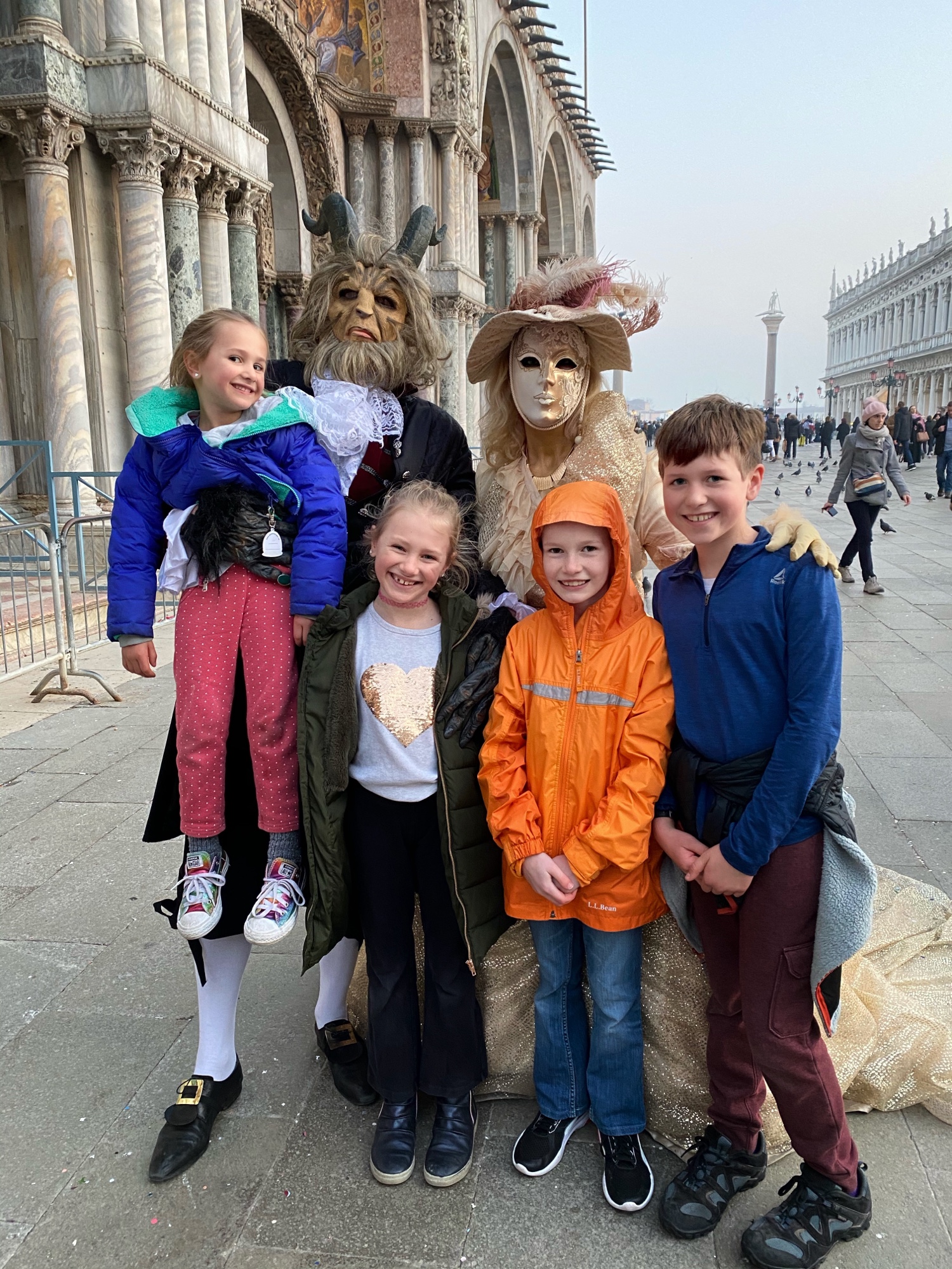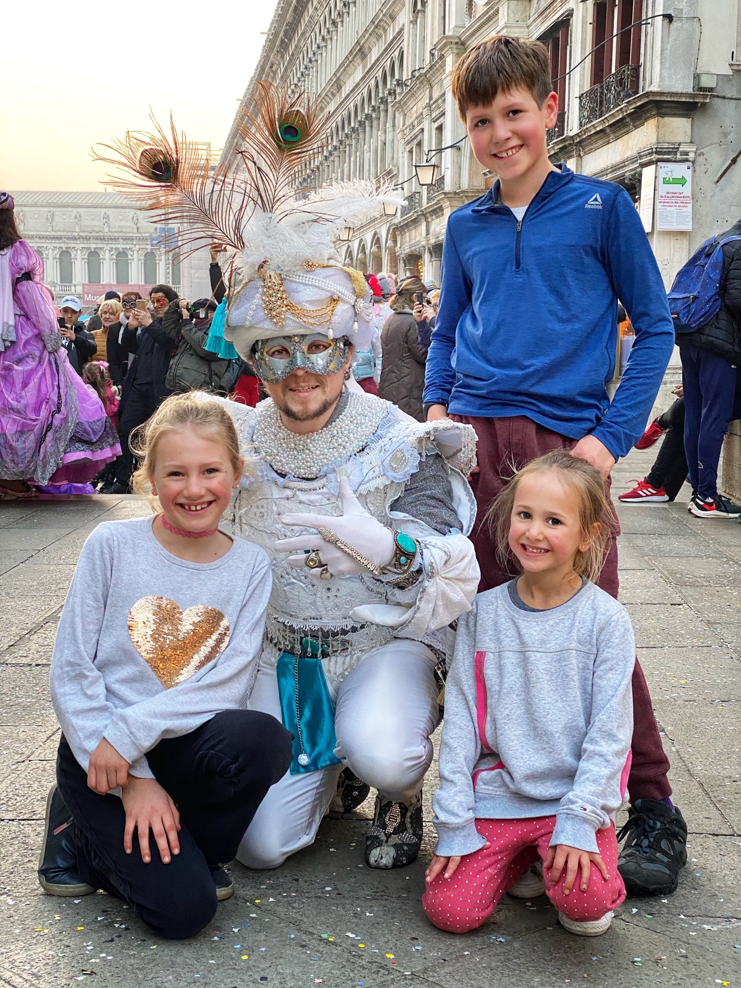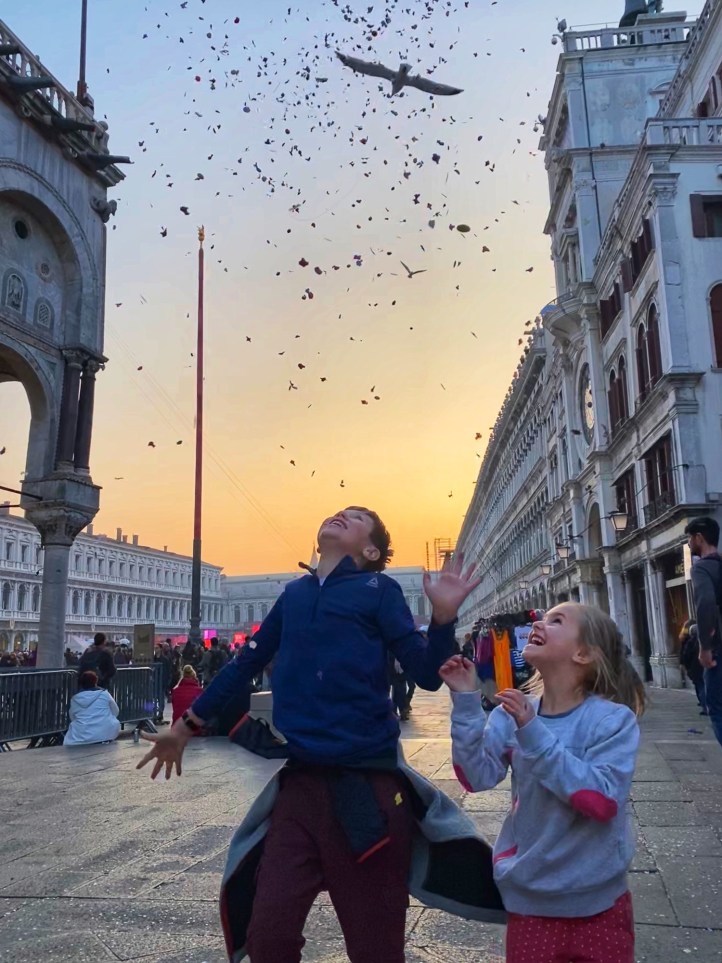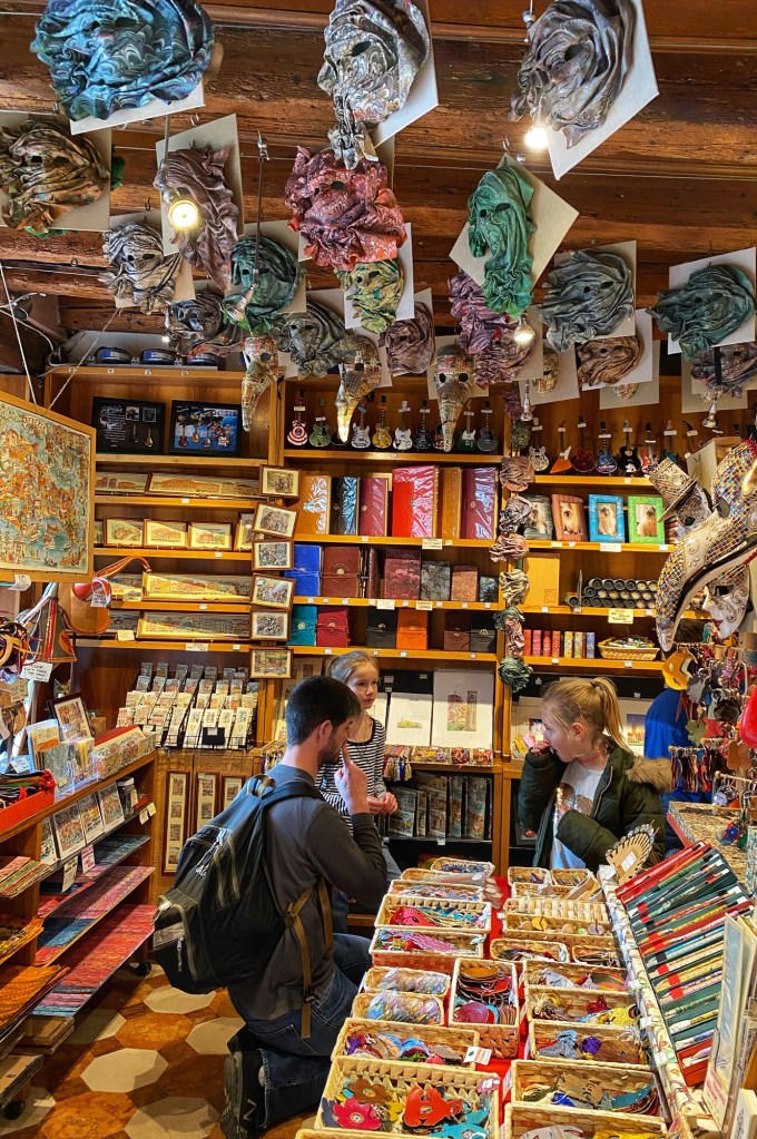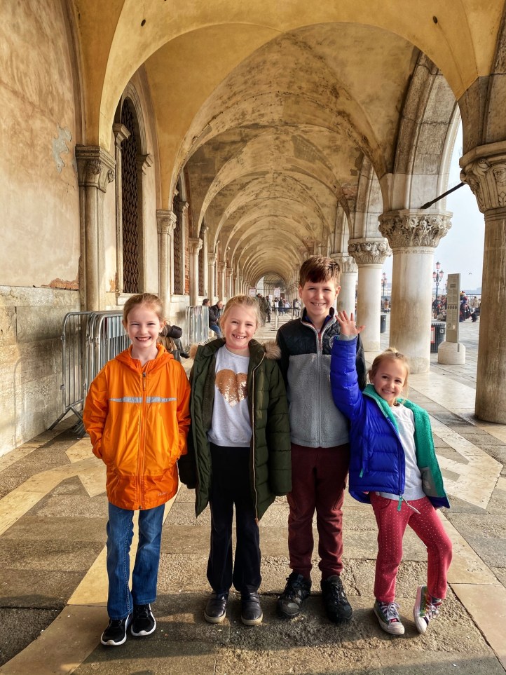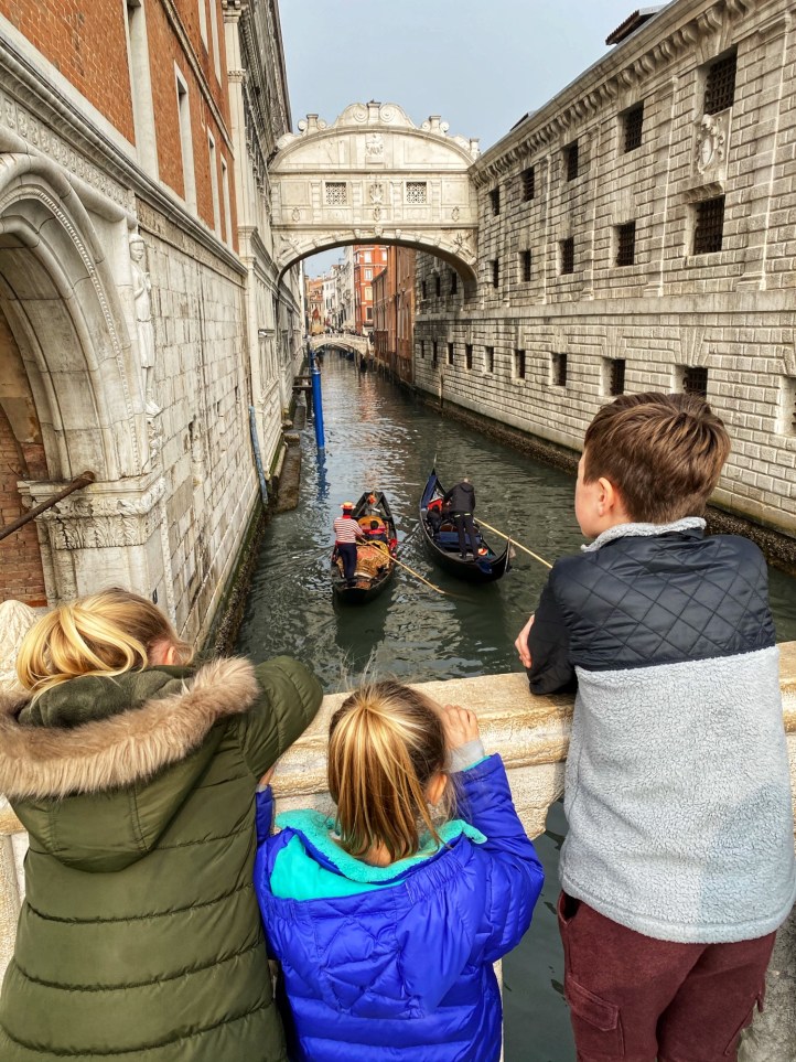 The kids had a great time chasing pigeons and dodging seagulls who were aggressively trying to steal food from our hands! We browsed endless Venetian glass and mask shops, saw all kinds of amazing Carnivale costumes, and even got a chance to ride on a gondola. It seemed like the perfect time to visit Venice…there were times we felt like we had the place to ourselves! We got a quick view of the Bridge of Sighs between Doge’s palace and the prison, but if we return to Venice I definitely want to tour Doge’s Palace.
