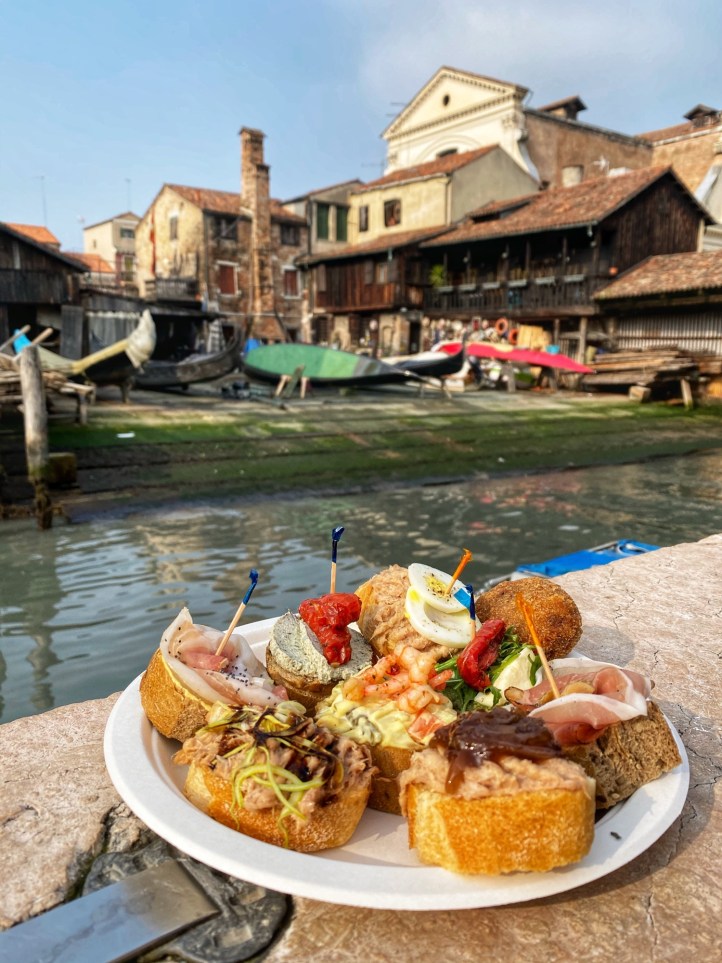 We enjoyed more beautiful views over the rooftops near the Rialto bridge before we selected a nice variety of (cheap!) cicchetti at Osteria Al Squero. I may have been the most excited about this exclusively-Venetian delight but Bro got to try his first Aperol Spritz (in honor of mom who loves them!) so overall we were quite happy with the quick sidewalk fare of Venice.