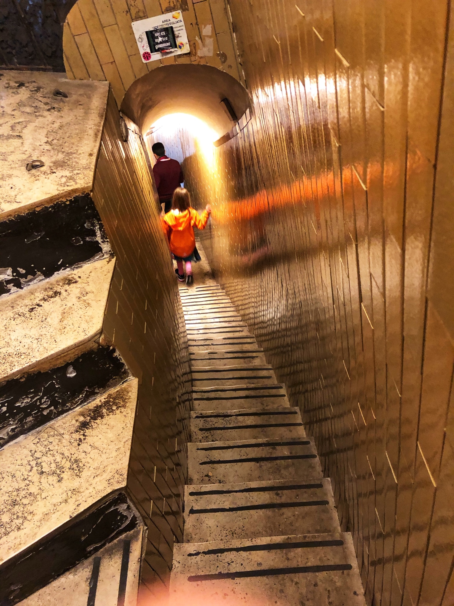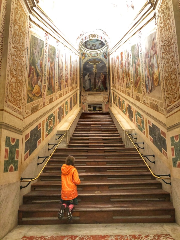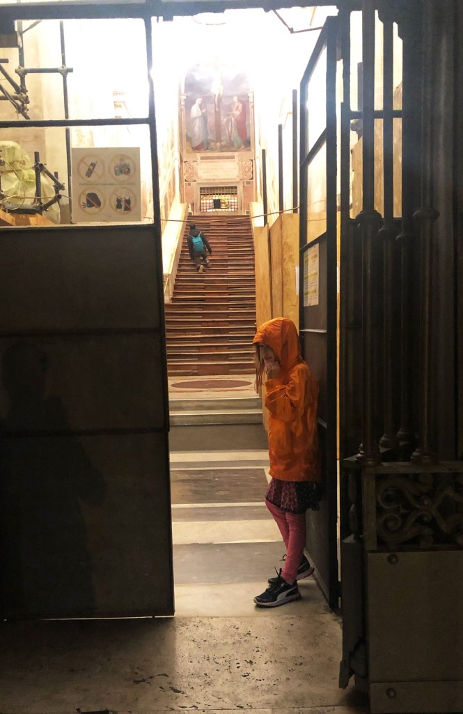 Bro explained that they had a great experience at the Vatican in the morning and then enjoyed the Colosseum in the afternoon. Thereafter they discovered a church nearby – Scala Sancta – with a set of holy stairs that are said to be the stairs Jesus crawled up to meet Pontius Pilate for his sentencing during the Passion. The stairs were transported here from Jerusalem in the 300’s AD and have been a popular pilgrimage site for Catholics ever since. They missed the stairs by about 5 minutes the evening they discovered it, so they woke up early and were there as the doors opened the next morning. What a special treat for them to be able to have the stairs all to themselves for prayerful reflection!