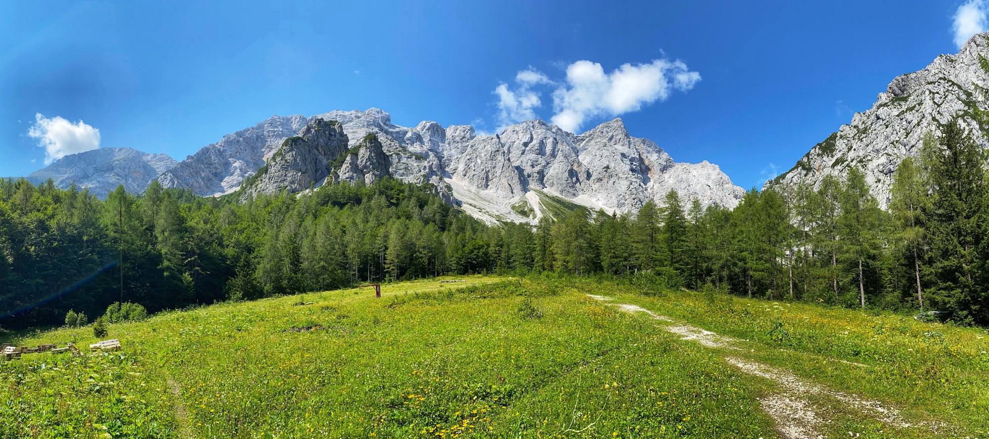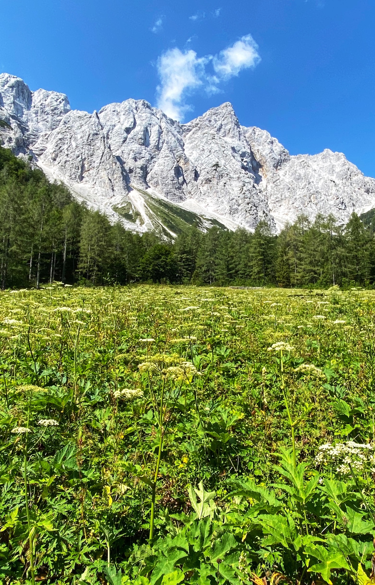After a brief rest at our apartment we gathered up again to head to Robanov Kot, the neighboring valley, for a gentle walk with Bonsai. Our hosts mentioned this was one of their favorite hikes, so we took them up on it. This is a quiet area – very little traffic and again only one way in and out. It was indeed a beautiful place – perhaps the most picturesque section was right next to where we parked, here.