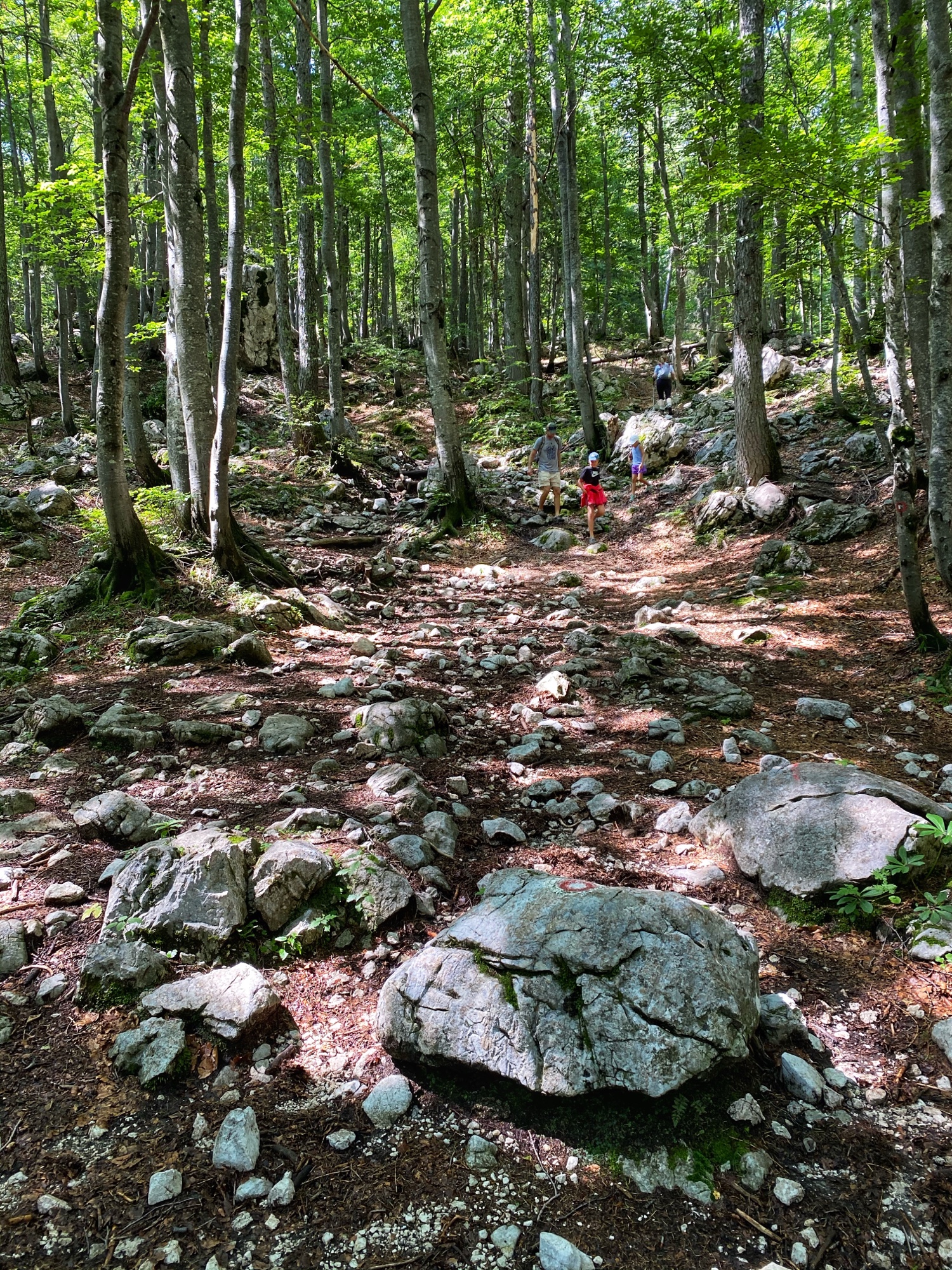 It was a hot day, so it was a good thing we packed plenty of water. But even if you ran out, there were plenty of places to fill up along the way! The water was freezing cold and the trail followed the babbling, cascading river almost all the way up the side of the mountain. The hiking was legit – and the kids did awesome. Some parts of the trail had wire to hold onto and steps as it was pretty steep, and in other places there were rocks to scramble up. We gained a lot of elevation quickly, so we took frequent breaks to sit and enjoy the views.