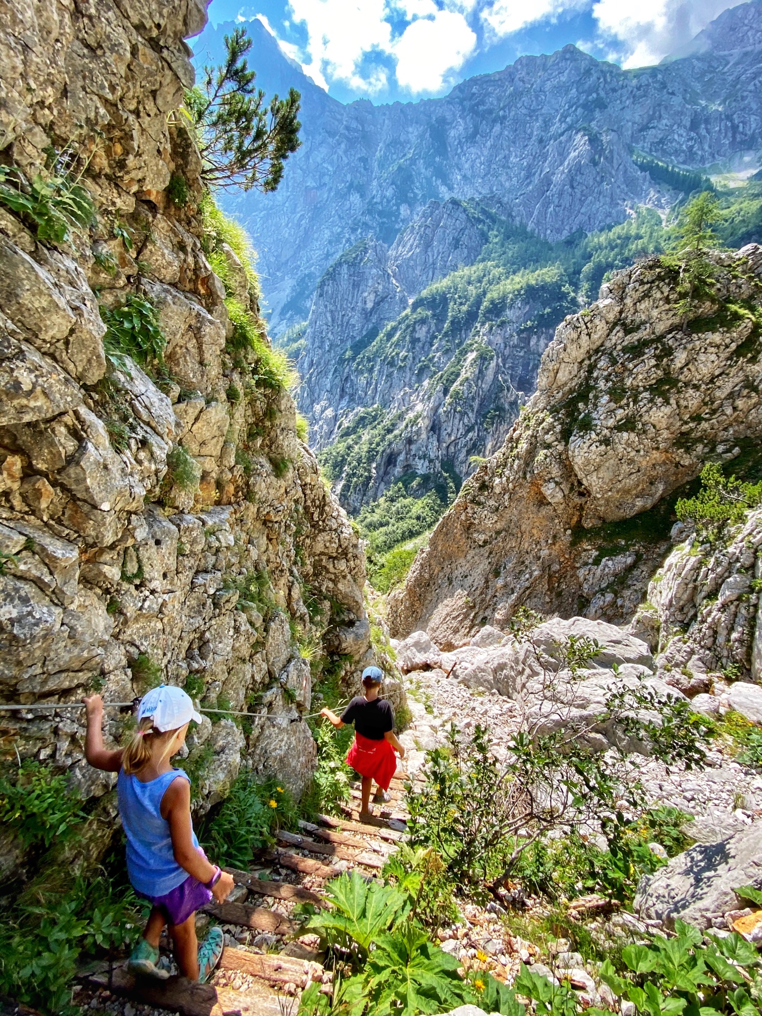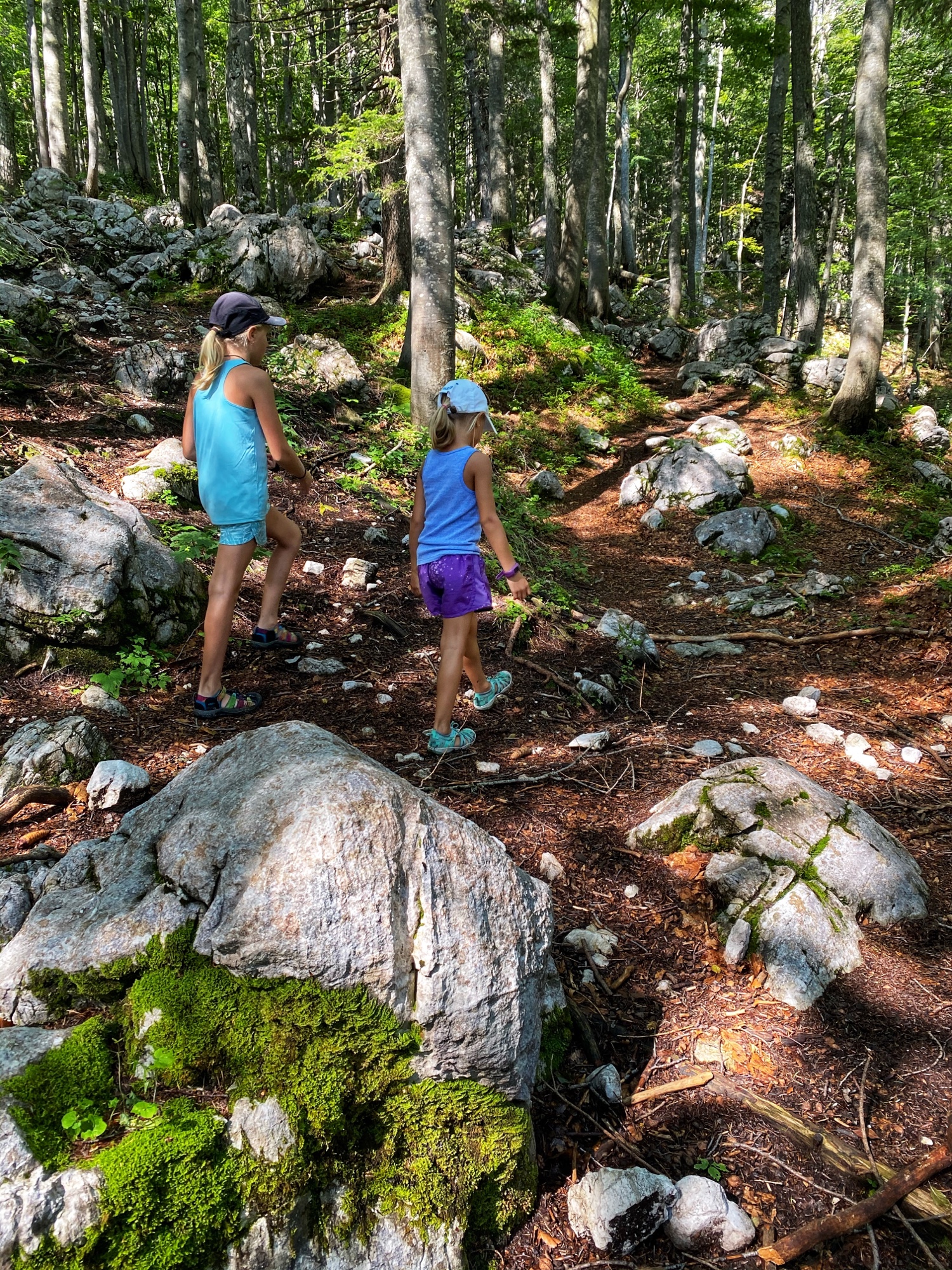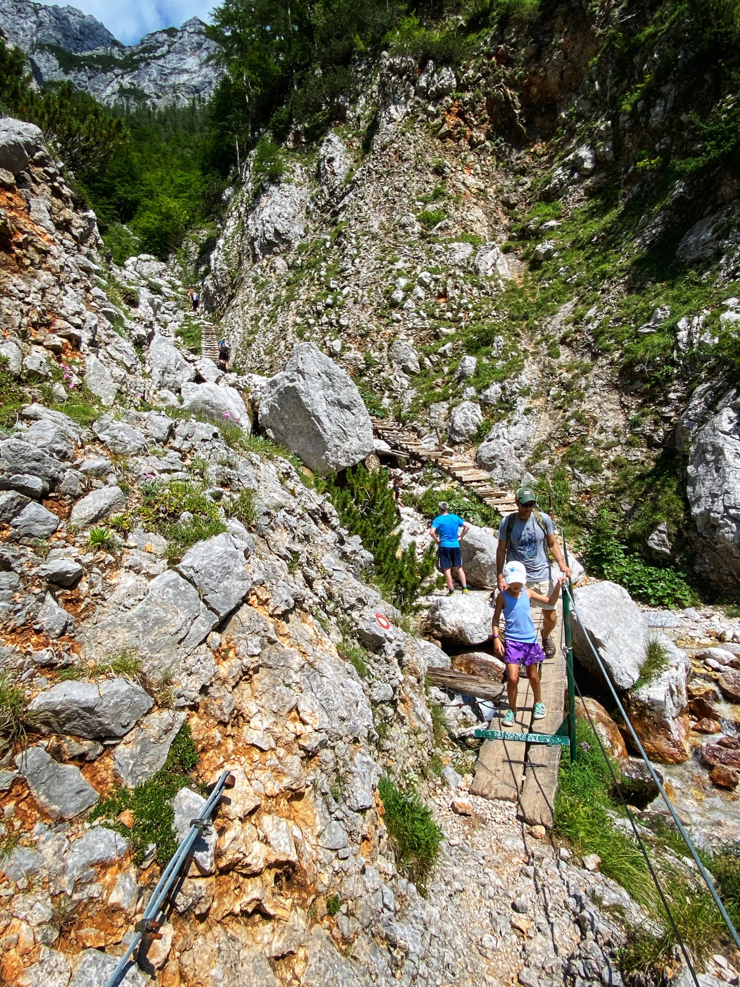 I’m not positive, but I think the point we decided to stop was this valley here. As we looked at the map, we realized it was going to take too long to get to our original destination at Kaminška saddle lodge, one of the most beautiful alpine valleys in Slovenia. With wobbly legs, we decided this was far enough. The kids were pretty spent at that point, and we still needed to hike down, so we played it safe. Maybe when they’re older we’ll make the all day trek to the top! Regardless, this was a really fun and positively gorgeous hike that we highly recommend! It took us almost 2 hours to get to the valley from the parking lot, but that includes time to stop at the waterfall and plenty of breaks as we climbed up the mountain to the valley rest stop.