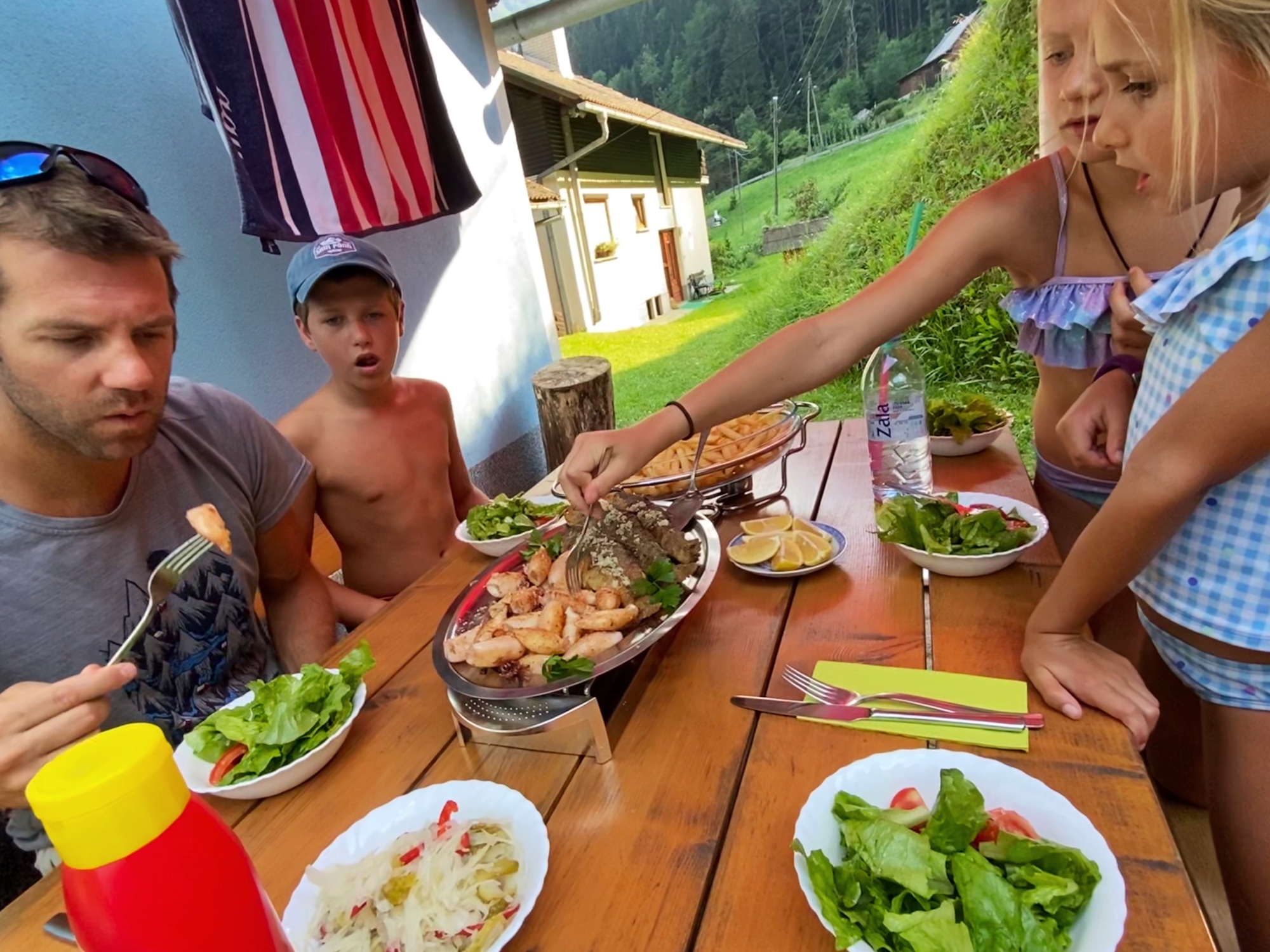 From there we headed back home for dinner. We were served the most beautiful homemade meal by our hosts in our backyard – greens from their garden, homemade pickles, fries and grilled fish and squid! Absolutely delicious! We loved our time in the Logar Valley!
