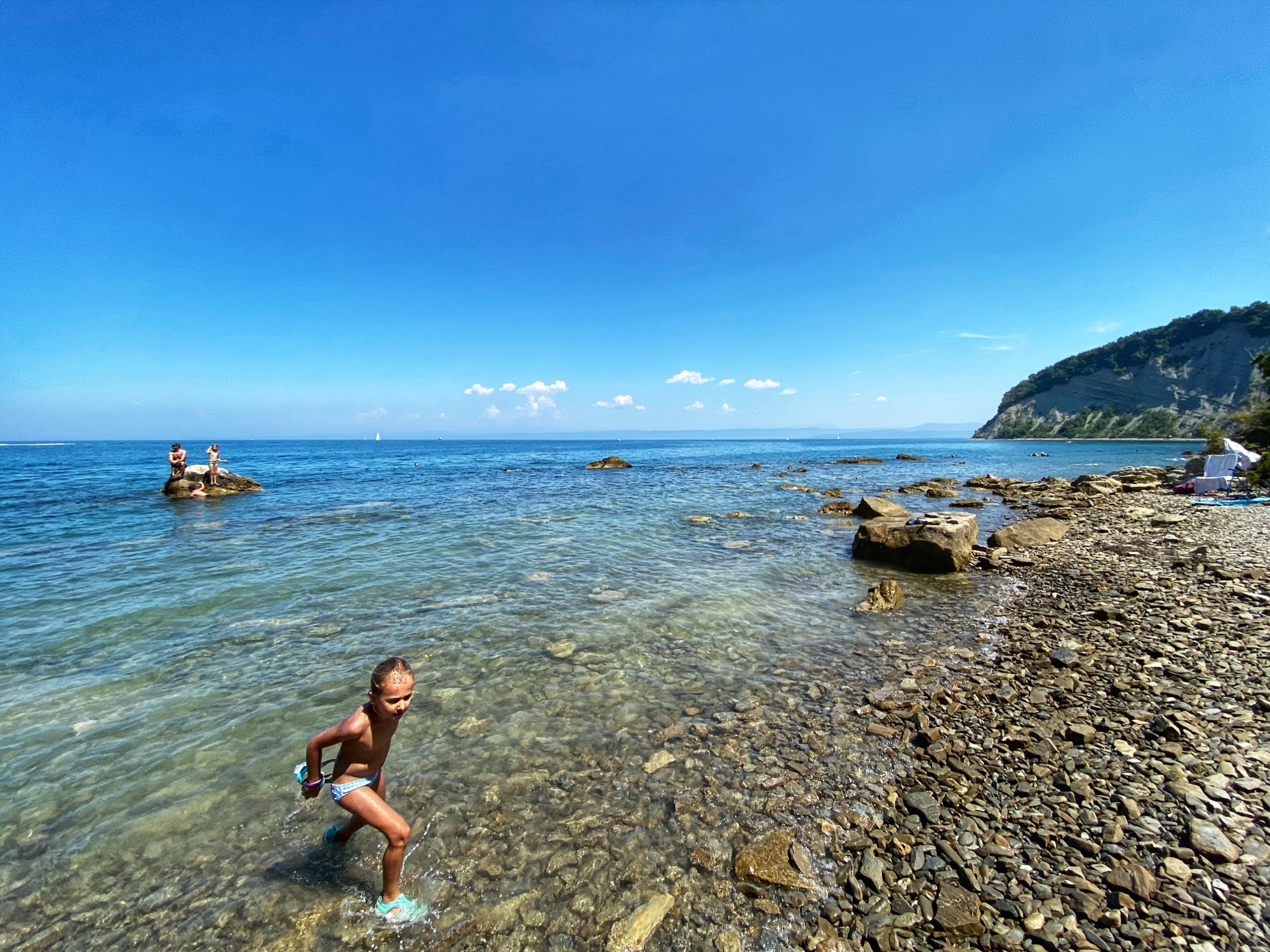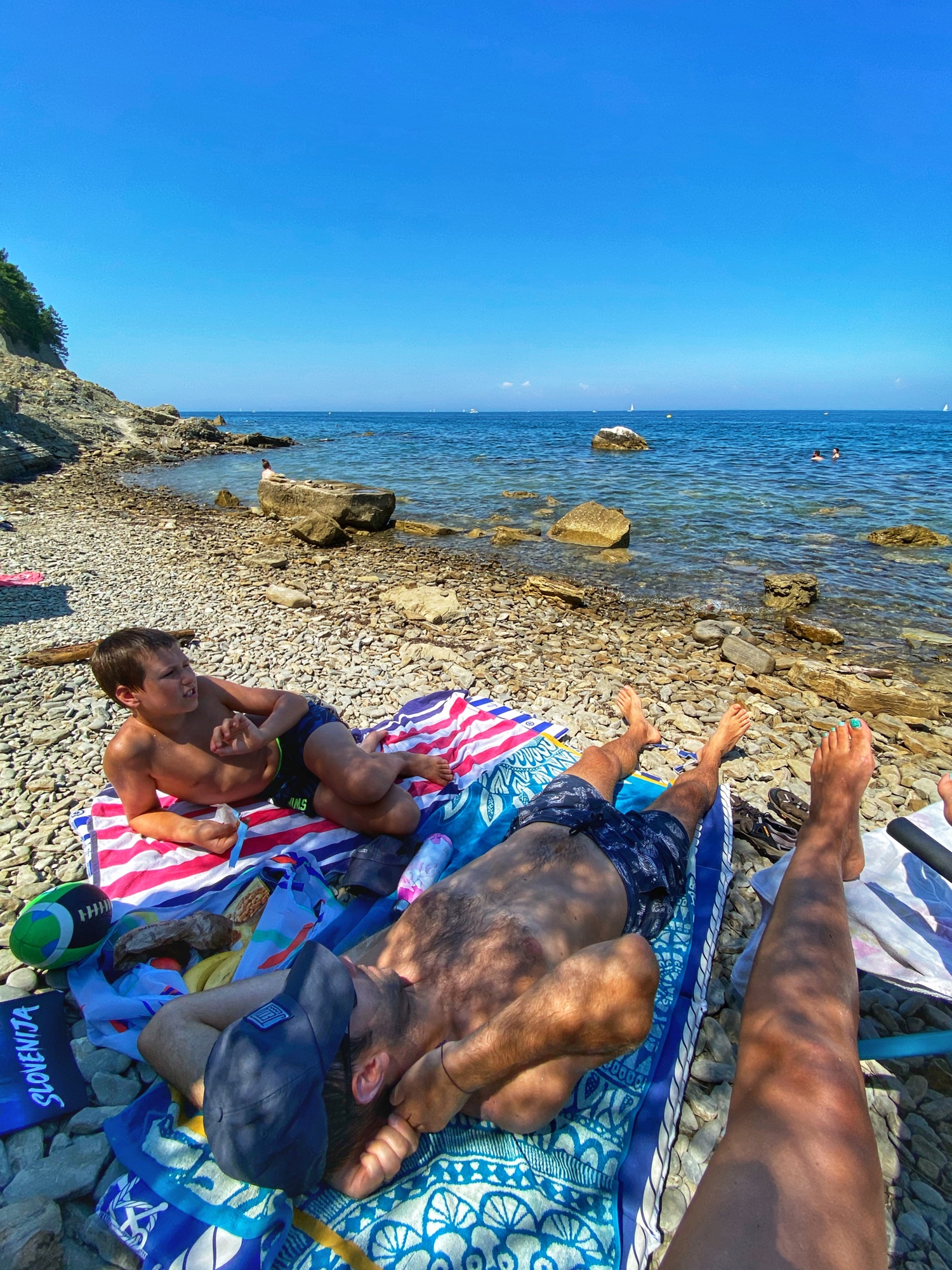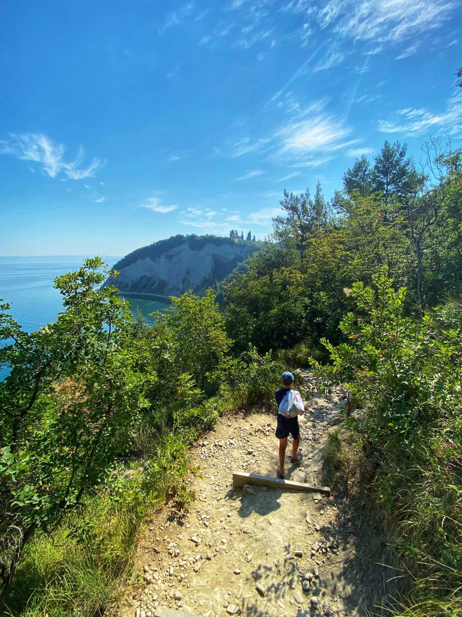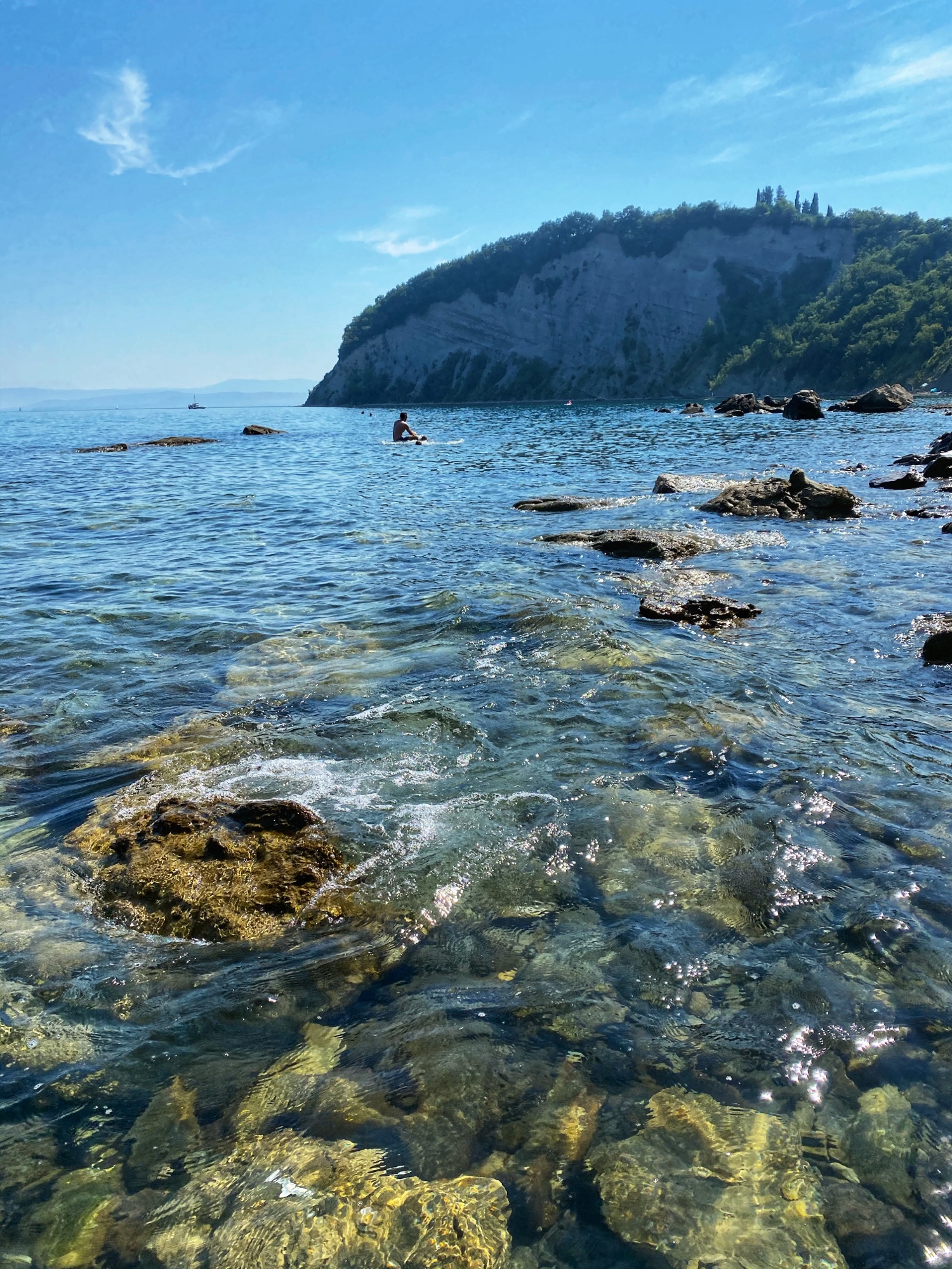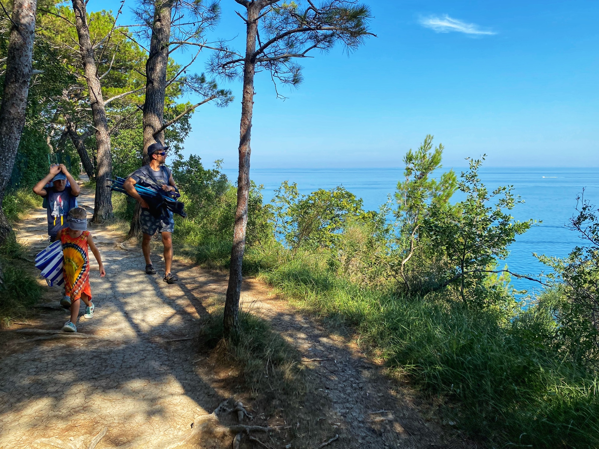 The next morning we thought we were getting an early start, but it turned out that even early birds on the Slovenian coast will have a hard time getting prime parking. (There isn’t much.) We found a lot at the entrance of Strunjan, and then walked for about 45 minutes along sidewalks, up steep roads, and then zigzagging down hiking paths until we reached the narrow crescent beach of Moon Bay. For more specifics on how to get there, read this.