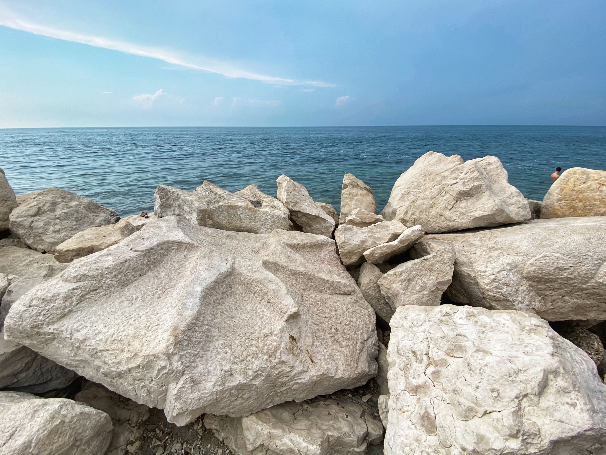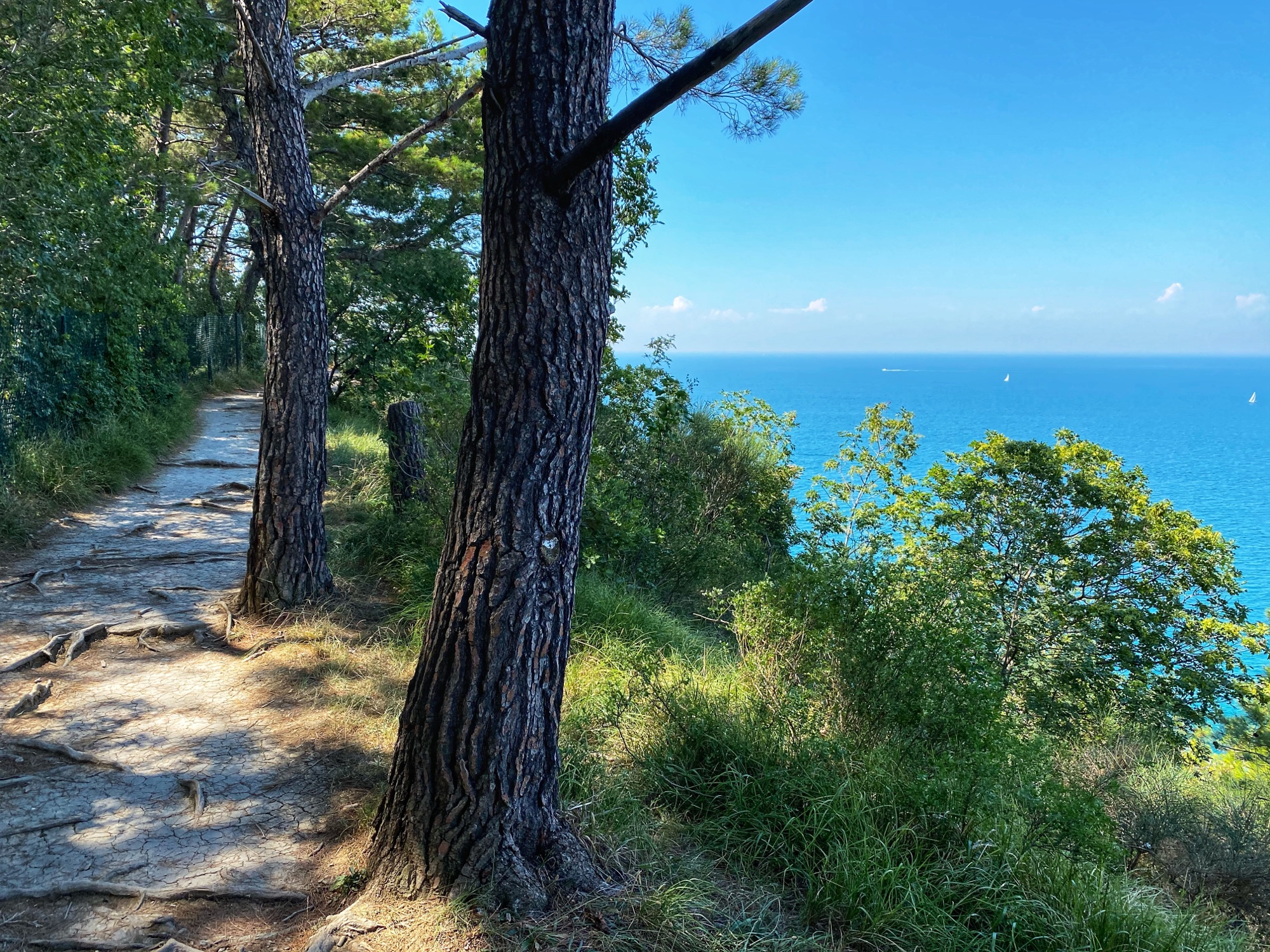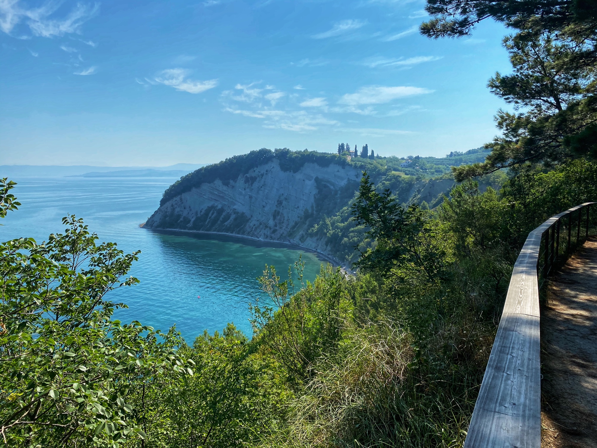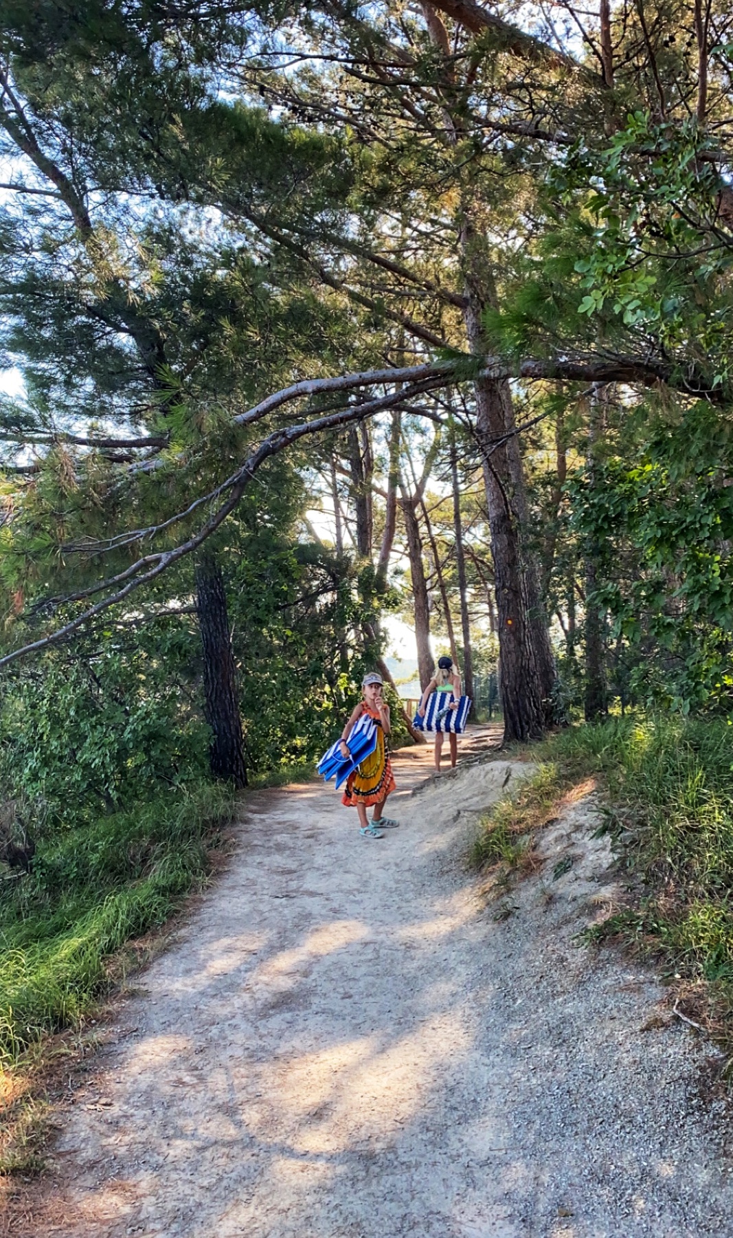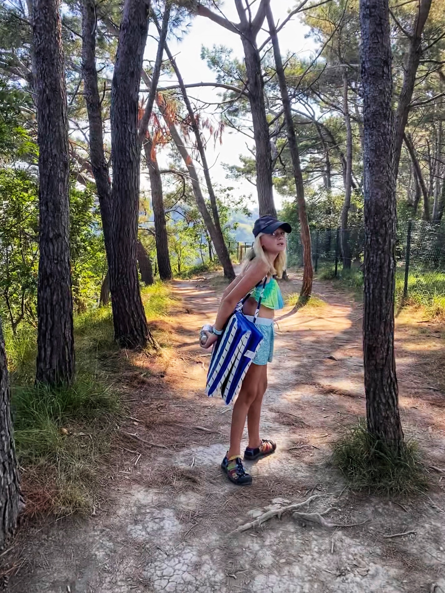 The next morning we thought we were getting an early start, but it turned out that even early birds on the Slovenian coast will have a hard time getting prime parking. (There isn’t much.) We found a lot at the entrance of Strunjan, and then walked for about 45 minutes along sidewalks, up steep roads, and then zigzagging down hiking paths until we reached the narrow crescent beach of Moon Bay. For more specifics on how to get there, read this.
