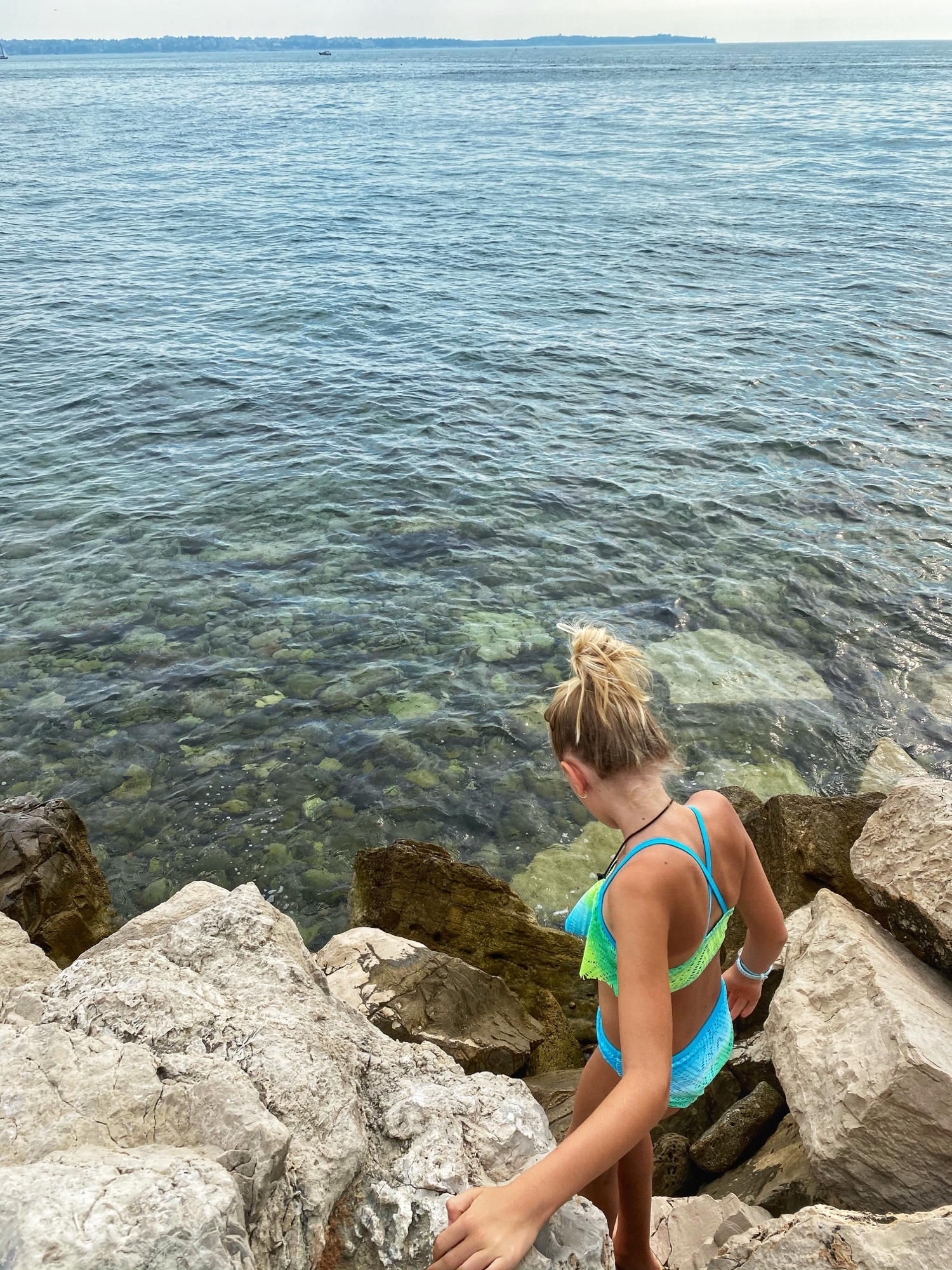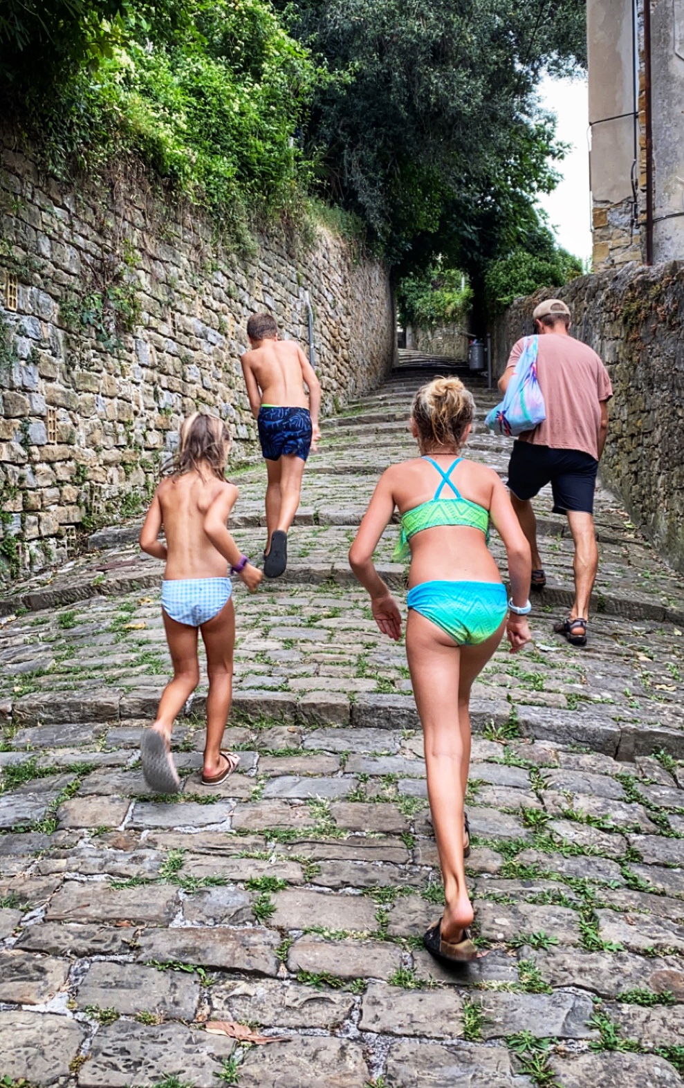 But we wanted to swim! So we followed suit. People were clustered all around the big Piran peninsula as far as the eyes could see. There were all kinds of sidewalk cafes and places to grab a drink, but I can’t imagine coming down and spending a whole day here. It’s good for a dip, but wouldn’t be especially comfortable or relaxing for more than that. Still, we had fun, and we were glad the rocks led down to fairly shallow waters that were great for the kids. We also saw a few mini jelly fish…