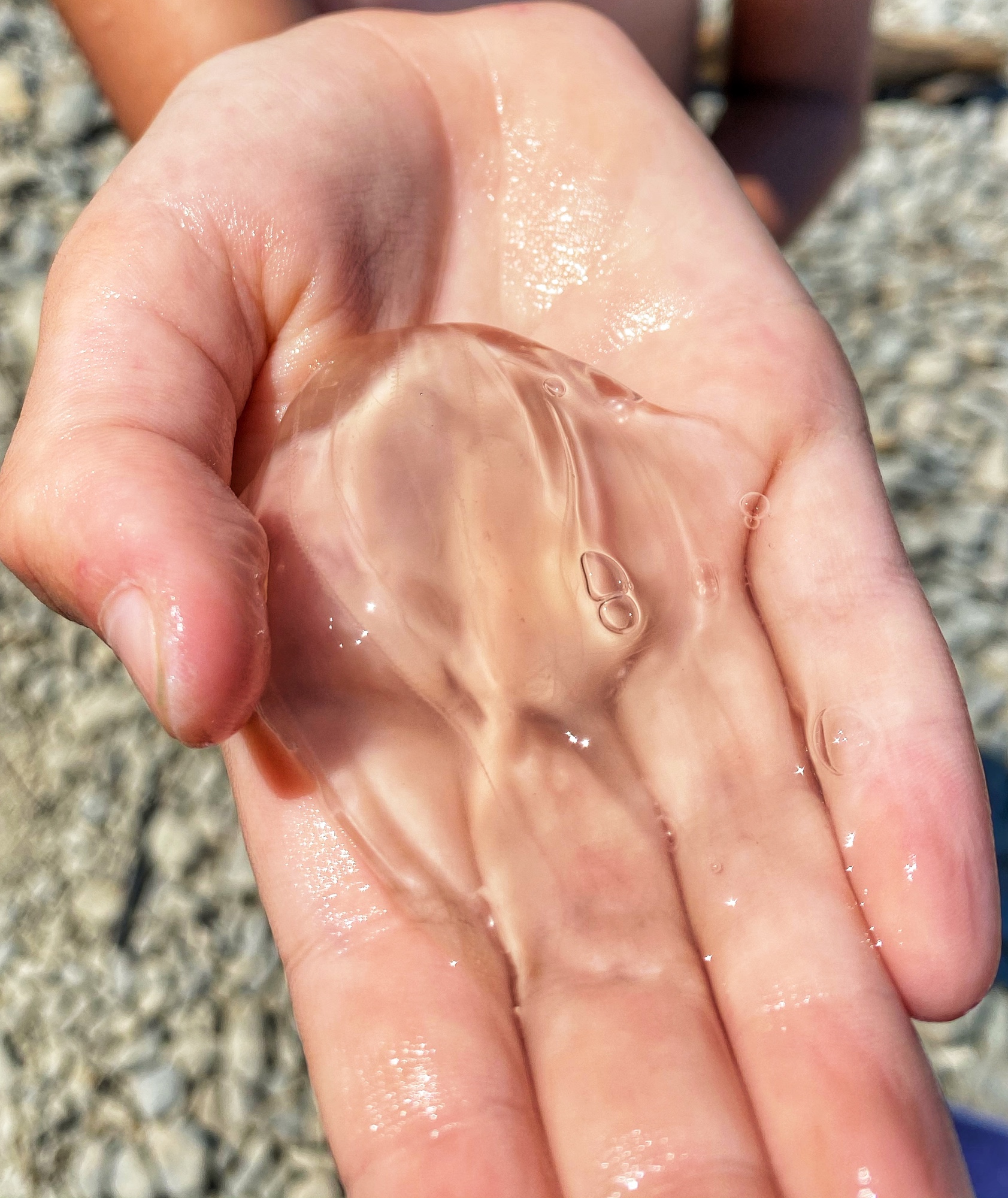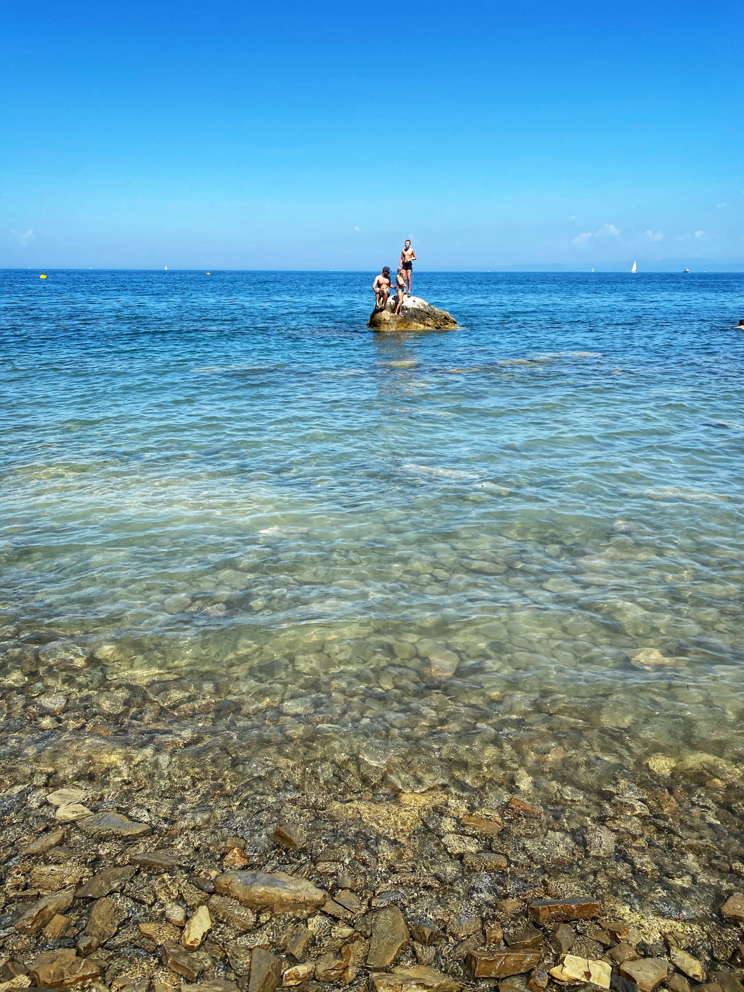 When we arrived, the beach already had lots of people on it! We walked around until we found a little area just for us, but it wasn’t easy, and there was always foot traffic back and forth past our spot throughout the day (occasionally even a nudist or two). The kids had a great time swimming, snorkeling, climbing on and jumping off rocks, and collecting tiny, jelly-like blobs called “salps” that were plentiful in the waters here.