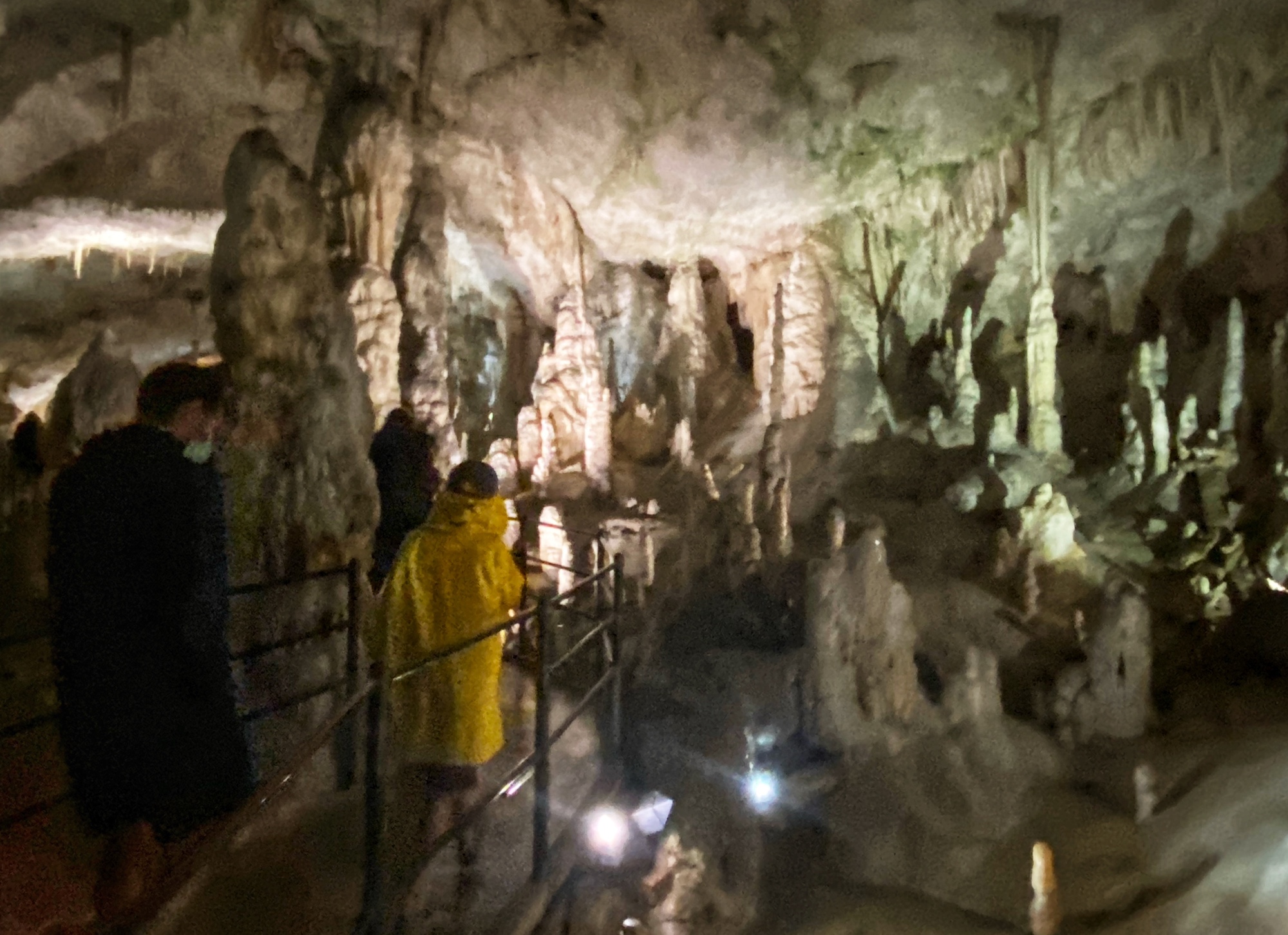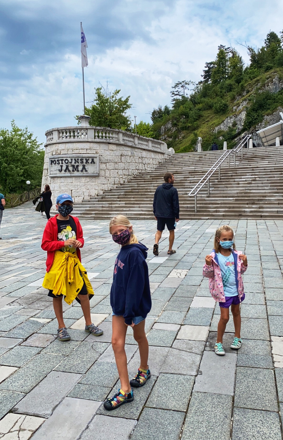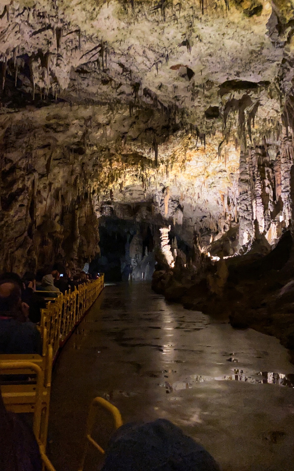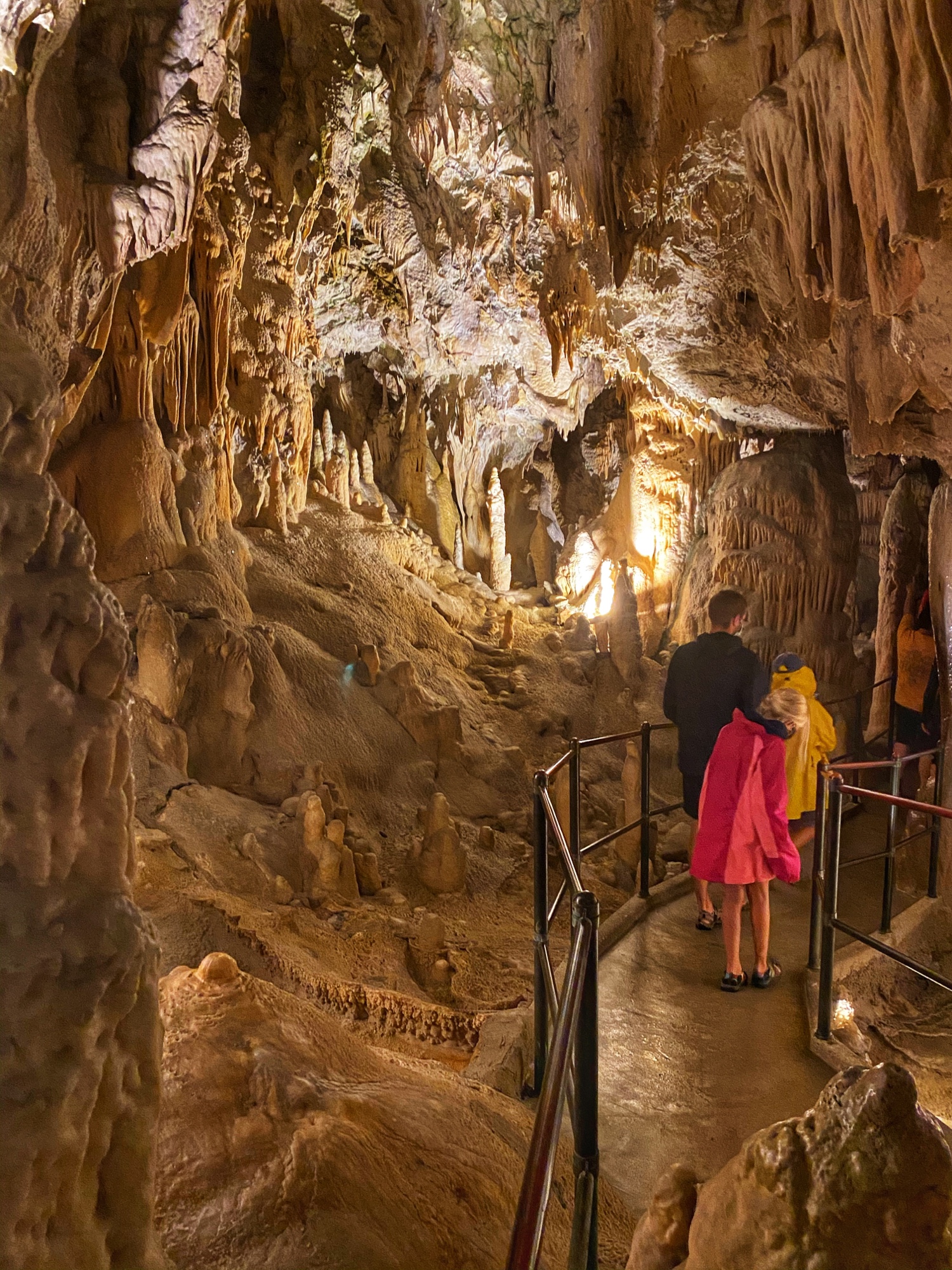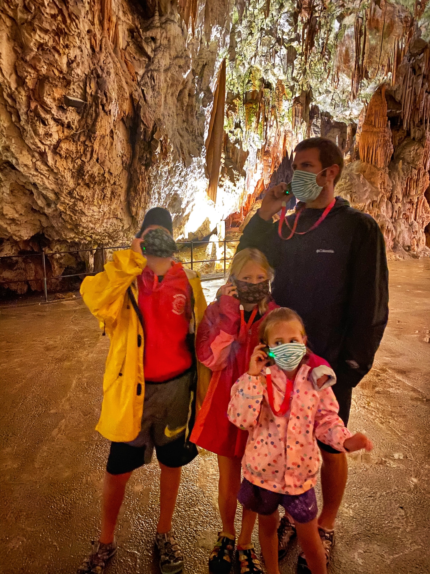 We had to wear our masks the entire time we were inside the caves, and since it is so cold and wet in there, we also were sure to pack sweatshirts and rain coats. We packed onto a train car and it took us on a ride for about 10 minutes deep into the cave. It dropped us off on a platform where we continued on a tour with our little audio guides – the kids loved it. The walking tour took a little over an hour, through incredible rooms displaying the full gamut of cave phenomena. We especially loved the spaghetti ceiling in the white room.