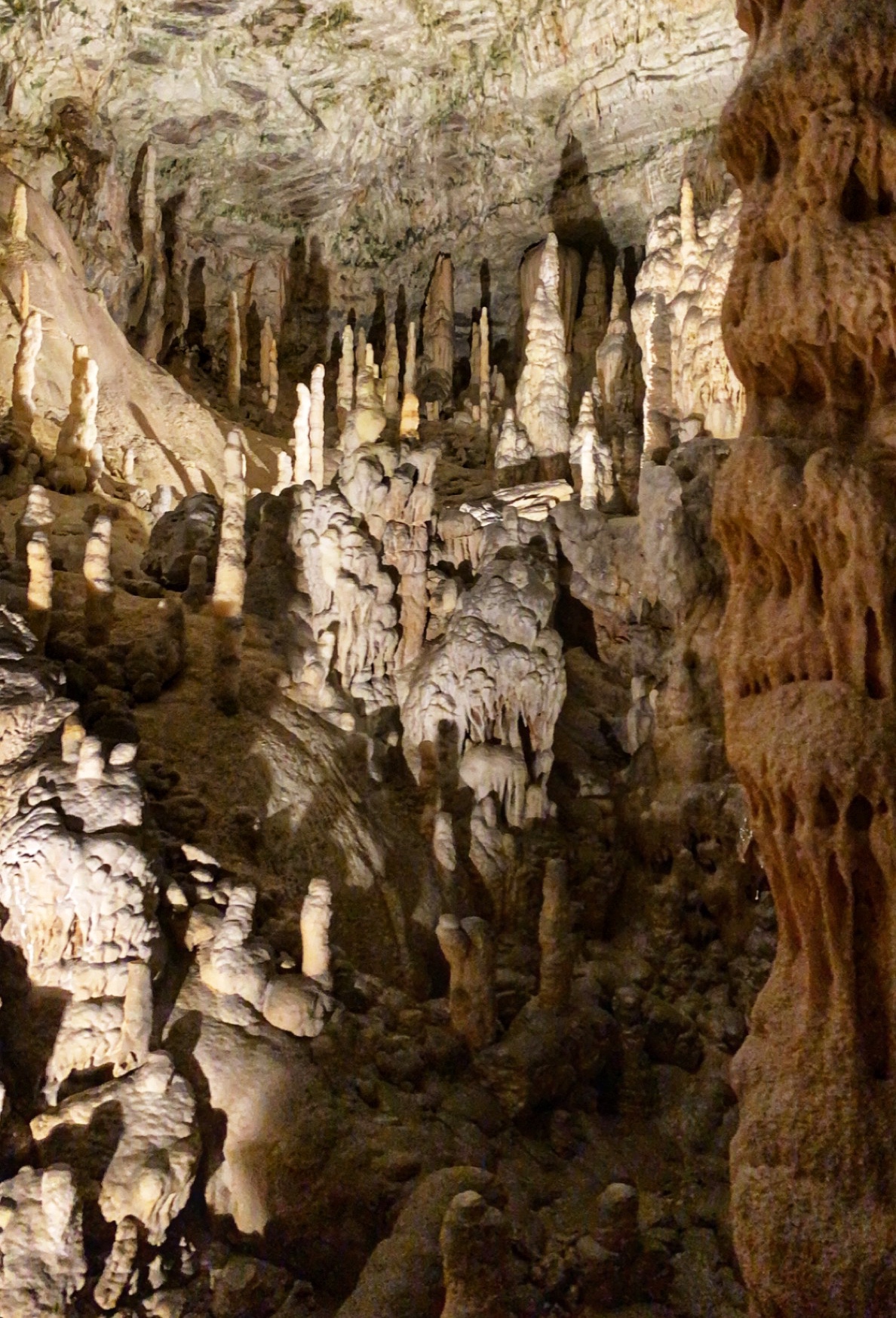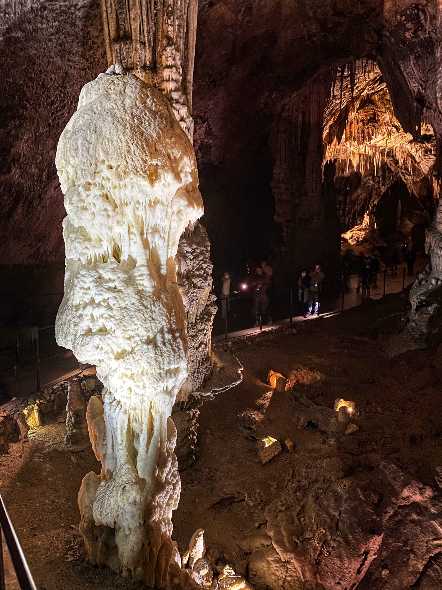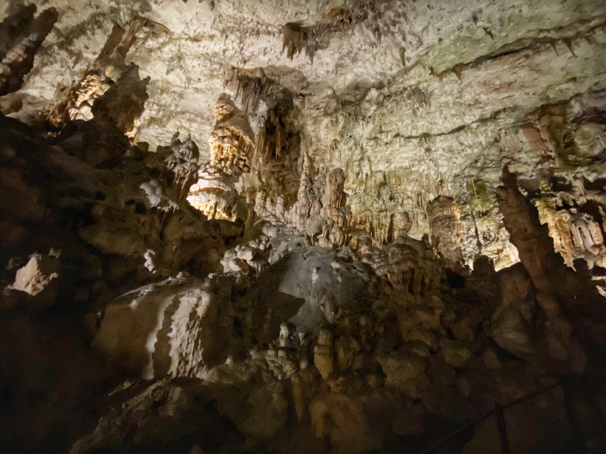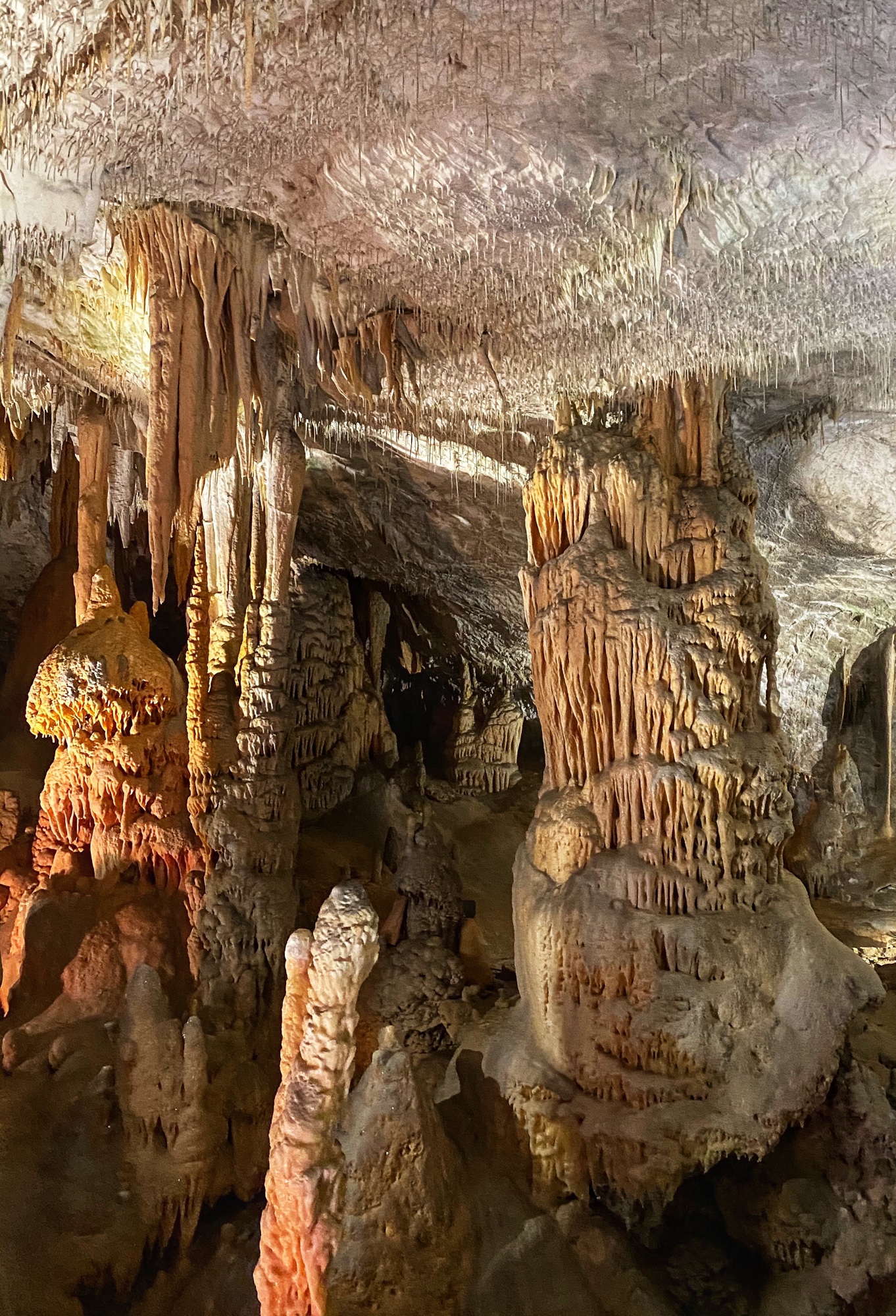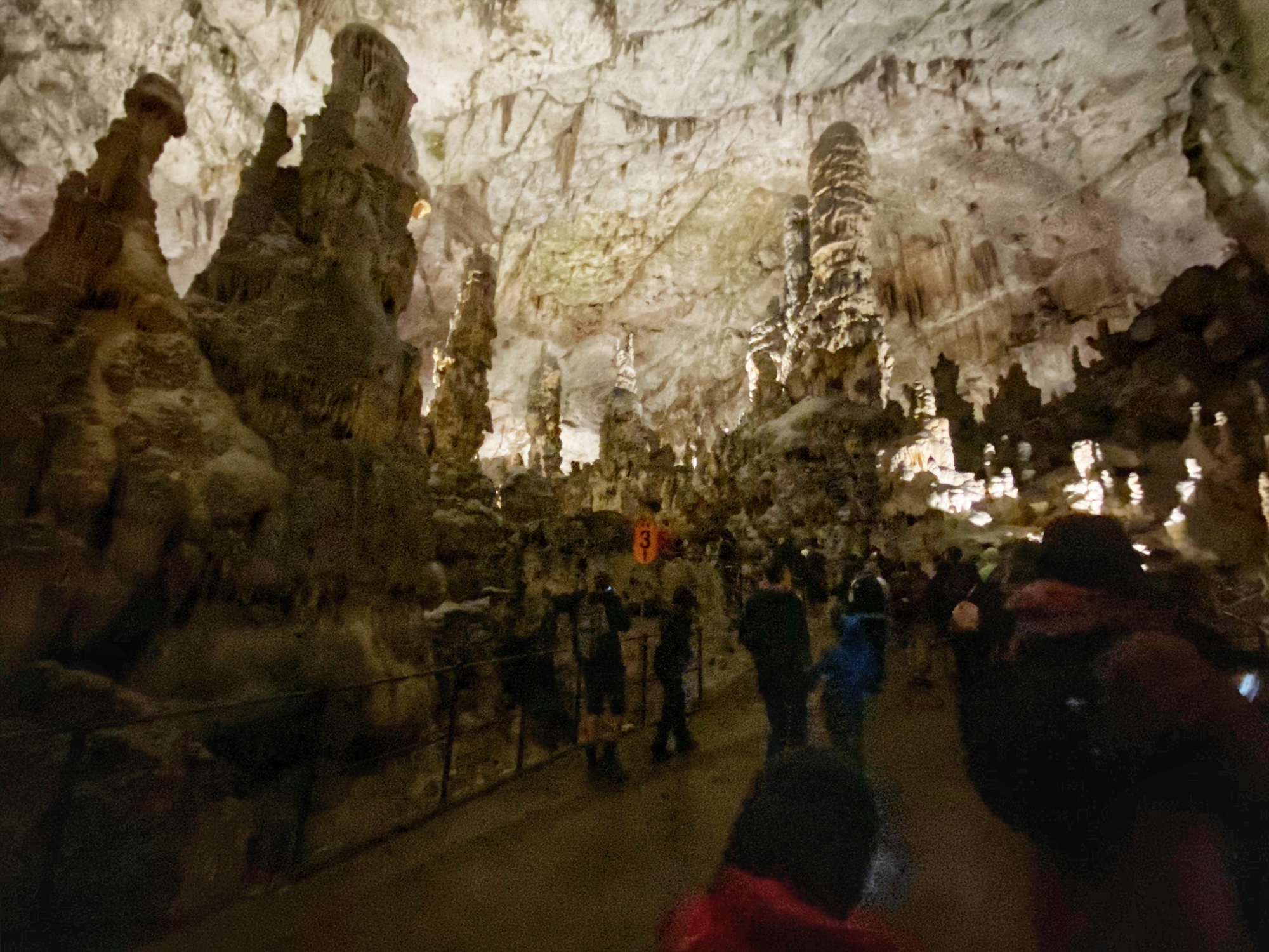 We had to wear our masks the entire time we were inside the caves, and since it is so cold and wet in there, we also were sure to pack sweatshirts and rain coats. We packed onto a train car and it took us on a ride for about 10 minutes deep into the cave. It dropped us off on a platform where we continued on a tour with our little audio guides – the kids loved it. The walking tour took a little over an hour, through incredible rooms displaying the full gamut of cave phenomena. We especially loved the spaghetti ceiling in the white room.