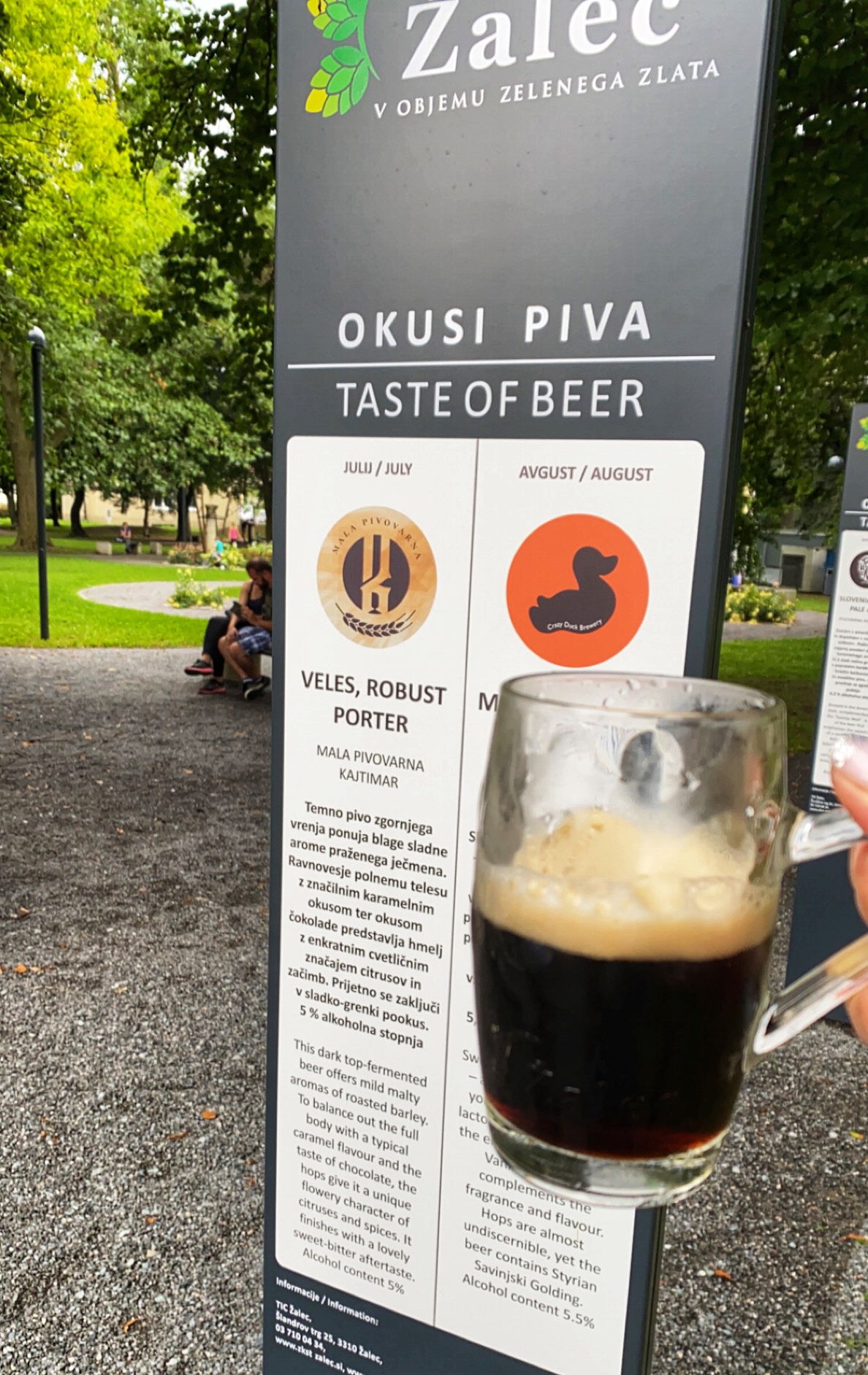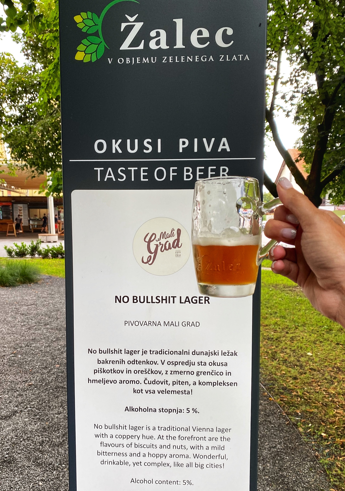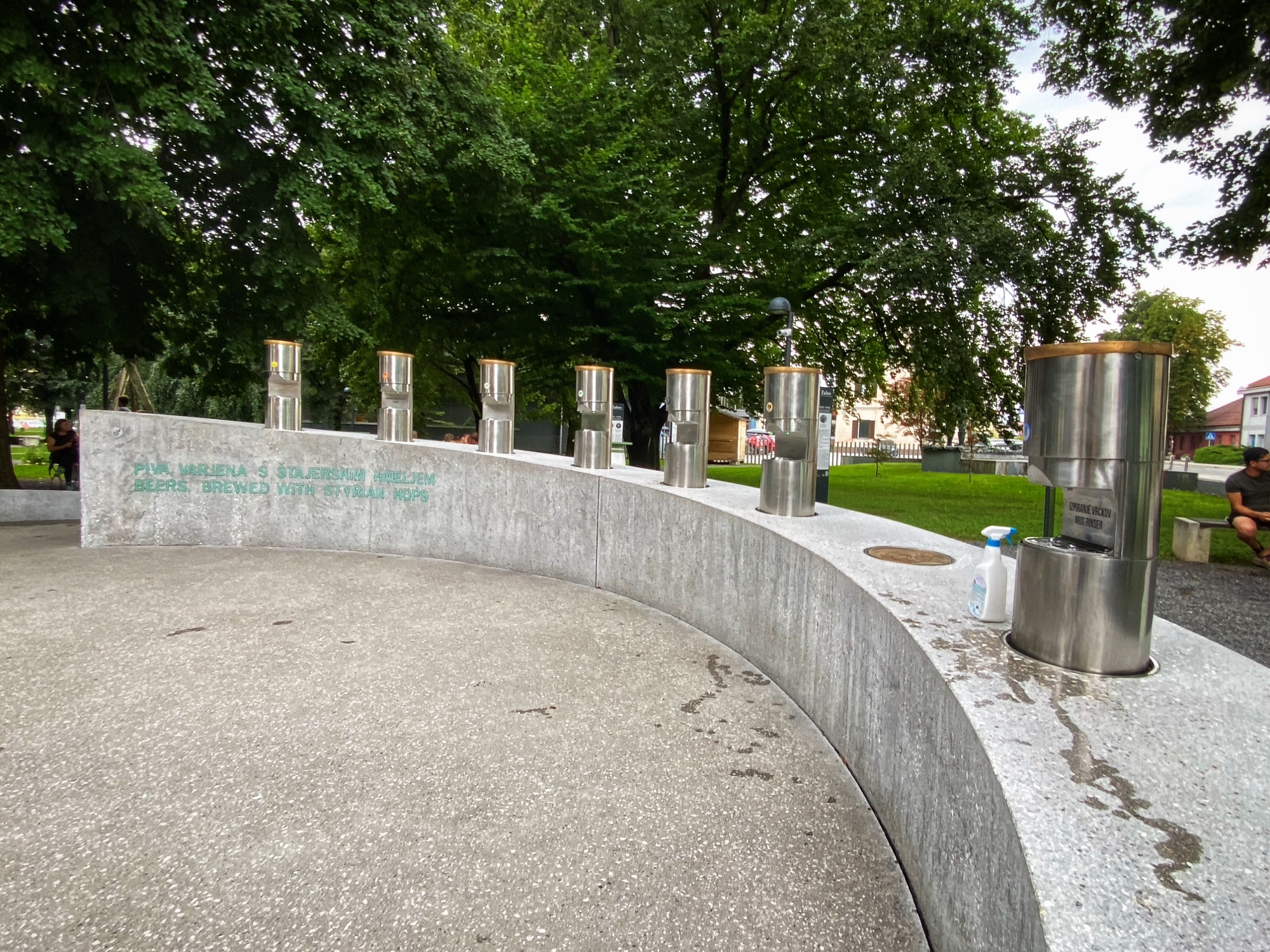 From Batič in the Western Slovenian Vipava wine region in Šempas, we drove a couple of hours back east towards Žalec, where Fontana’s unique “beer fountain” is located. We purchased our microchipped souvenir beer mugs and made our way to the very clever fountain area. You place your glass at one of the fountains and push the button and voila. A little spout pops down and dispenses a perfect 4 deciliter mug of beer. We tried all six and agreed the hemp beer (green, below) was better than we expected even though we both liked the Slovenian pale ale best!