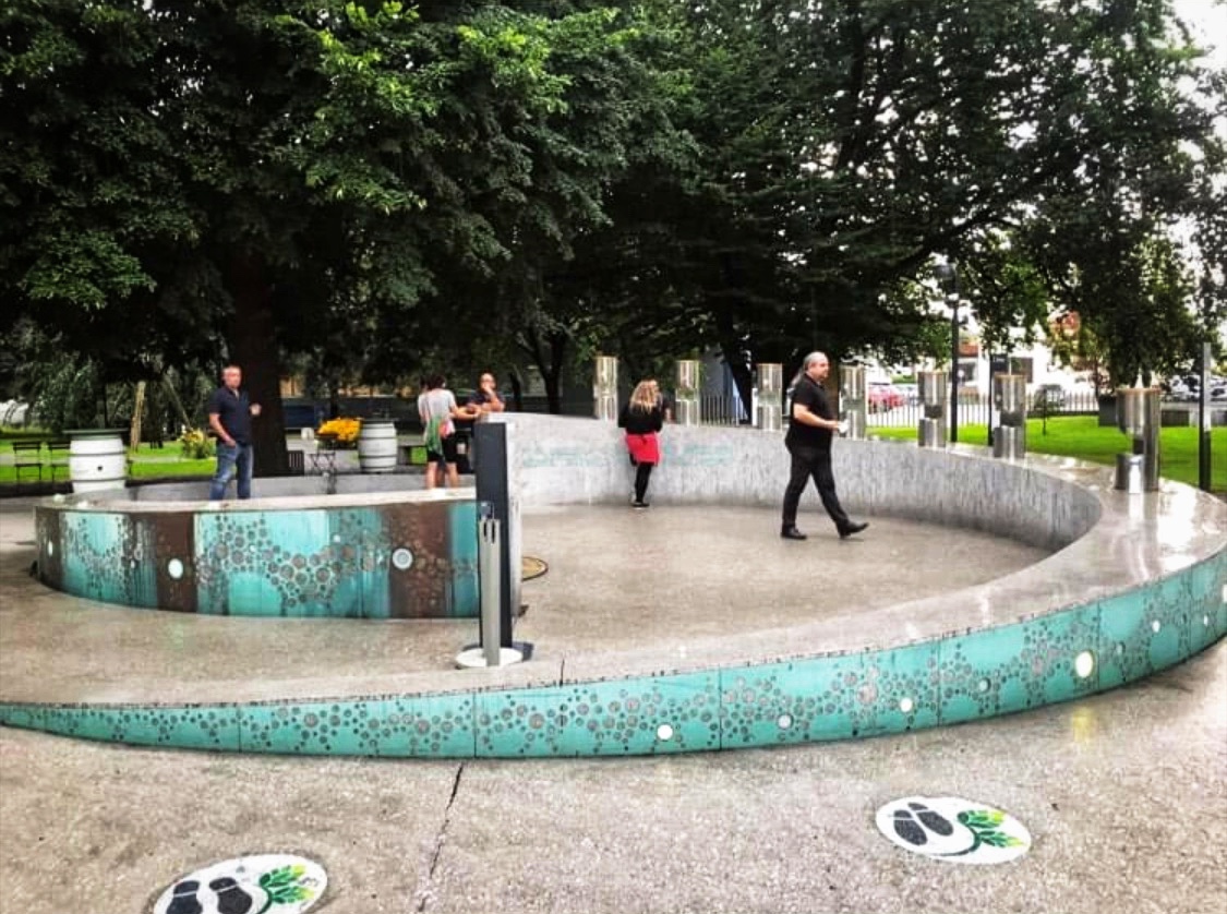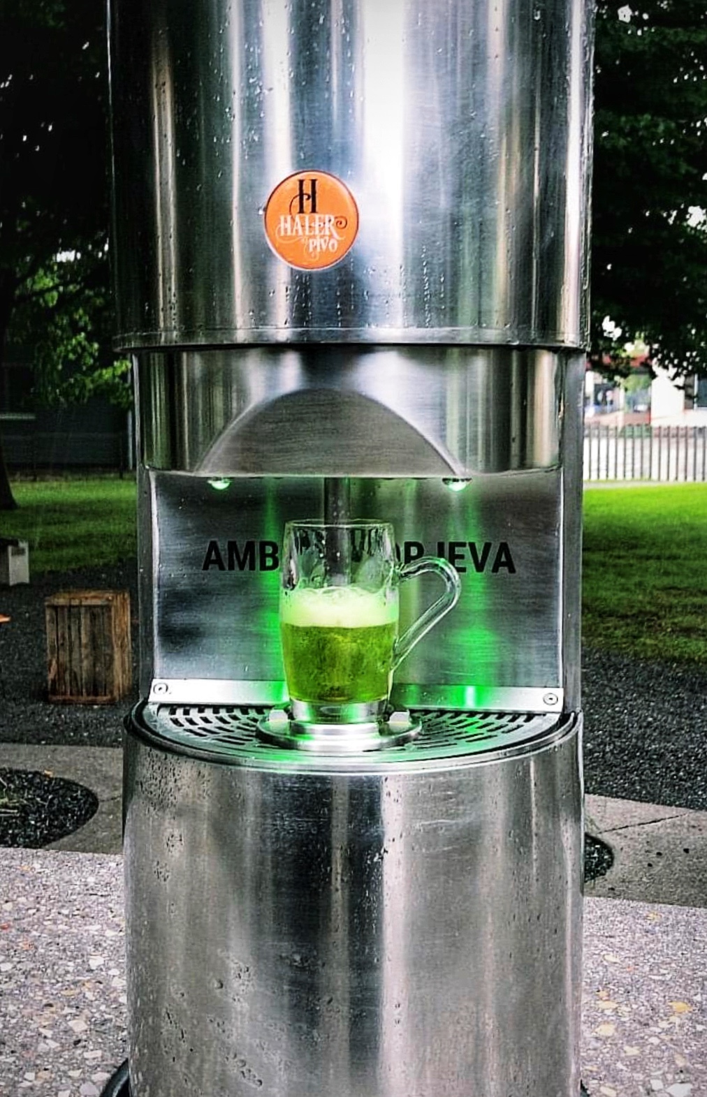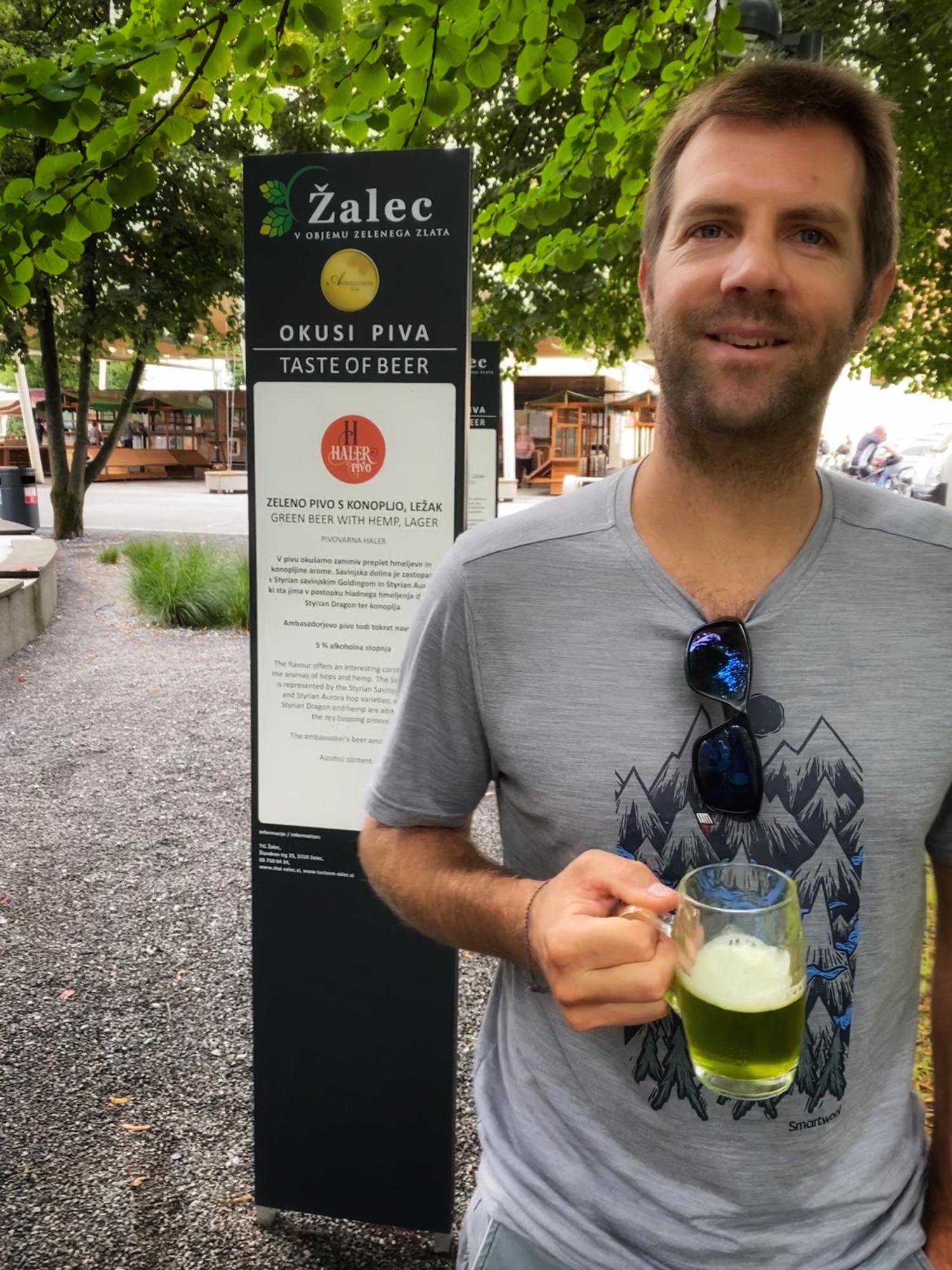 From Batič in the Western Slovenian Vipava wine region in Šempas, we drove a couple of hours back east towards Žalec, where Fontana’s unique “beer fountain” is located. We purchased our microchipped souvenir beer mugs and made our way to the very clever fountain area. You place your glass at one of the fountains and push the button and voila. A little spout pops down and dispenses a perfect 4 deciliter mug of beer. We tried all six and agreed the hemp beer (green, below) was better than we expected even though we both liked the Slovenian pale ale best!