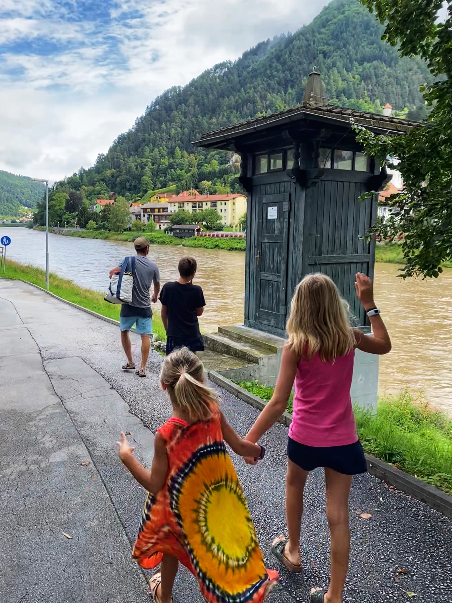 After we left the park with our pizza and burrek from the bakery for lunch, we headed back to the hotel just in time for a huge thunder clapper. Later on we wanted to go out to dinner, but we had to brave the weather to do so. We drove along the river towards Celje and watched the waters rise, culverts overflowing. The kids were amazed.