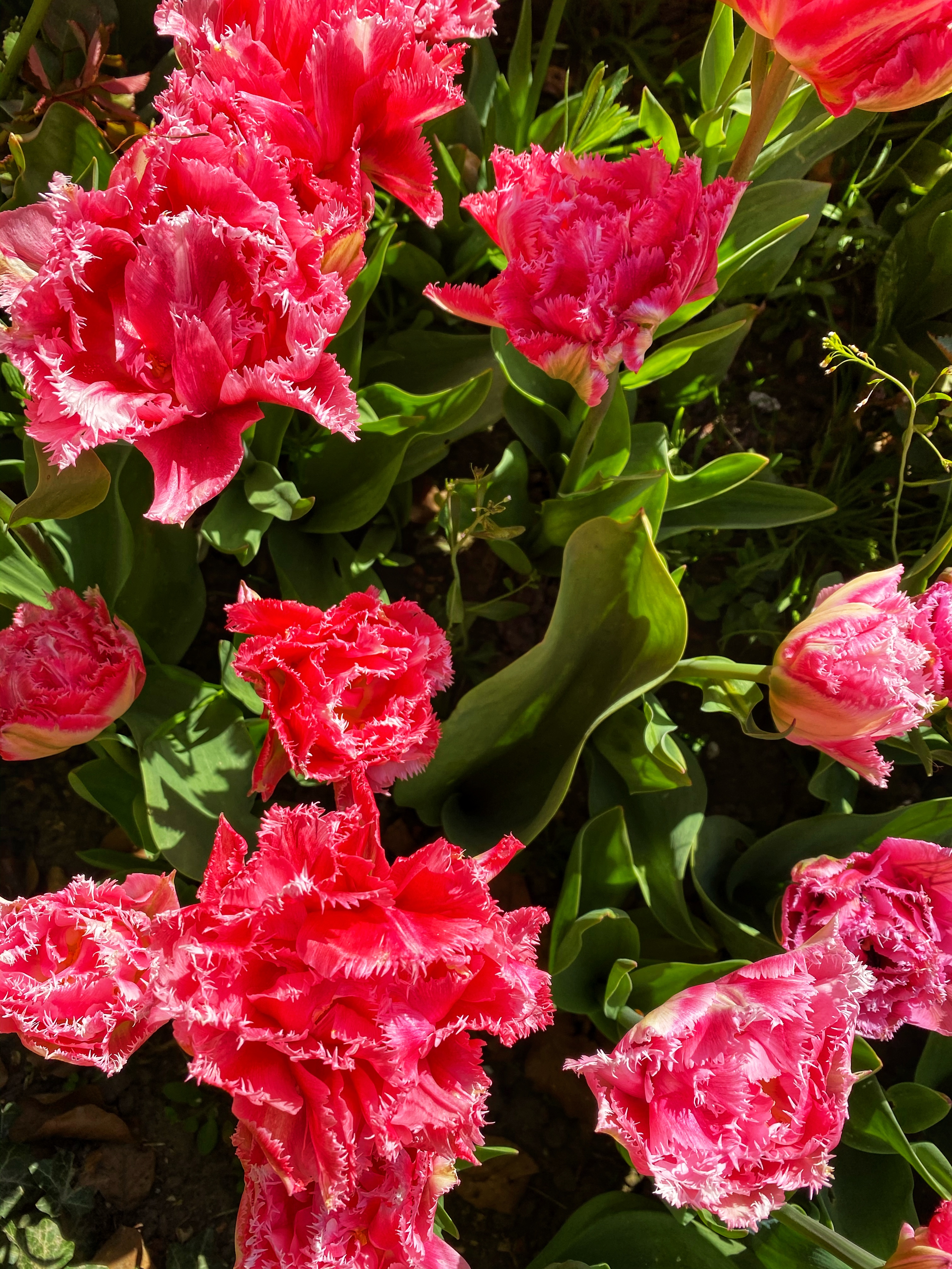 The courtyard has an impressive variety of tulips including several we have never seen before! The purple ones below were pointy at the top (Kaufmanniana tulips), and the pinkish red ones looked like ruffles (Fringe tullips)! There were also Double tulips that remind me of peonies, and enormous flowers the size of my palms!
