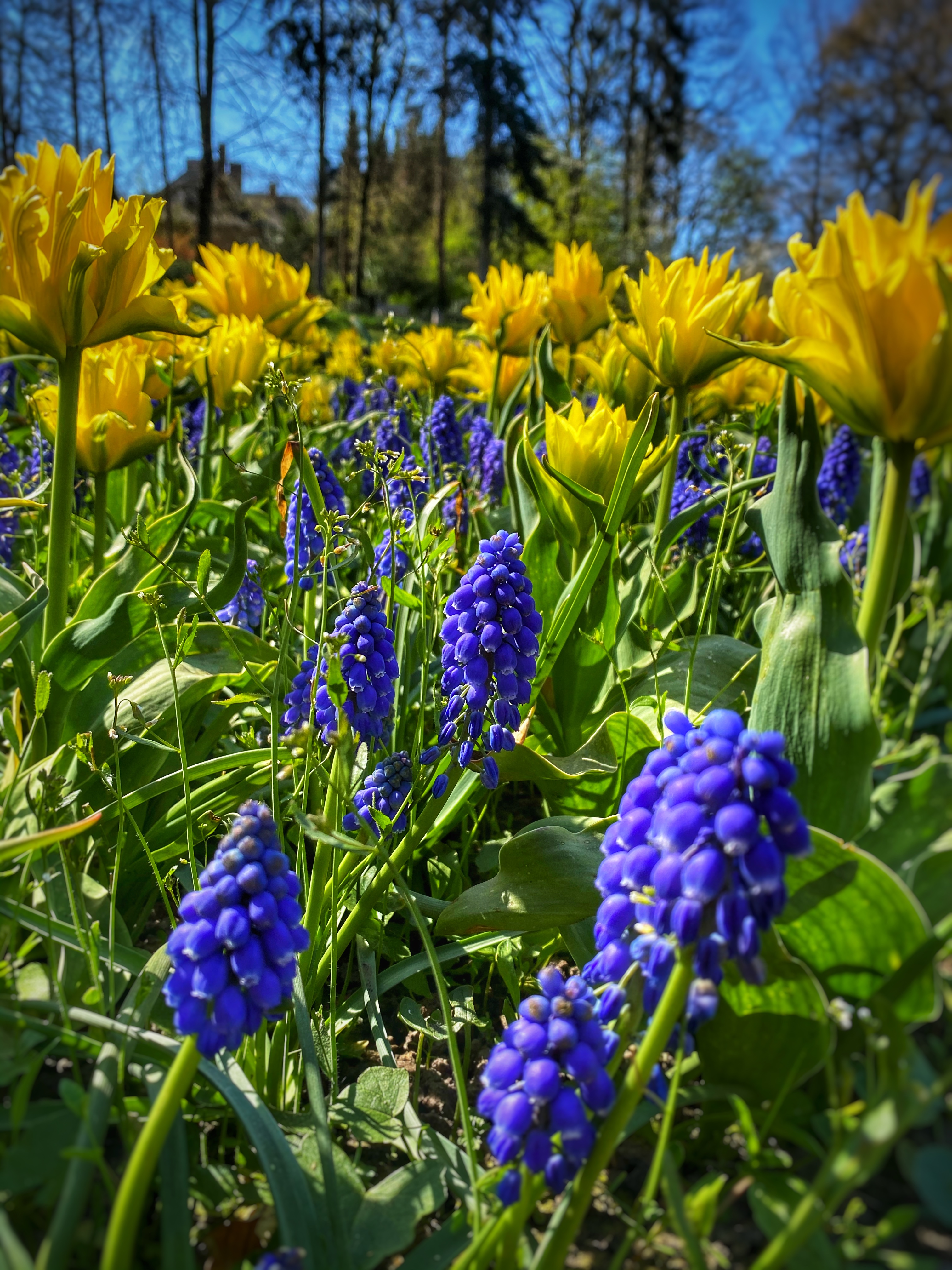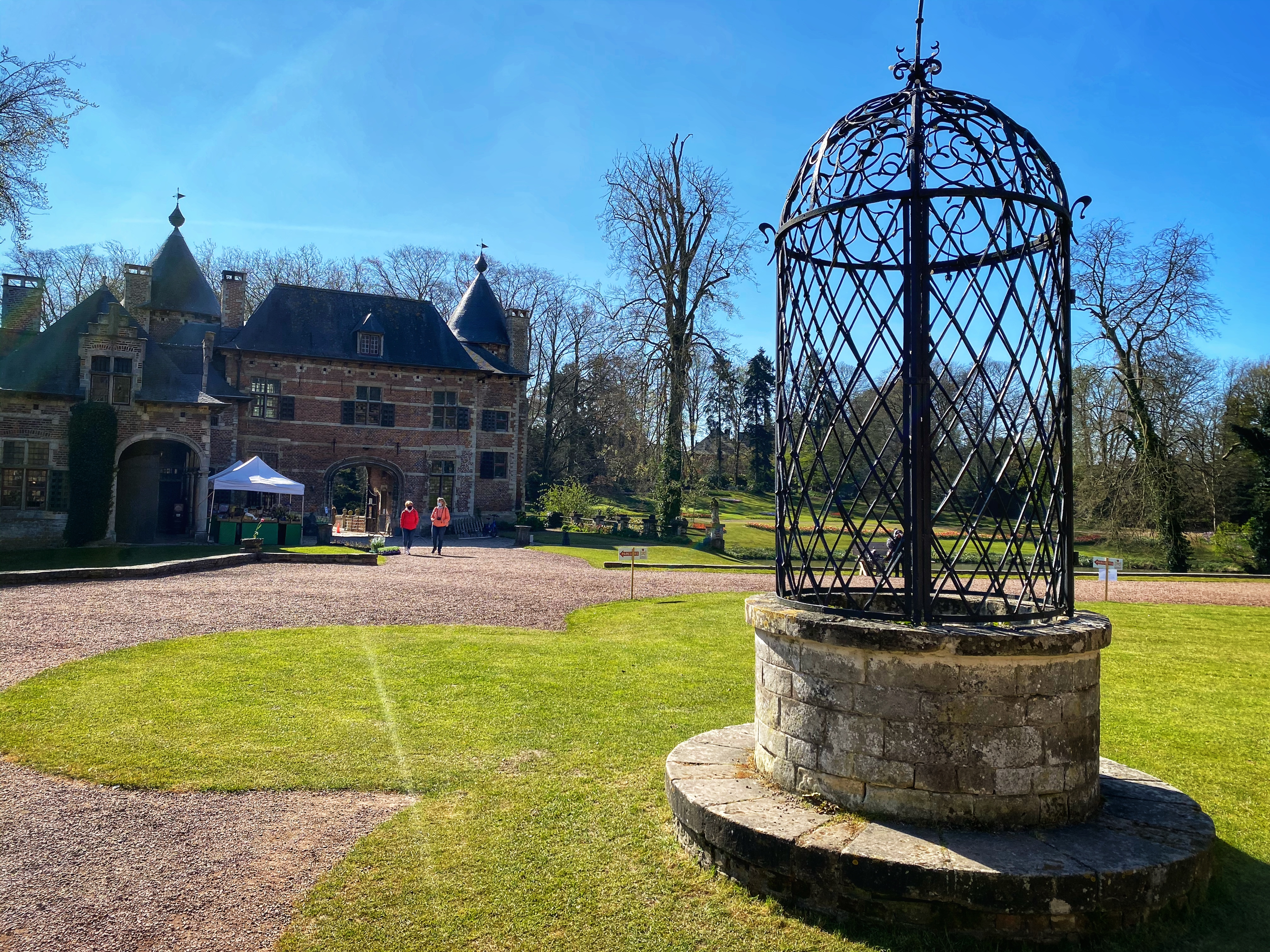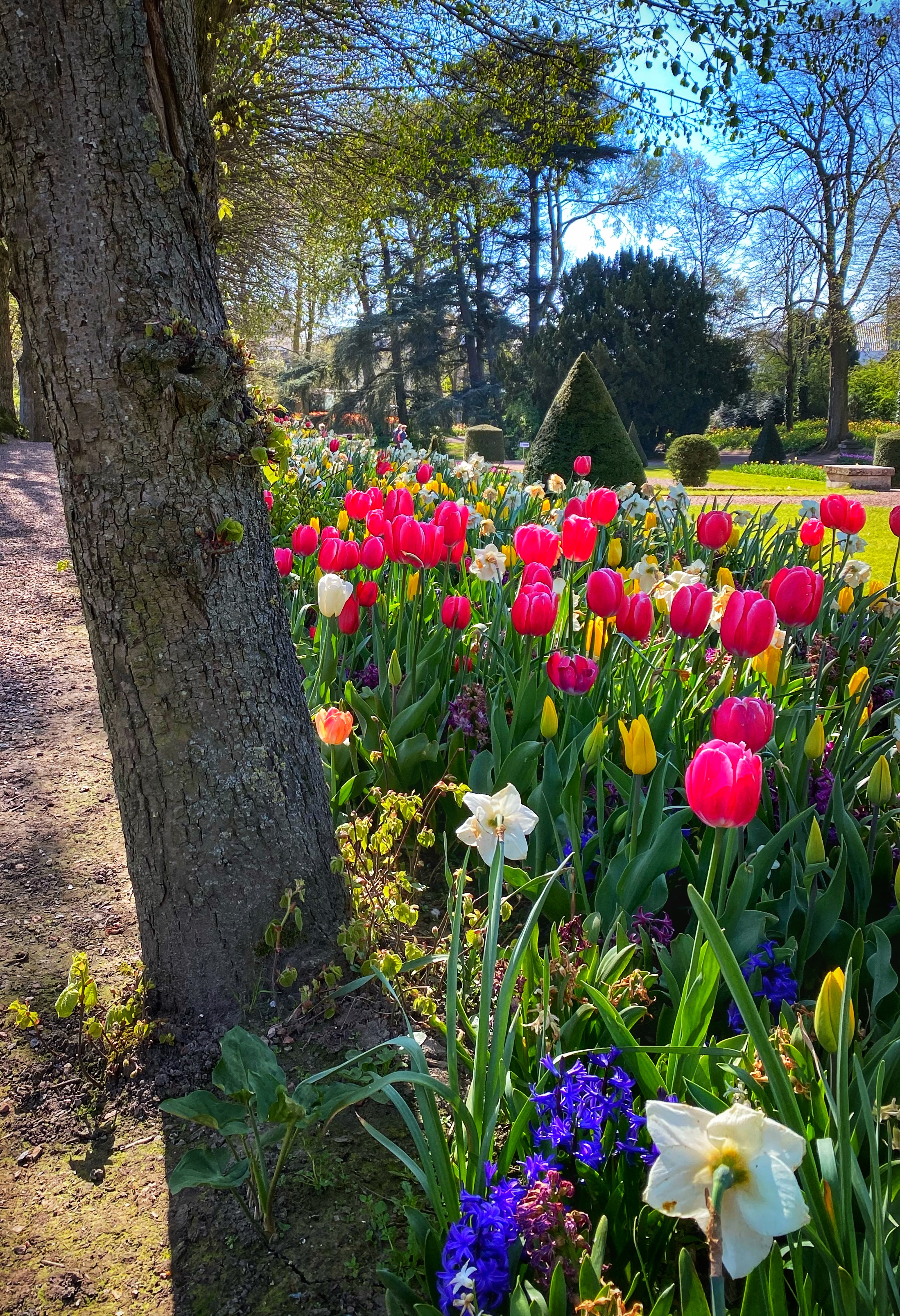 Past the huge Donjon tower and crossing the creek bridge s a garden that feels like you’re taking a walk through the forest. The trees are so tall, and the tulips were in full bloom!