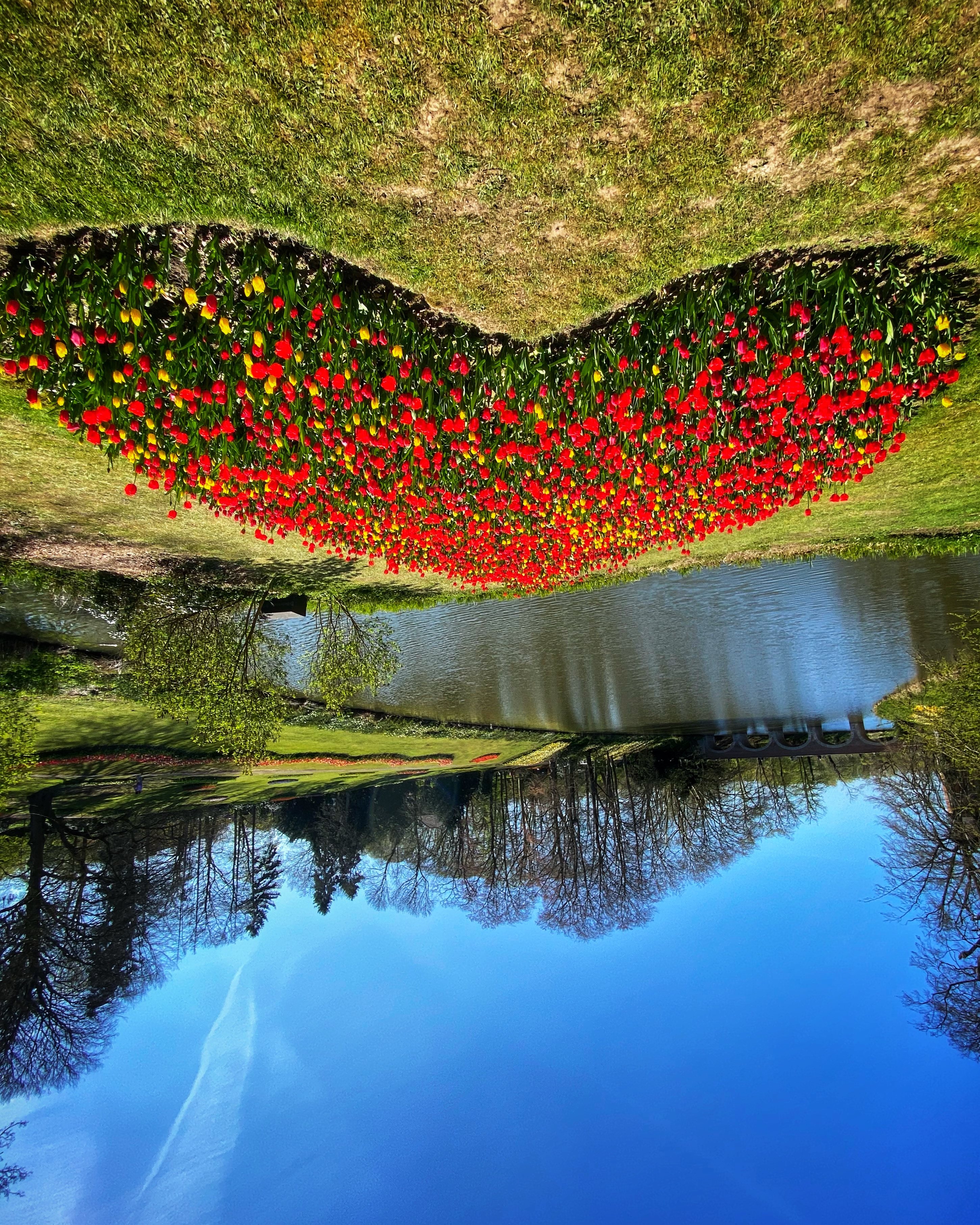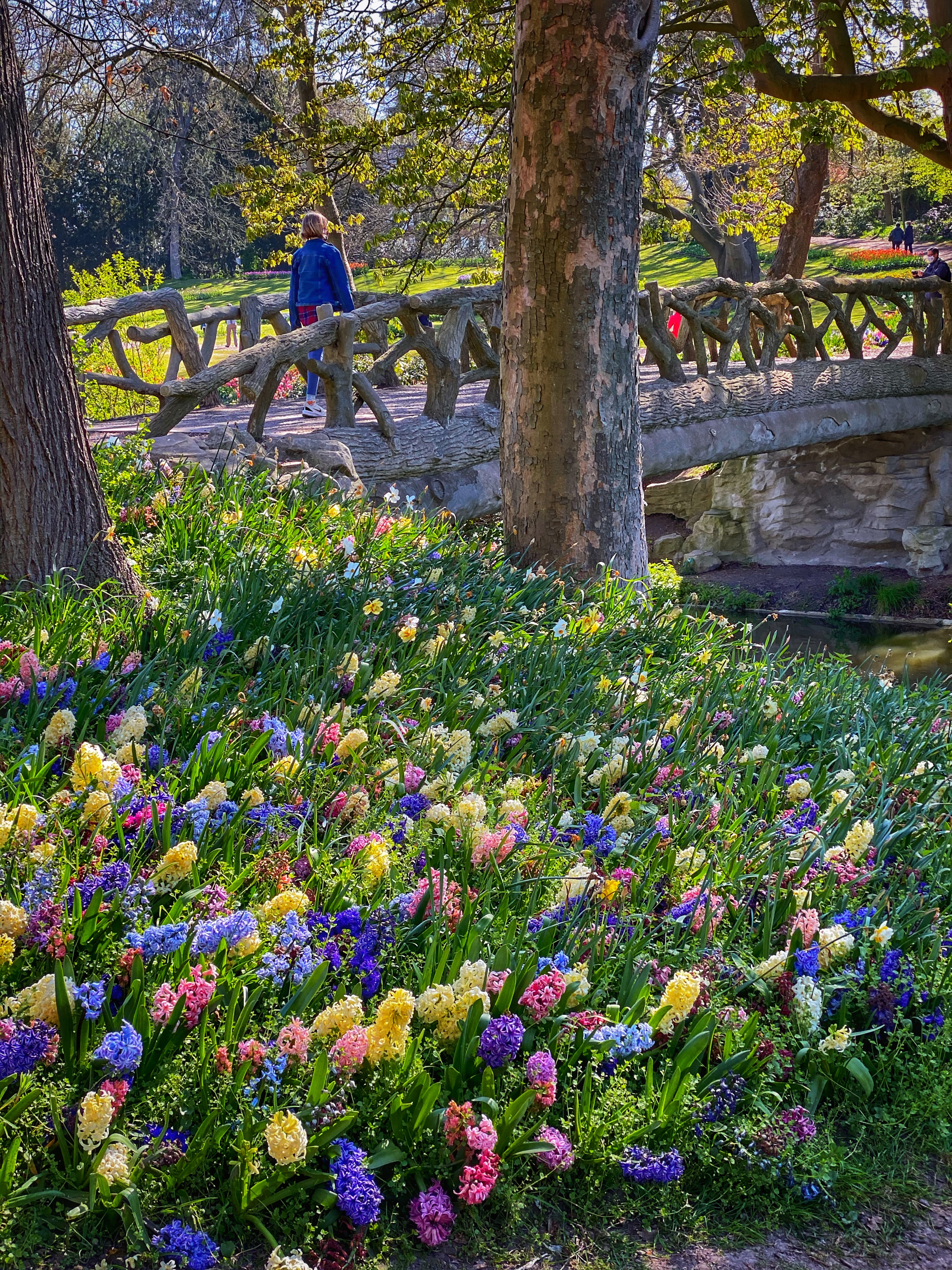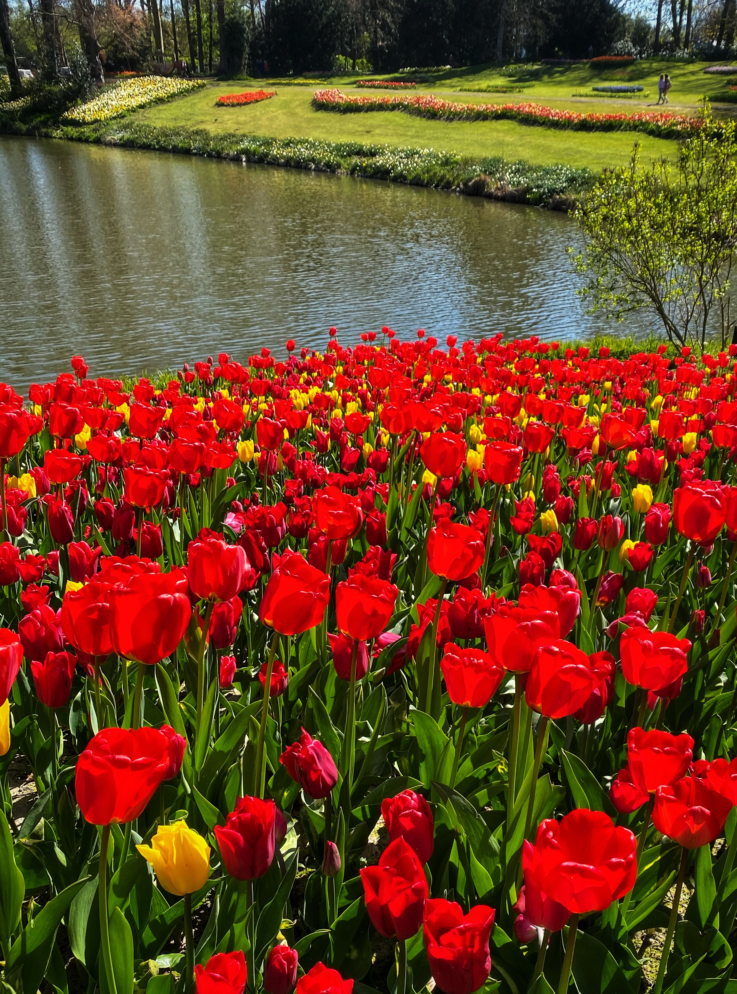 After the garden and paths there was another big area with tulips before reaching the small waterfall and bridge that takes you along the moat with a gentle hill, also covered in tulips.