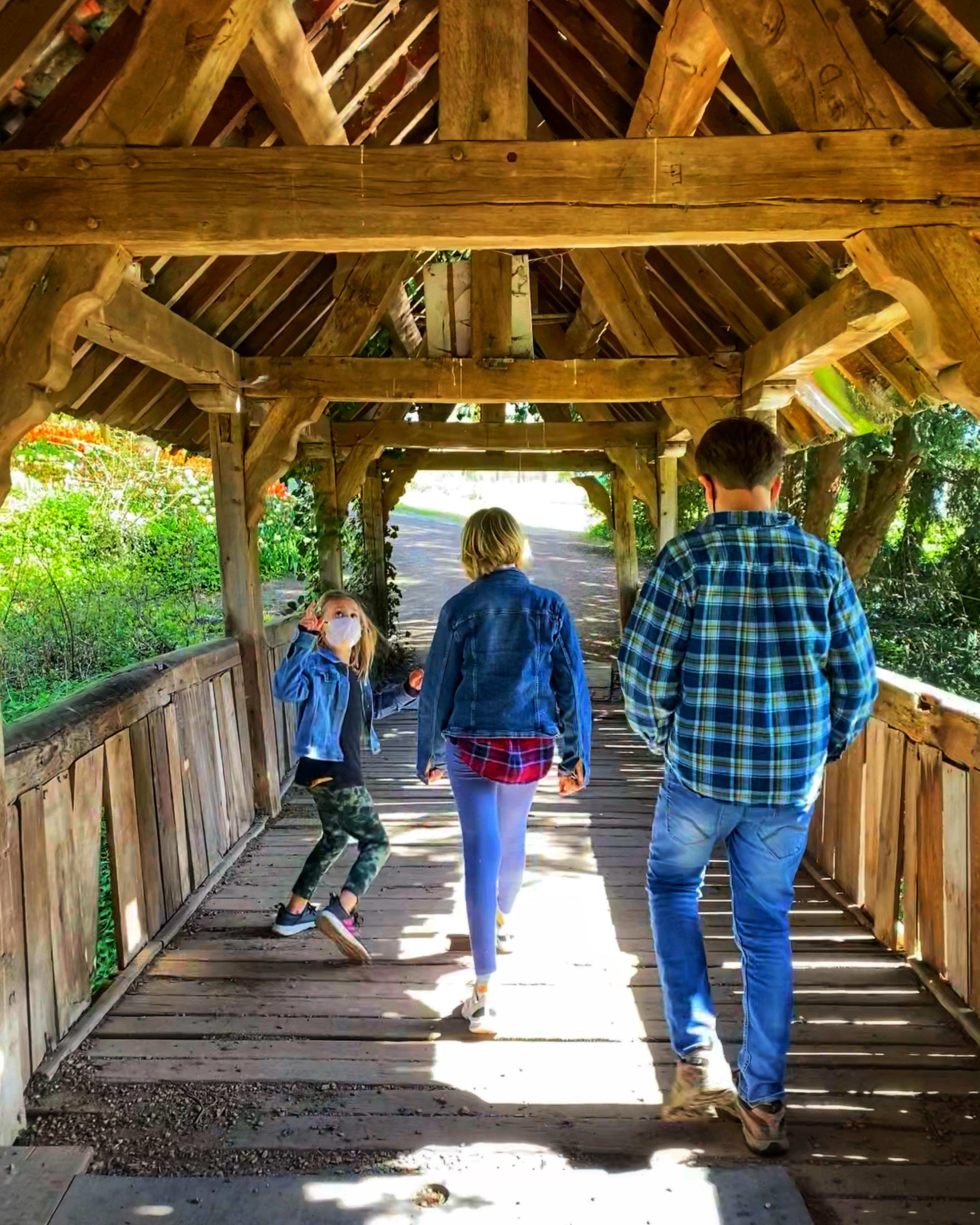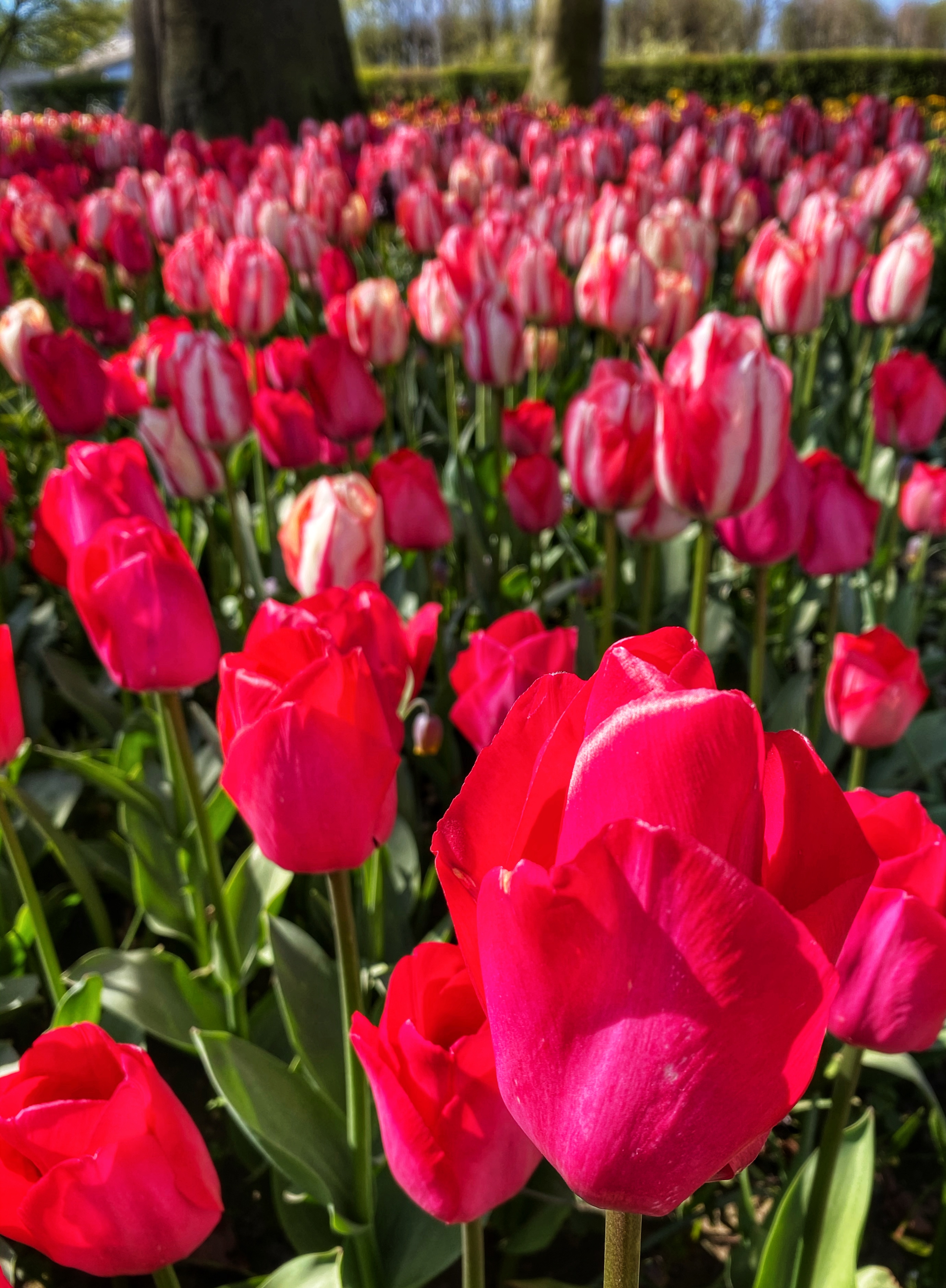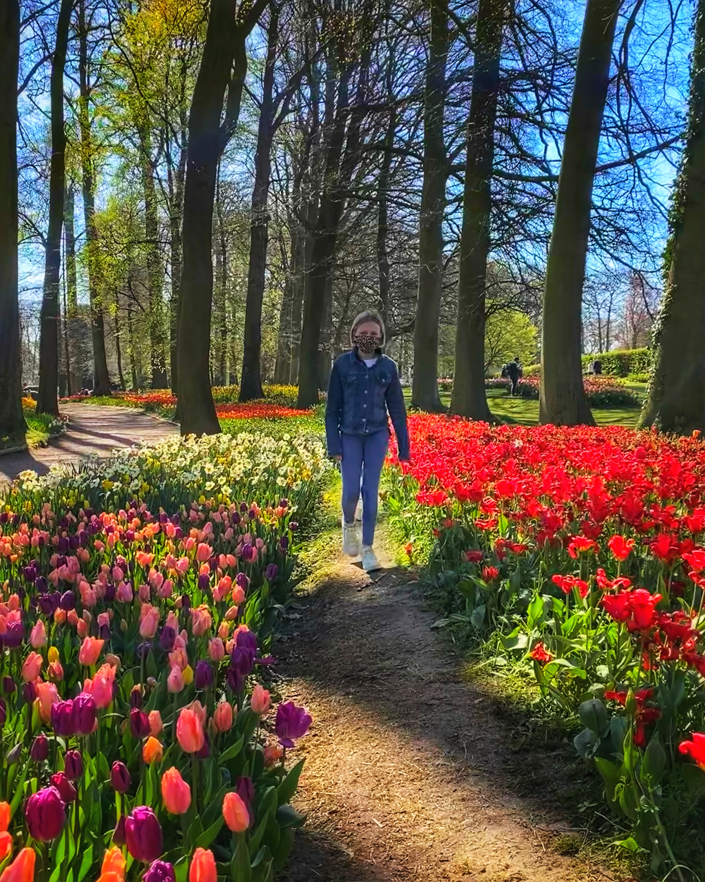 Past the forest area there is a huge, open, manicured field with greenhouses and lots of chairs and benches set up for relaxing. You can wander through the field that is peppered with large rounds, each full of a different tulip variety. Past the greenhouses (where snacks, a picnic area, a small playground and the restrooms were located) is another garden area flanked by two tree-lined paths – which are my very favorite! I know there are no tulips on these paths but I could spend all my time enjoying the sparkly light glisten through the trees as we wandered down these paths.