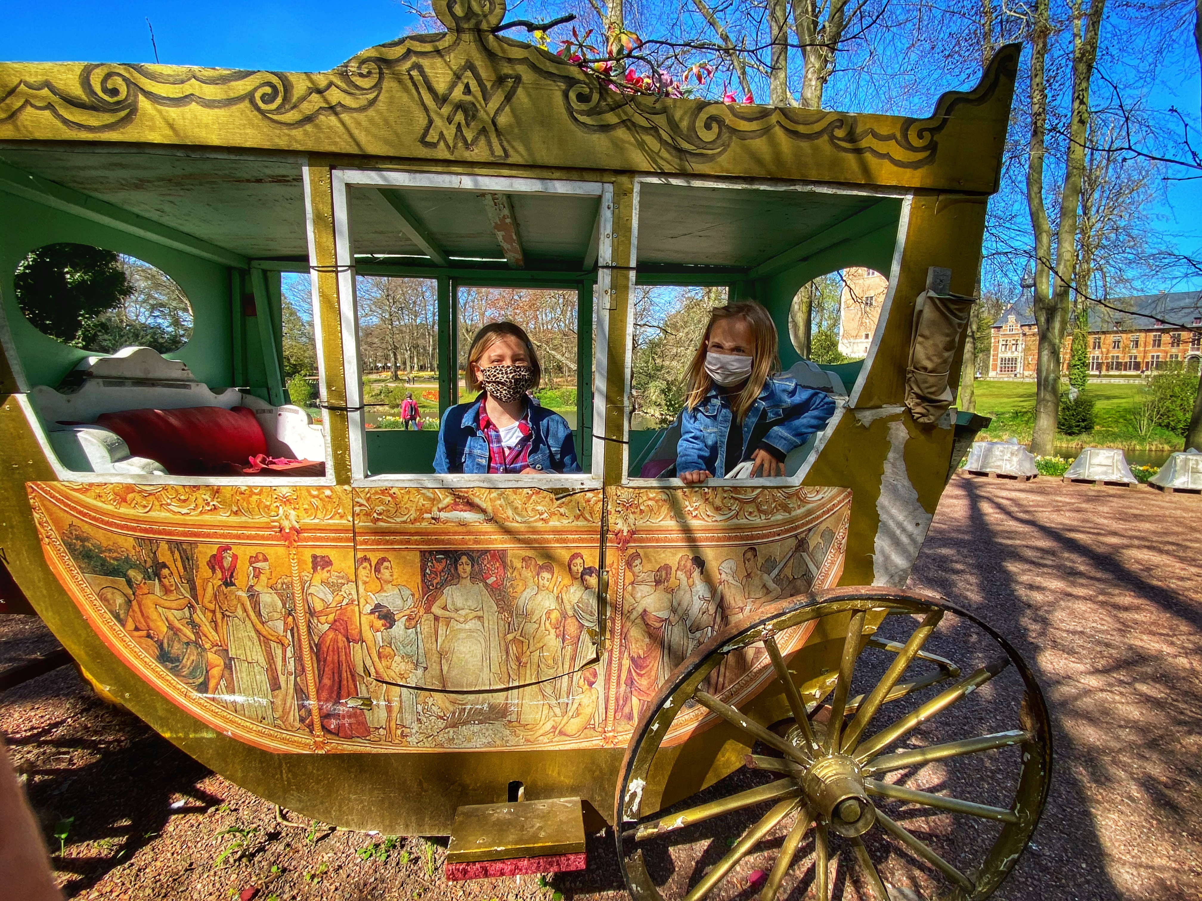 These photos are the “quintessential” Groot Bijgaarden tulip shots this place is famous for. The impressive moat, bridge, and ramparts look awesome behind that tulip-lined hill! Just beyond this there is a cool carriage – it looks to be several centuries old and refurbished with colorful paint!