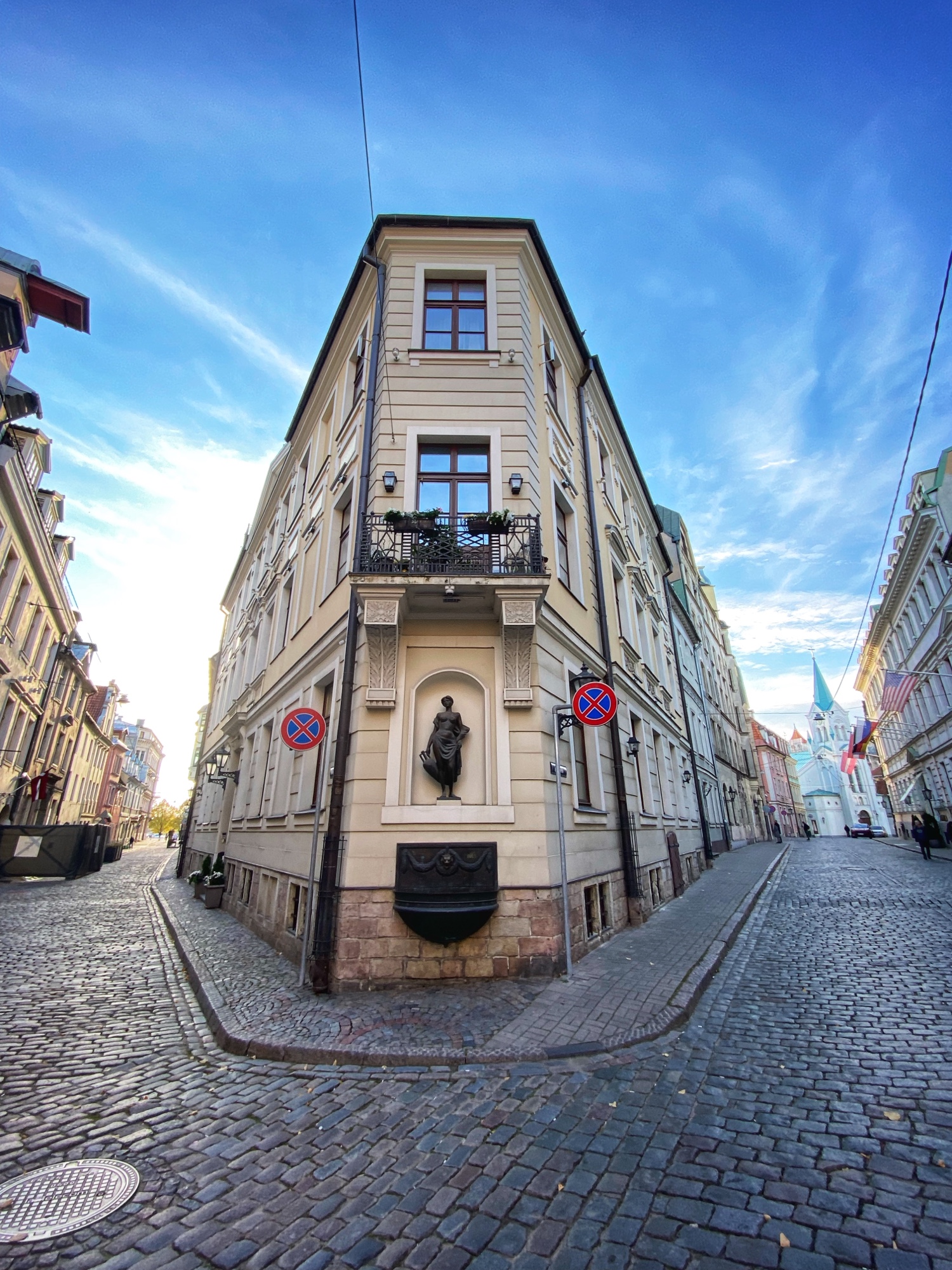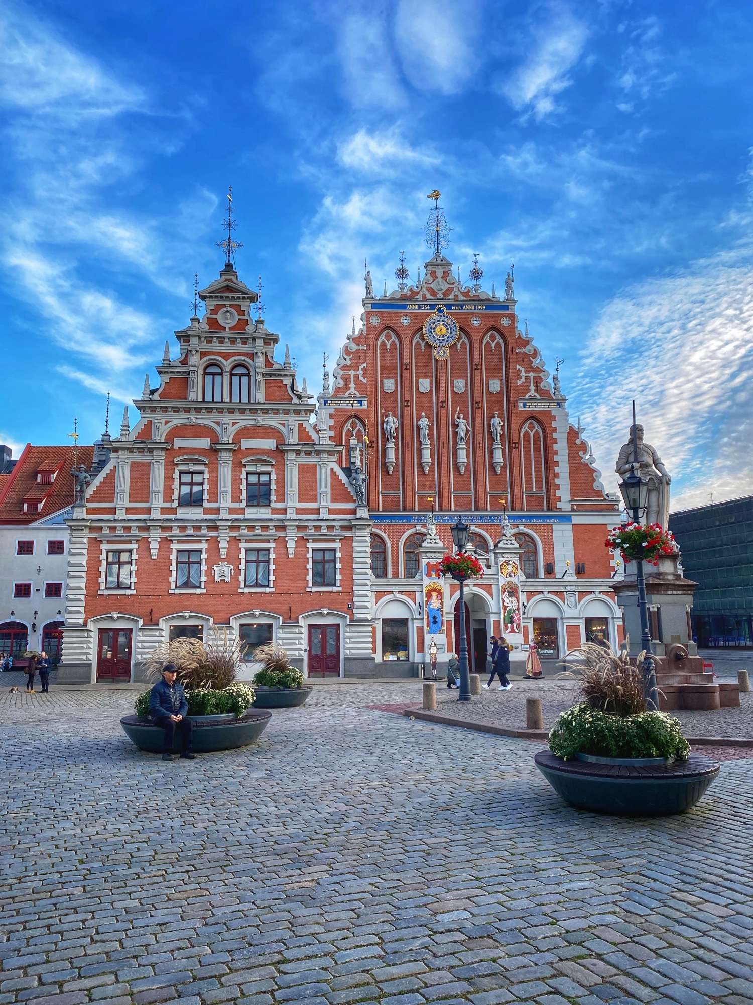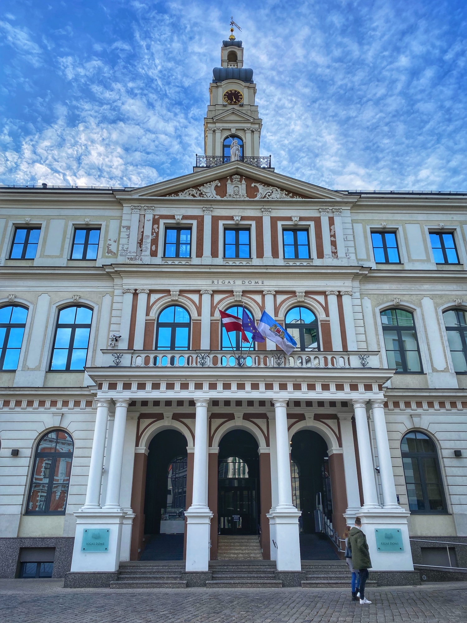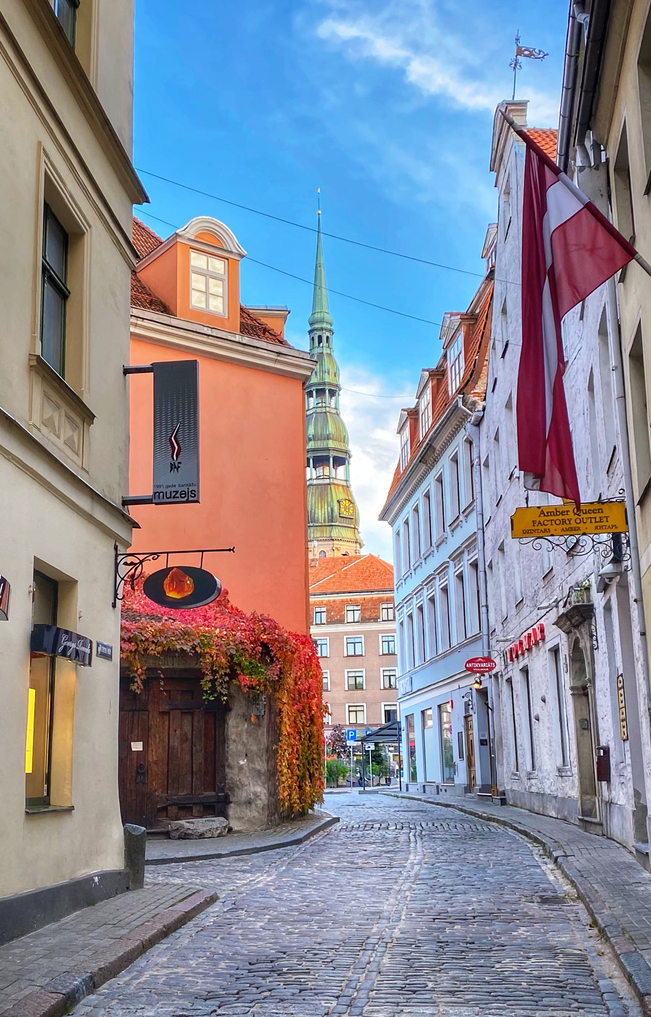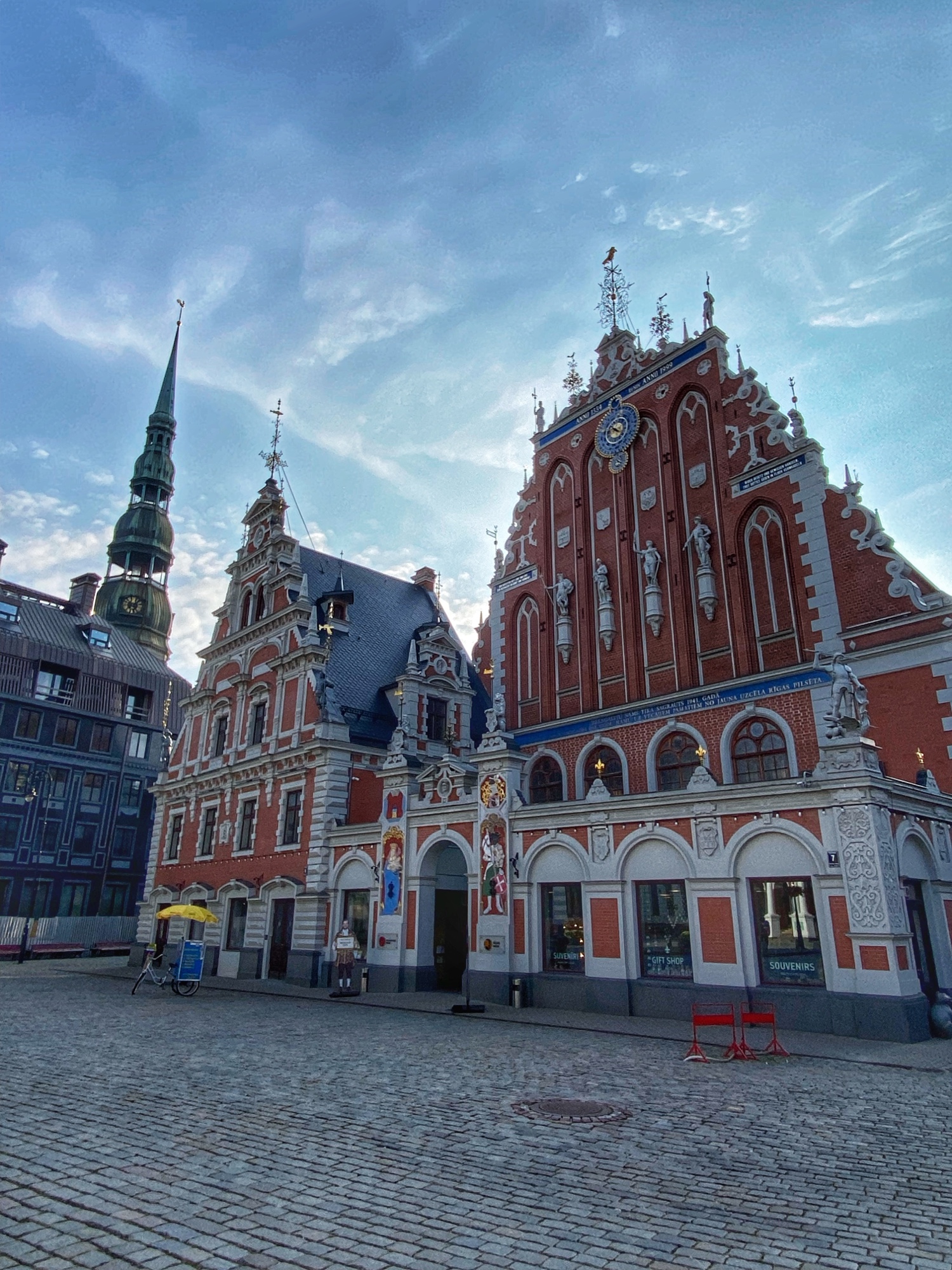 Finally we made it to Riga Town Hall Square to see the infamous House of the Blackheads. This building has come to symbolize Riga but what we see was actually rebuilt and finished in 1999 after being bombed by the Nazis and the remains demolished by the Soviets in 1948. The original building that looked exactly the same was built in the early 1300’s – so it is a true testament to the endurance of this place to rebuild it in its entirety! Why is it called House of the Blackheads? Well, it turns out, this is not the only House of the Blackheads – we also saw one in Tallinn, Estonia! These buildings were gathering places for the Brotherhood of the Blackheads – a group for unmarried men, mostly merchants and ship owners in Livonia (what is now Latvia and Estonia) – who were founded as a military organization in the mid 1300’s. Gradually, over time, the brotherhood became more of a social organization, and still exists now in Hamburg. Also visible from the square is the steeple of St. Peter’s Church. I would’ve liked to climb into the steeple but unfortunately the church was closed when we were there. I understand the library being closed on a Sunday, but I was surprised by the church! It is possible this was due to covid.