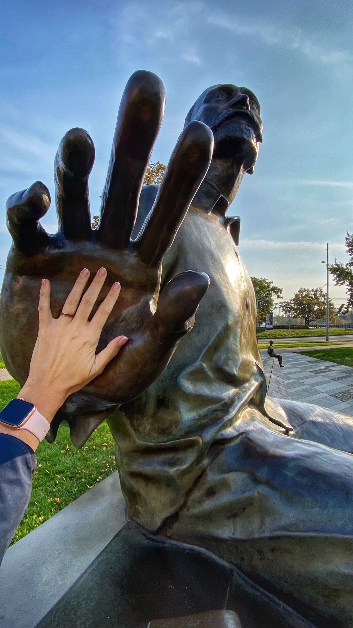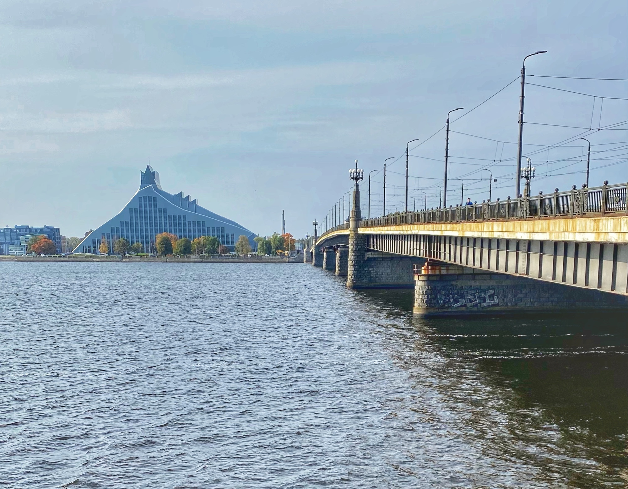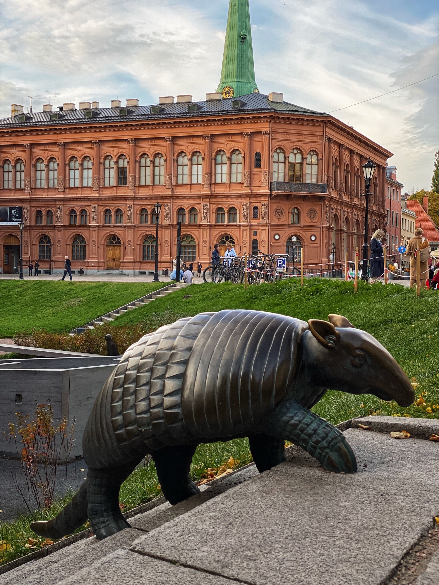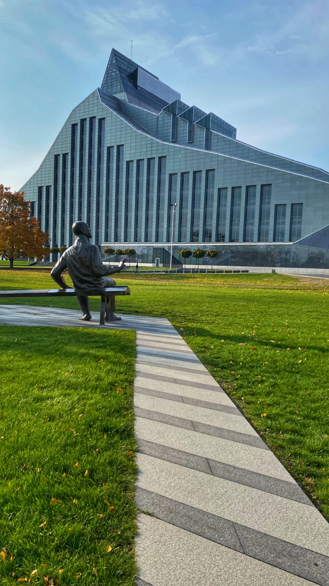 One of the few moments of radical acceptance we had to muster on our trip was just after the disappointment in learning the amazing National Library of Latvia was closed – it was Sunday! It didn’t even occur to me to check opening hours, and there we were, on a tight schedule with only one full day in Riga (two nights) so we were pretty bummed about it. It is obviously gorgeous to see from the outside, but Ashlyn is a librarian and wouldn’t dream of missing a good library on our travels, so we’ll just have to be back to visit this one! We had fun with the Divi Raini sculpture in the park nearby – it shows a giant Raini on the elevated side of a long bench, and his tiny replica on the lower side of the bench. This sculpture, made in 2018, is a monument to the greatness of the Latvian people and their dedication to perseverance. Rainis is the nickname for Jānis Pliekšāns, a hero of Latvian history and independence. It is a beautiful tribute and begs onlookers to sit, ponder, and then go learn a thing or two inside the library!