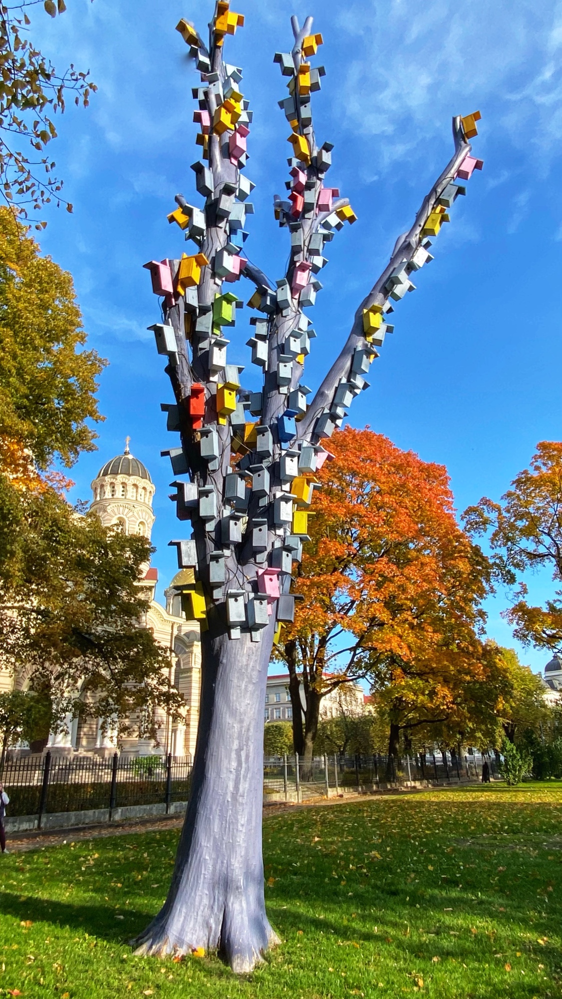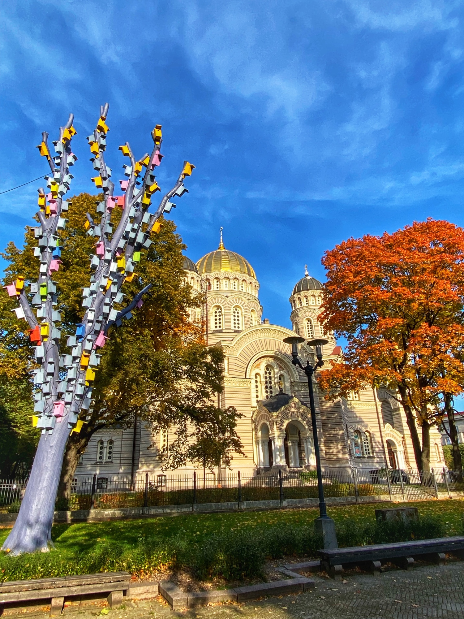 In the center of the city lies a big, beautiful canal that is surounded by the Bastejkalna Park. It, too, was alive with color! This is one of the best places in the city to view fall foliage. We also loved the tree with hundreds of bird houses just outside the Riga Nativity of Christ Orthodox Cathedral – a church with quite a fascinating history as well! The gold dome is iconic and also a symbol of Latvian independence, as the building was converted into a planetarium during Soviet occupation, and then refurbished into the church we see today in 1991. Also near the park is the great Freedom Monument, a memorial to the war of Latvian independence in the early 20th century.