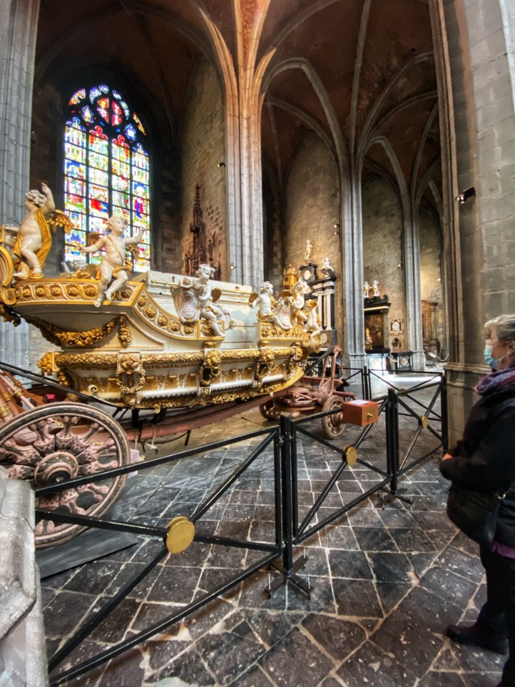 It is hard to miss the gilded carriage (below) known as the Châsse de Sainte-Waudru. It is also plain to see the lines on the floor that have been worn over the years from the movement of the carriage during the annual DouDou celebration. From Visit Mons, “Marking the start of the Doudou, the descent of the Châsse de Sainte-Waudru takes place the night before Trinity Sunday as the clock strikes 8pm. In the Collegiate Church, packed with people, the relics of the city’s patron saint join mere mortals.” The ritual symbolizes the welcoming of the patron sait of Mons back home to be with the people. Sainte Waudru is known as the founding mother of Mons, as she supposedly saved the city from plague in the 1300’s. I have yet to witness this event but will keep an eye out this June!