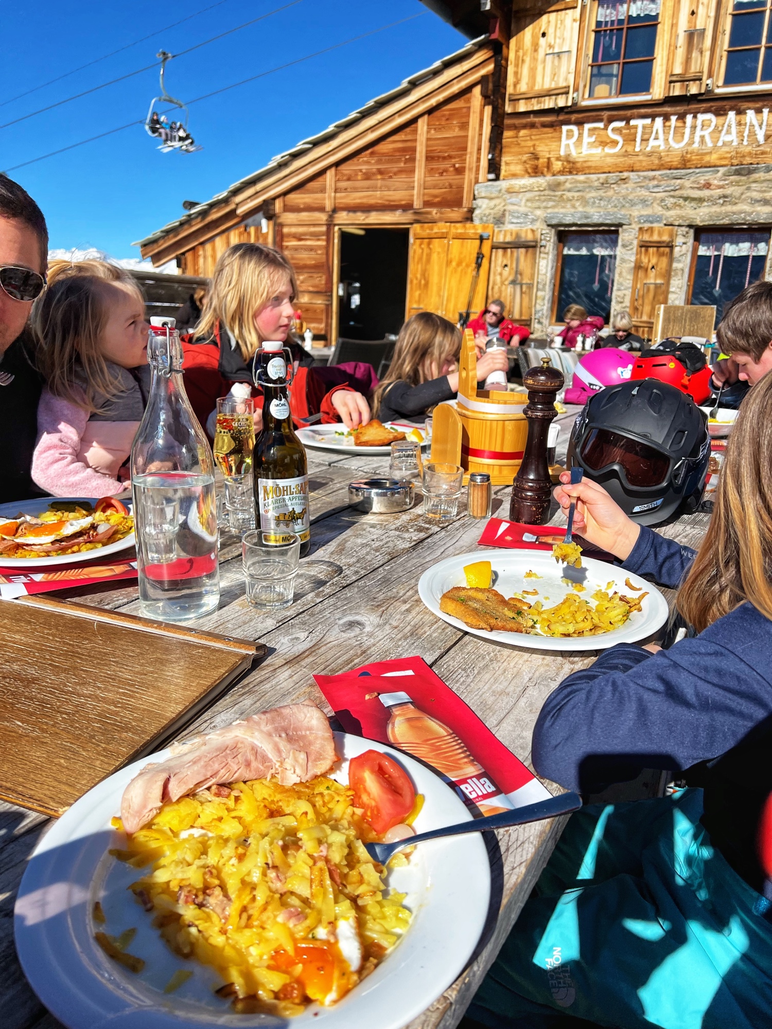 The kids started slow on the bunny slopes and magic carpet lifts as they got their bearings. The girls quickly wanted to move onto the “more fun” slopes and kid-friendly runs but big bro was taking it easy and stayed near the T-bar for the first two days. On the second day I went up the chair lifts with the girls as they were doing great with slightly more challenging slopes. Lunch at this beautiful Bergrestaurant Hannighüsli had alpine views in all directions. We enjoyed the traditional rosti potatoes (like home fries) and other yummy mountain meals. That was the most expensive part of skiing at around $100 for the four of us! The rest of the time we brought snacks with us to save money and we always had lots of water on the mountain. That altitude can get to you without proper hydration! We also found ourselves getting very dry in the crisp mountain air; it was beautiful weather for skiing but we did have allergies and chapped lips to manage. Typical!