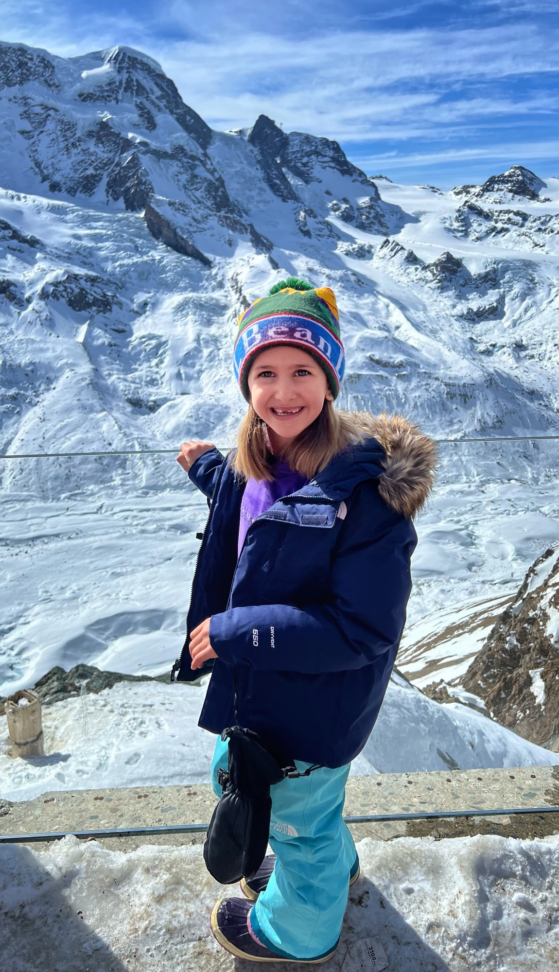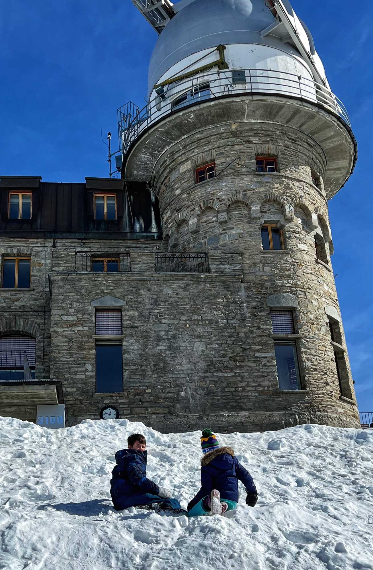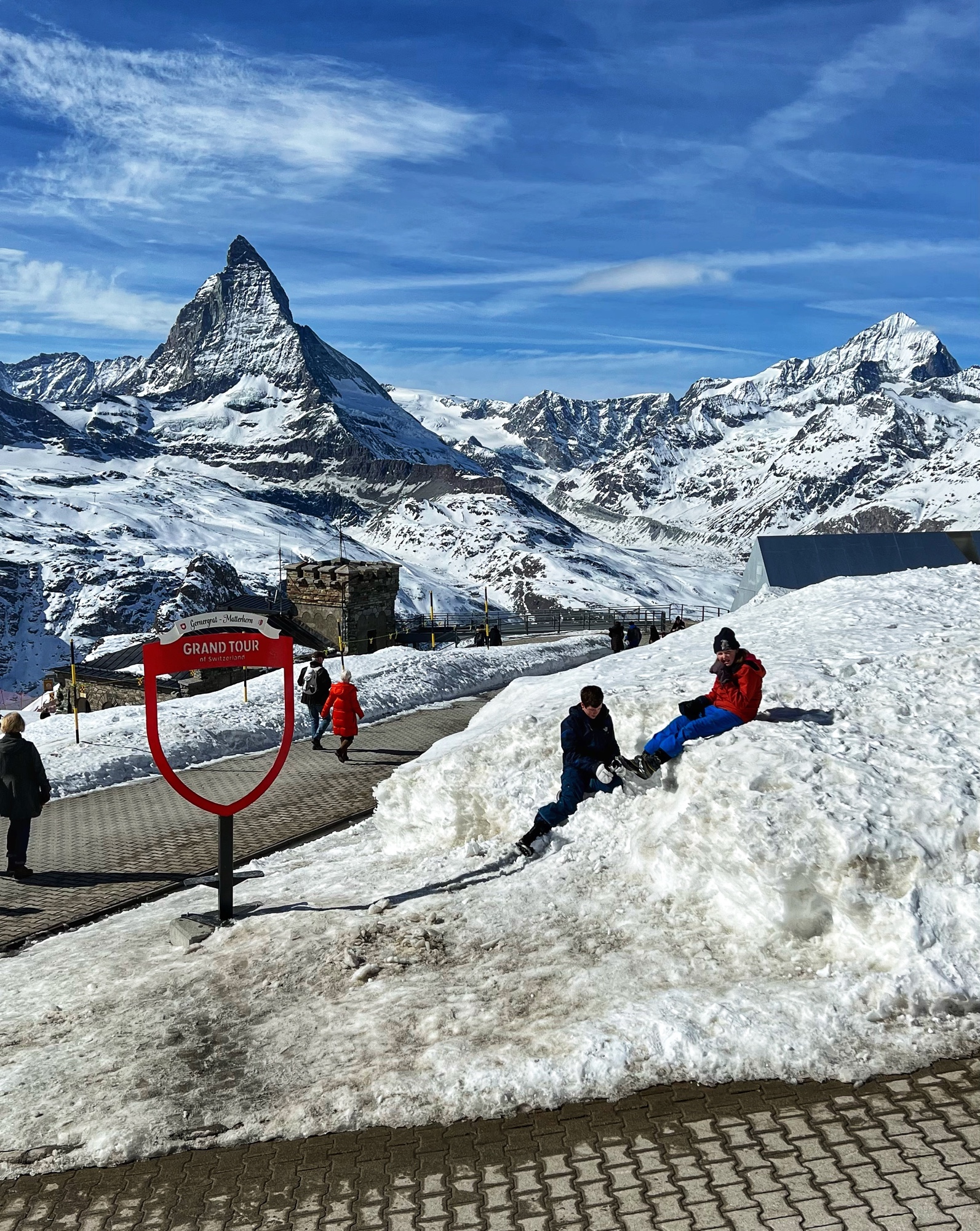 We heard a man playing a trumpet (a horn to the Matterhorn) from the very top platform. It has a 360º view of the Swiss Alps and is just breathtaking! I recommend checking out the shops and even hanging out in the outside patio Panorama Self for lunch or a drink. Those views just don’t get old. I also recommend wearing snow gear because there is tons of snow for the kids to play in, even if they don’t ski!