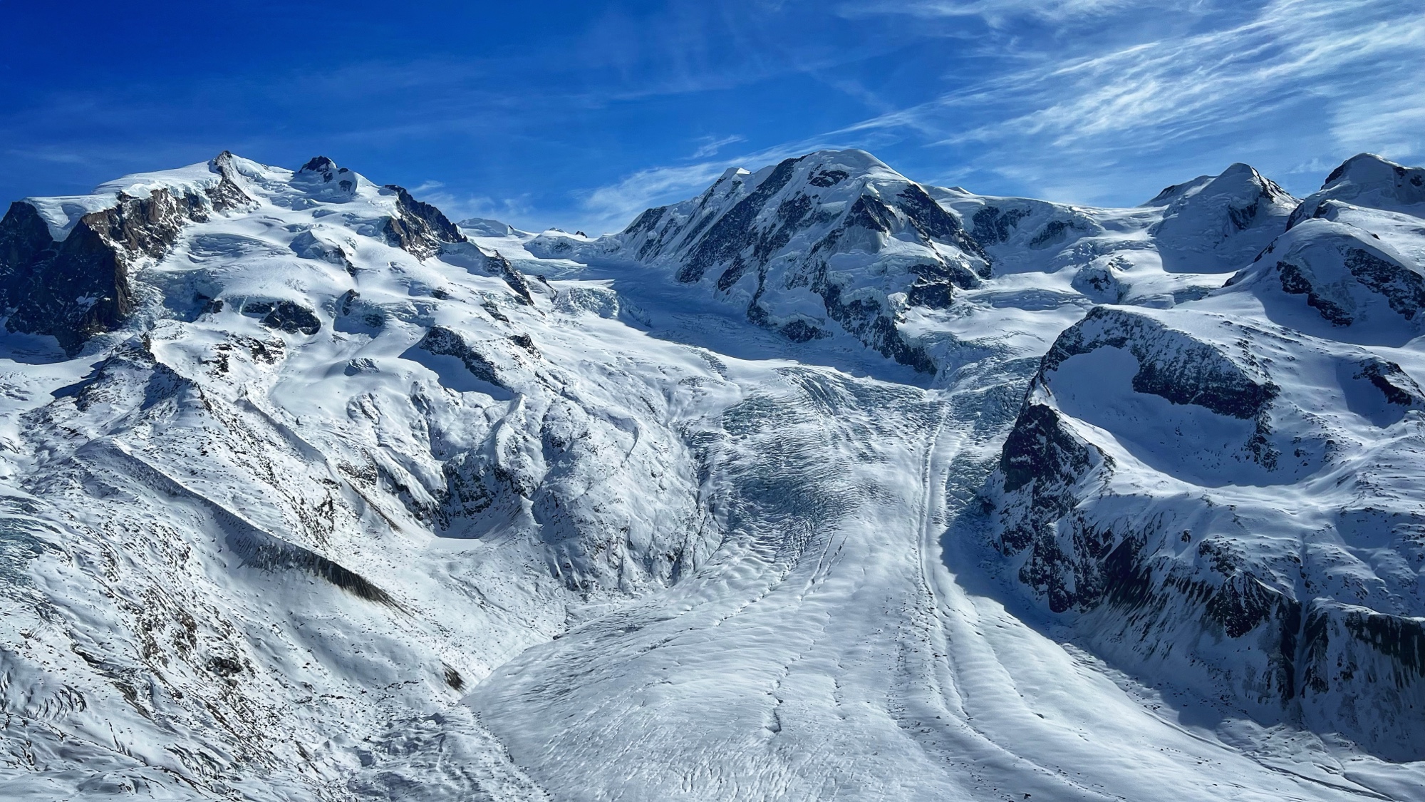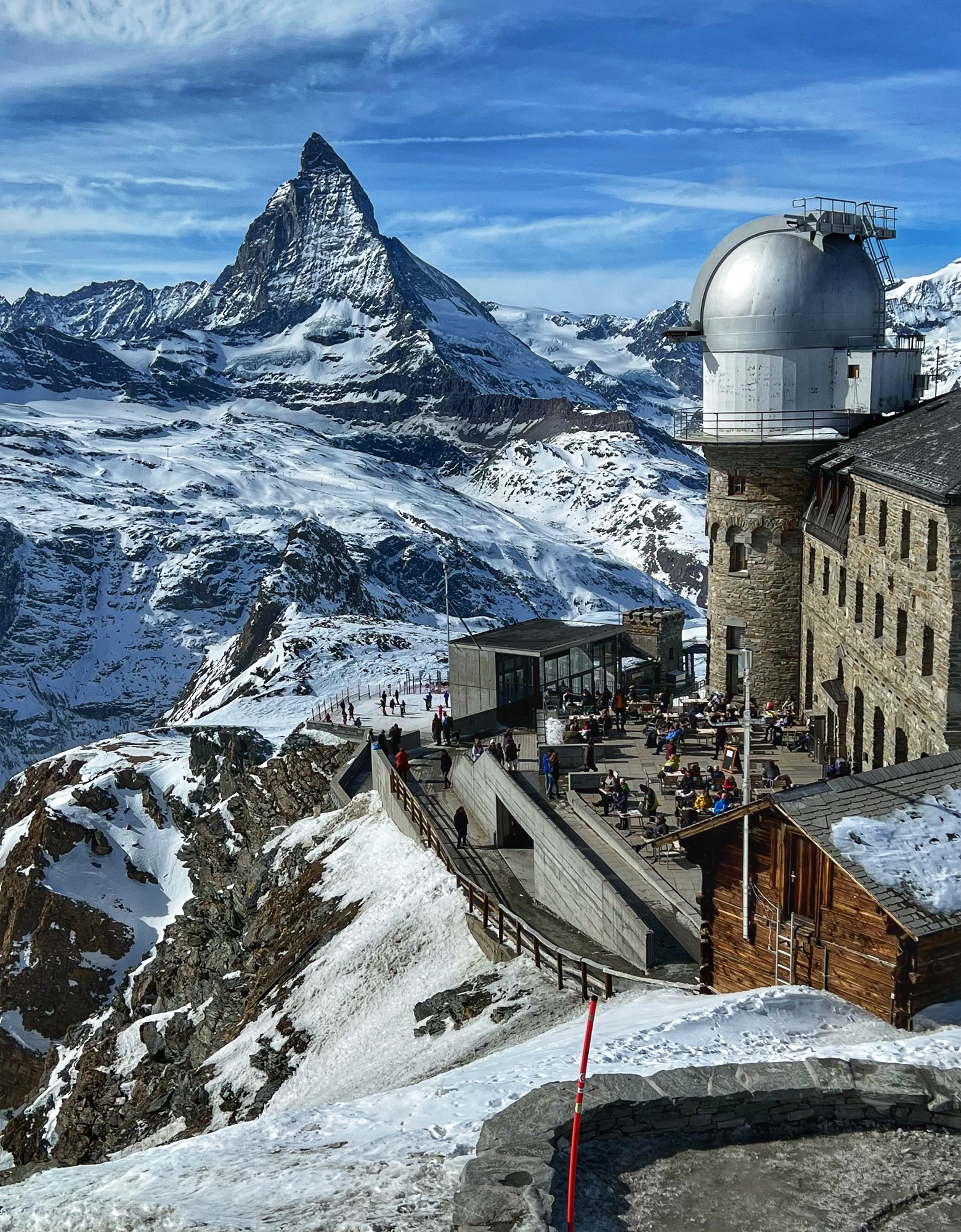 The entire ride up the mountain took around 20 minutes, as they made a couple of stops for skiiers and hikers to get off. If the kids weren’t so tired from their 3 days of skiing, we would have disembarked at the second to last stop and hiked to the Riffelsee. It probably would be more beautiful in the summer at that spot though. The top of the cog train stops at Gornergrat, where there is a restaurant, shops, and even a place to stay! This would also be the ultimate place to ski back down the amazing bowls with views of the Matterhorn the entire way. You can see the ski runs in the photos below! Most impressive for us (besides the inspiration for the Toblerone) were the glaciers all around us. We had never seen that many glaciers before!