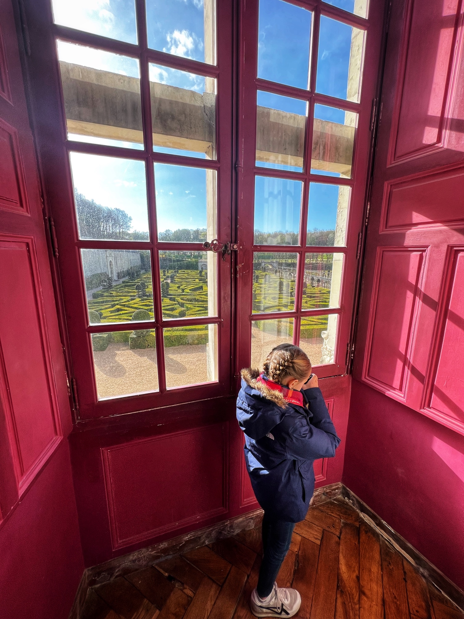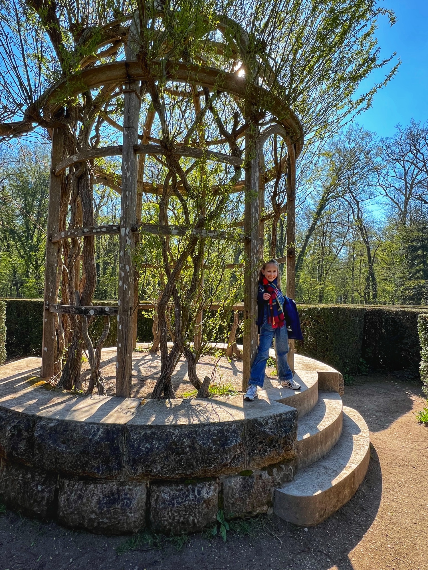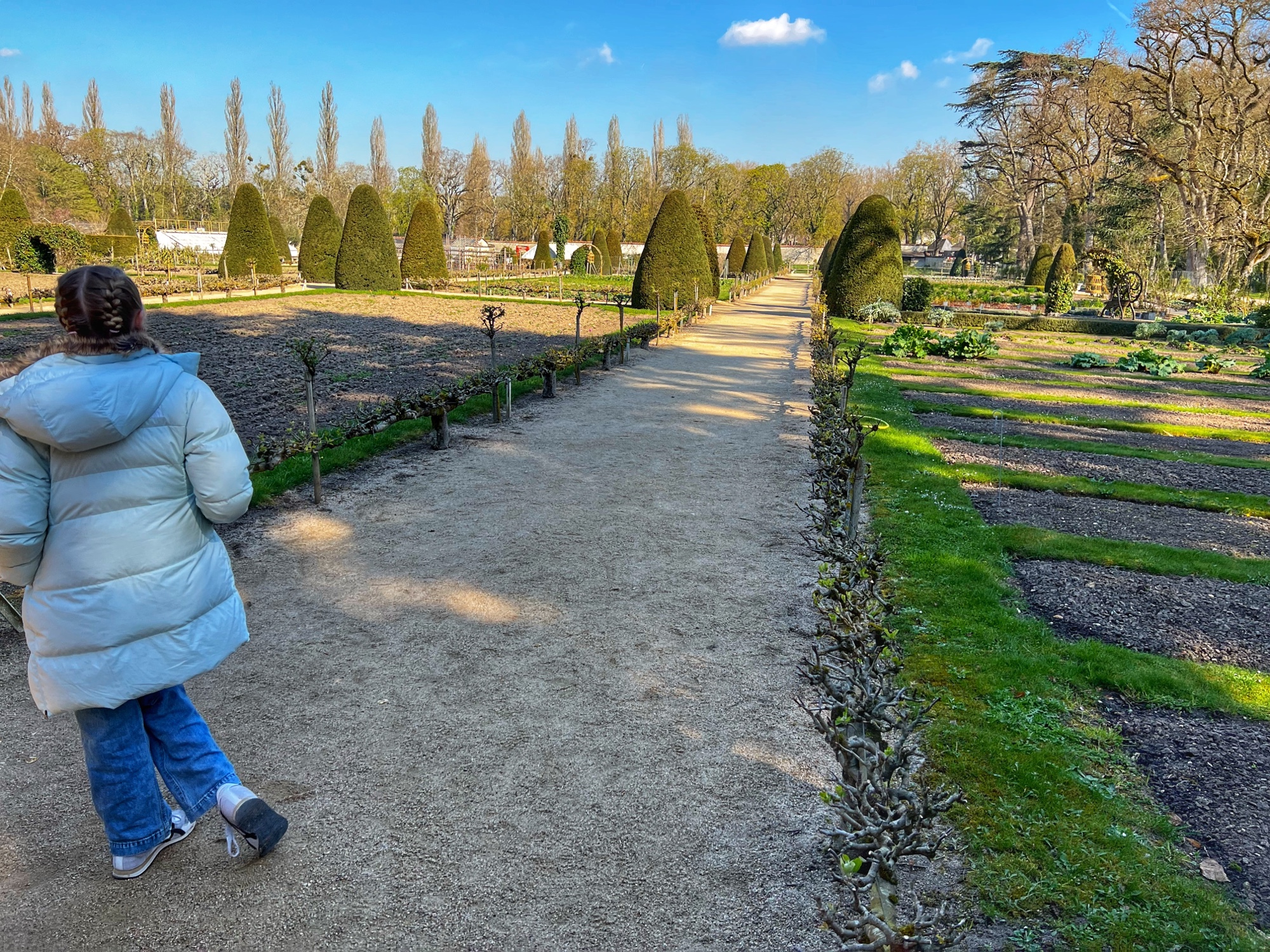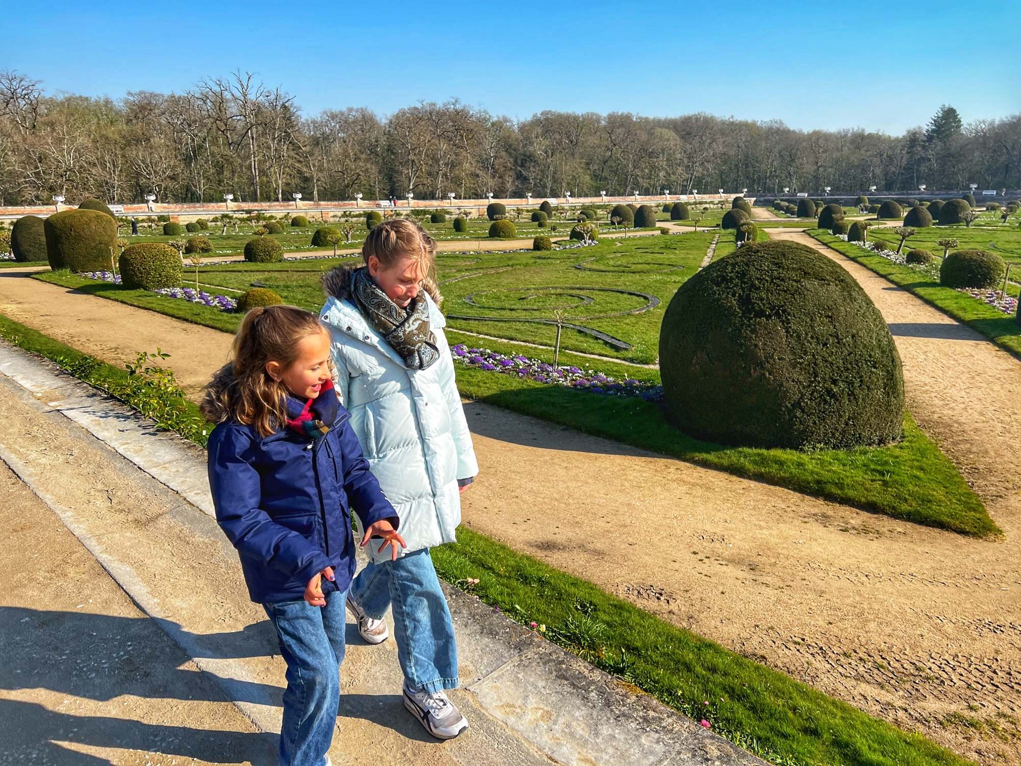 Outside we walked through all the gardens and had them all to ourselves in the morning. The girls loved the “Sun Garden,” as that is where the playground is and it leads to the Maze. I was most impressed by the vegetable and herb gardens and would love to return to see the trellises thick with blooms. We didn’t walk through the woods, but it is possible to take a short, elevated path through the nearby woodlands that ends at the Pavillion d’Audience. For a sunny day, it was bitter cold and we decided to take the most direct path through the gardens to save our finger tips!