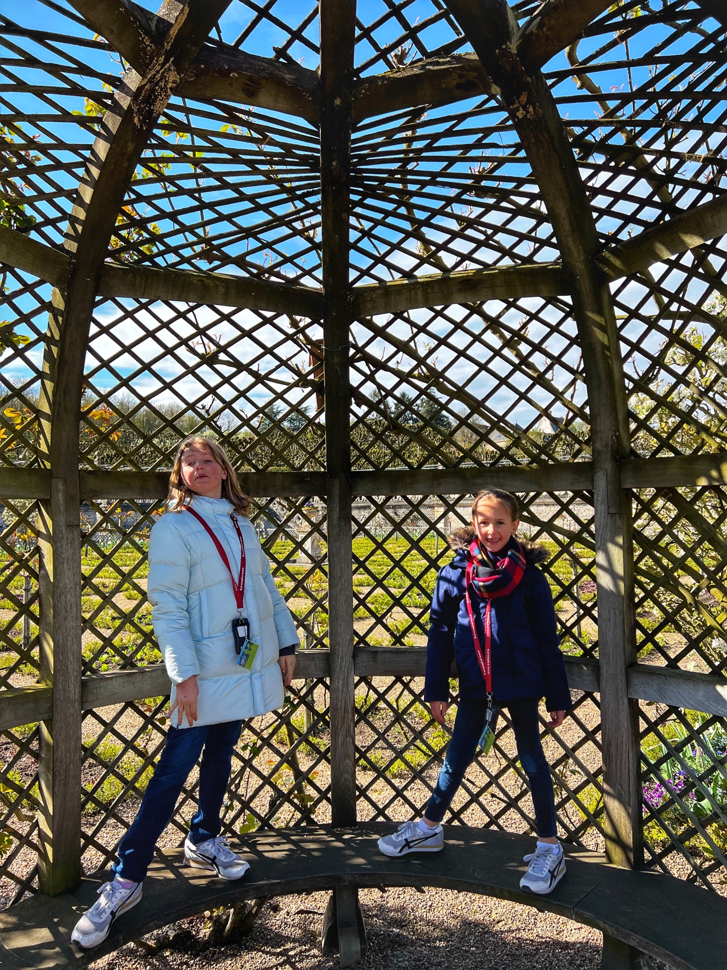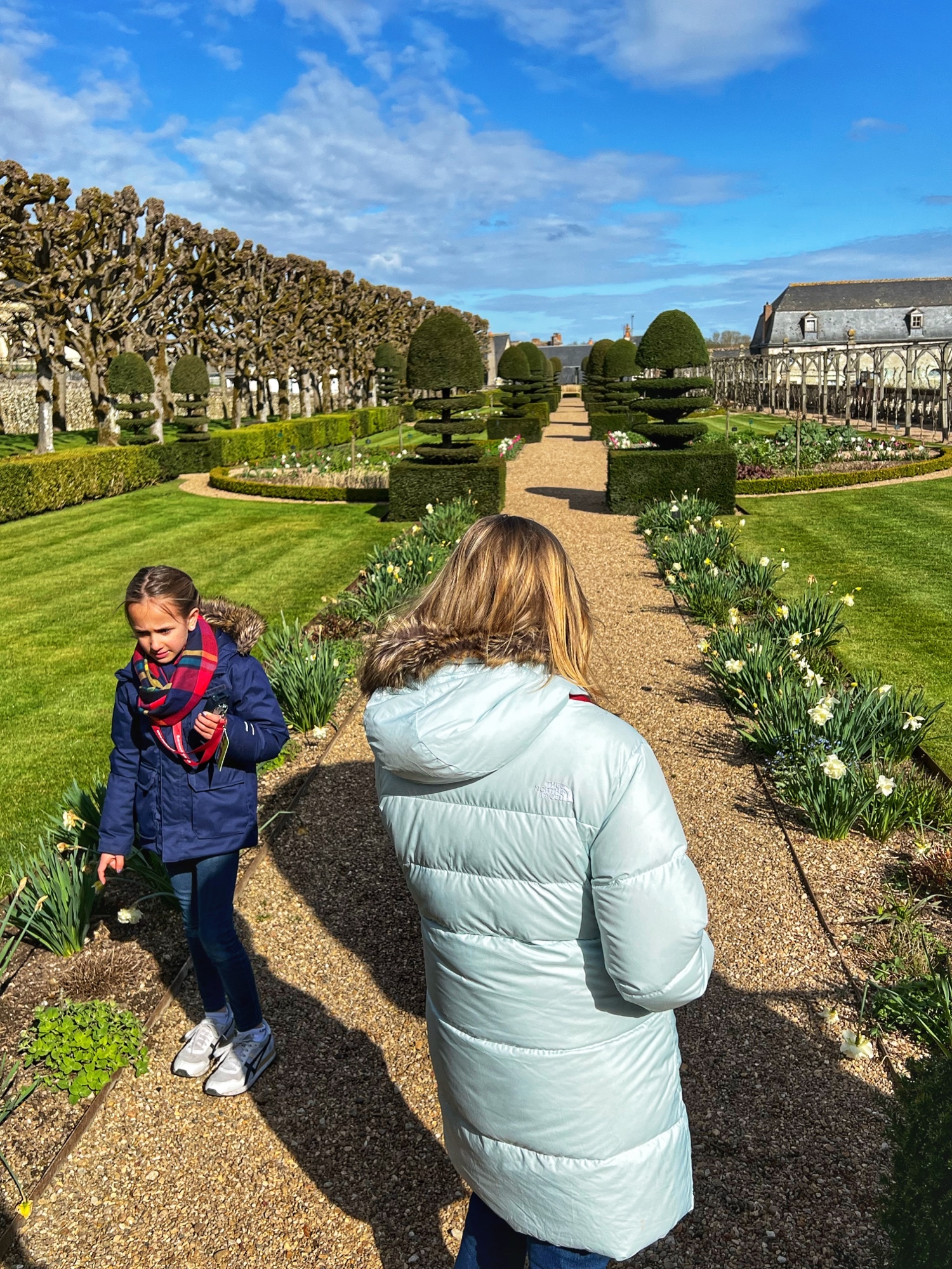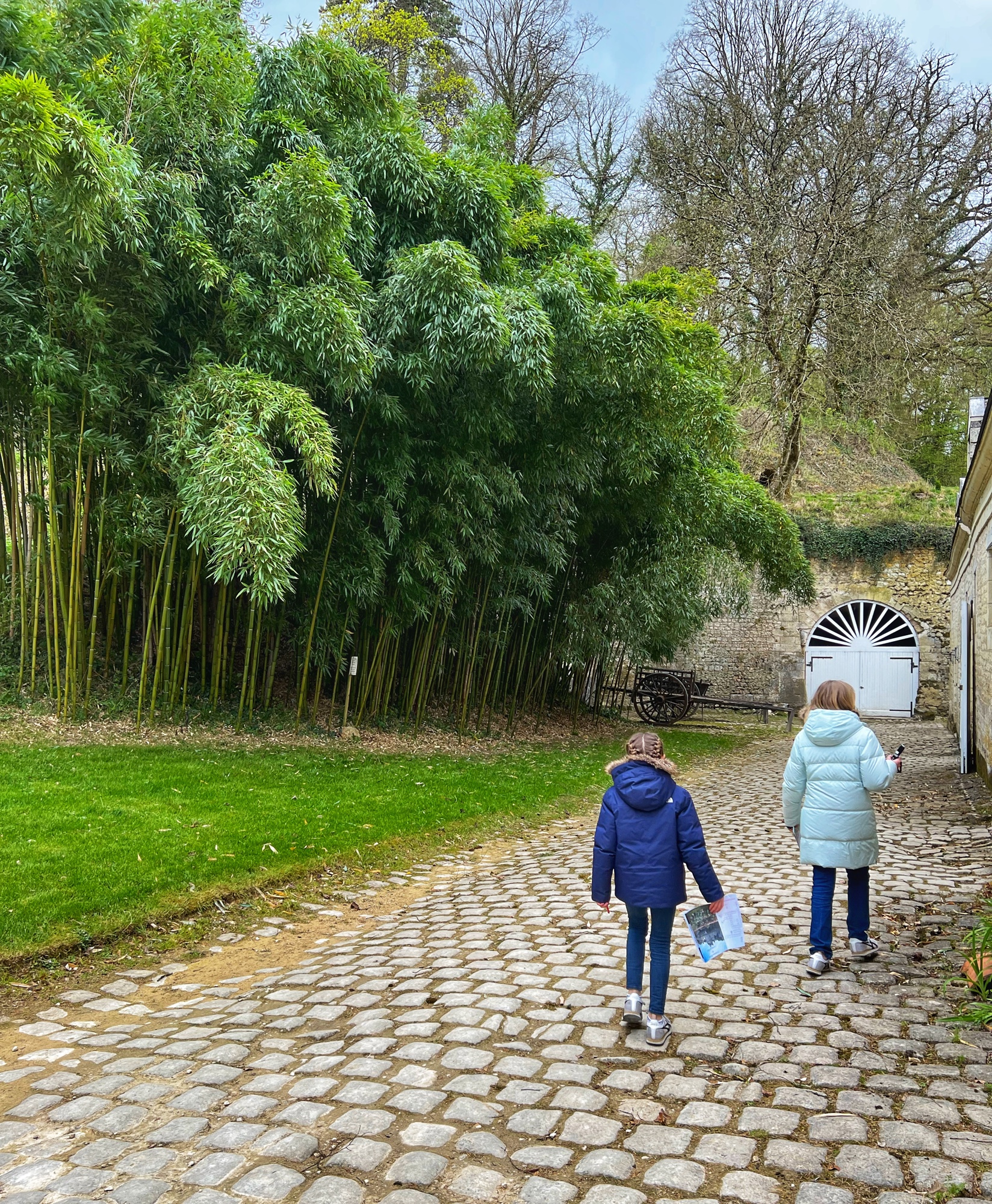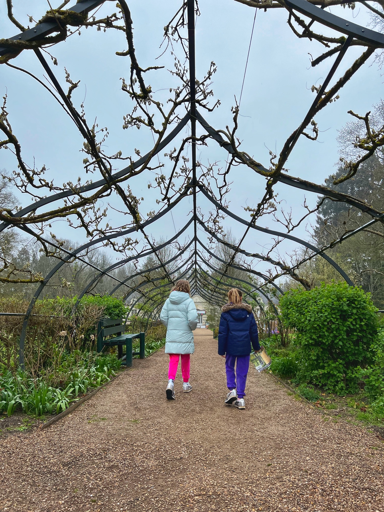 Outside we walked through all the gardens and had them all to ourselves in the morning. The girls loved the “Sun Garden,” as that is where the playground is and it leads to the Maze. I was most impressed by the vegetable and herb gardens and would love to return to see the trellises thick with blooms. We didn’t walk through the woods, but it is possible to take a short, elevated path through the nearby woodlands that ends at the Pavillion d’Audience. For a sunny day, it was bitter cold and we decided to take the most direct path through the gardens to save our finger tips!
