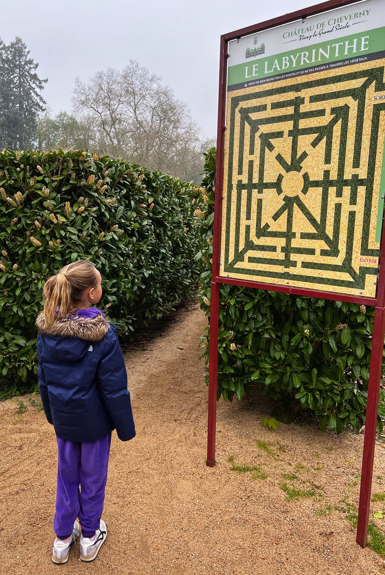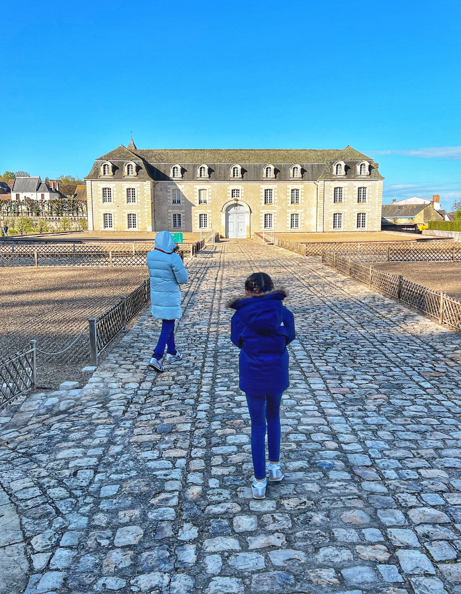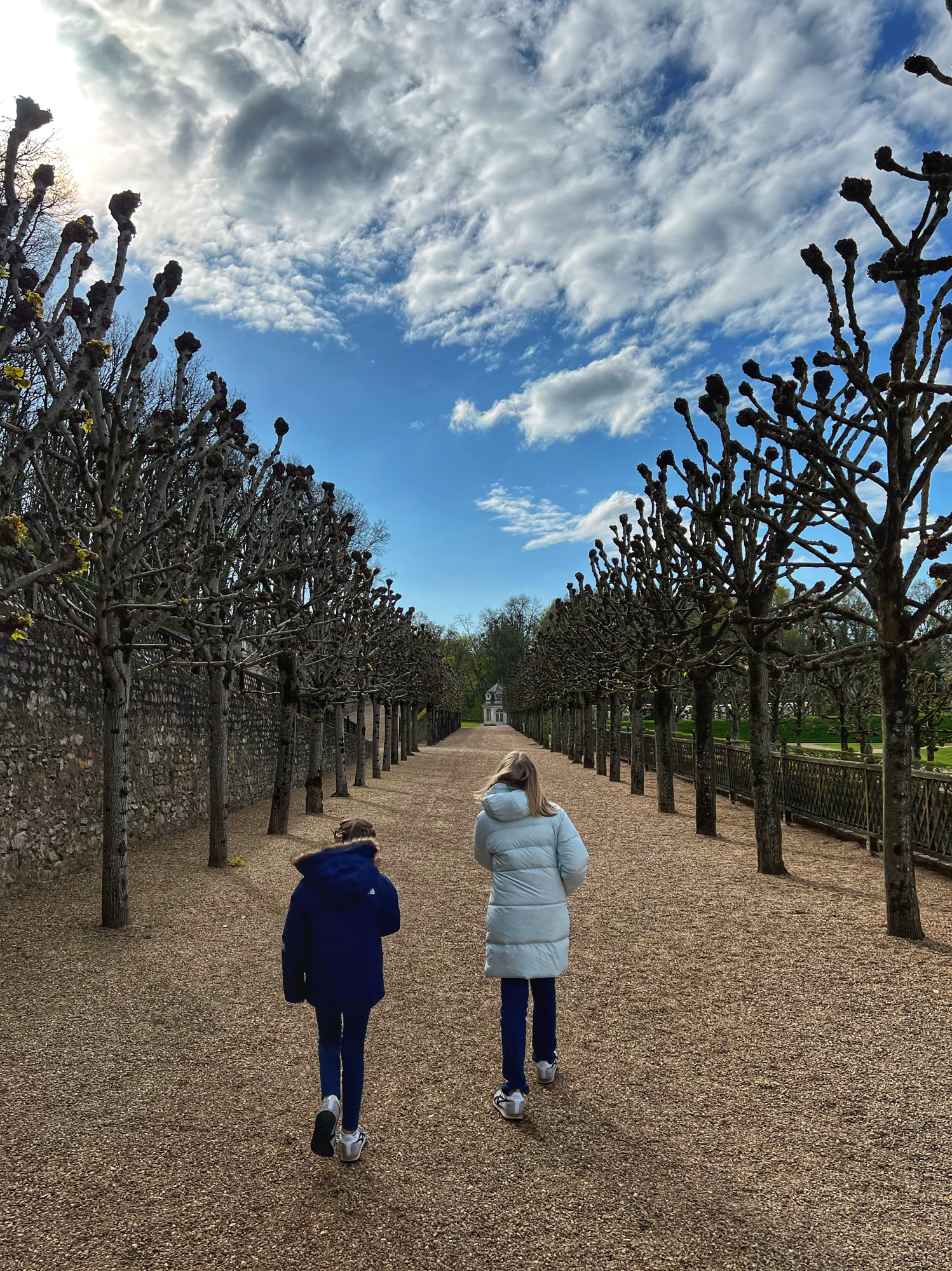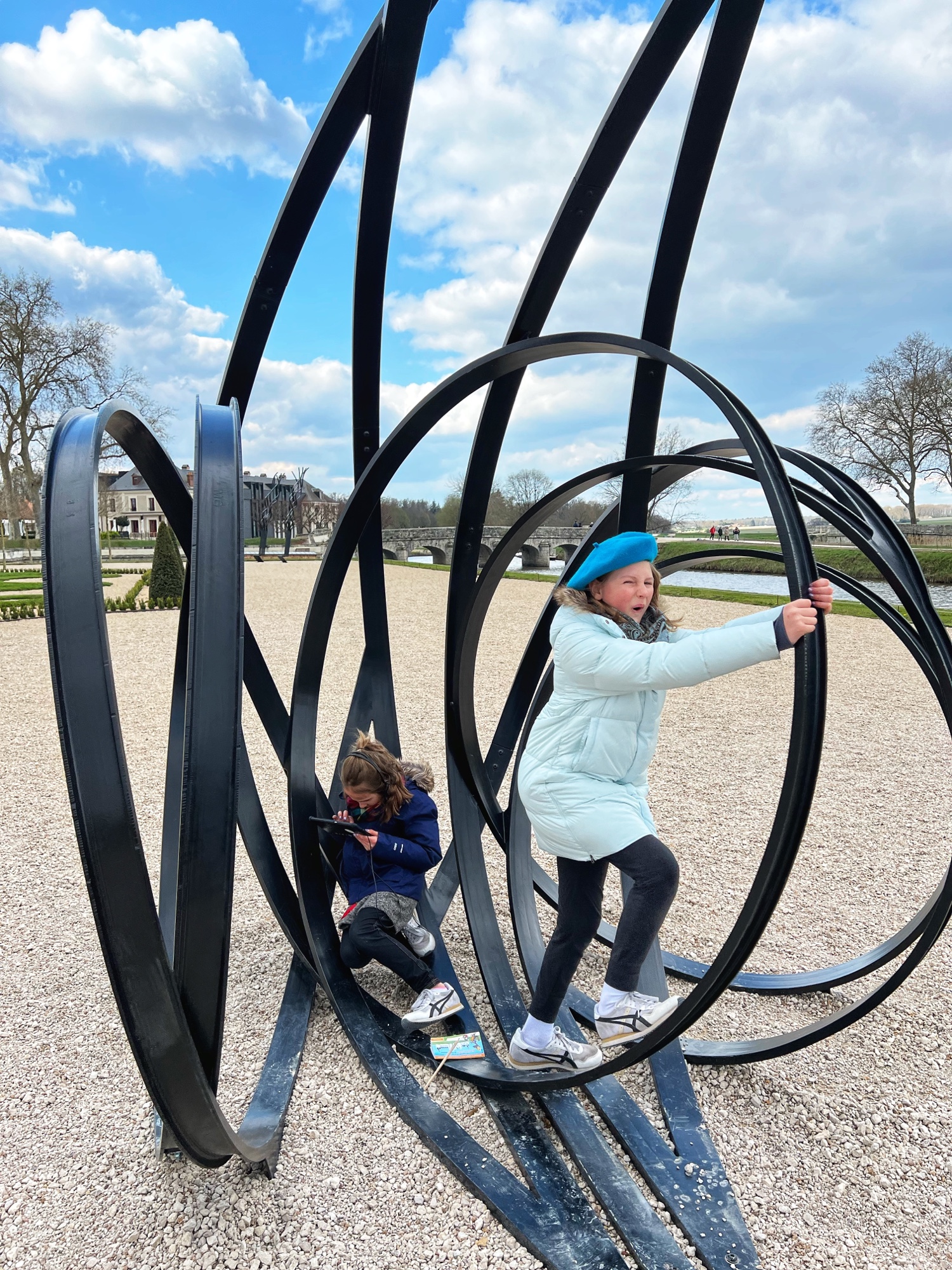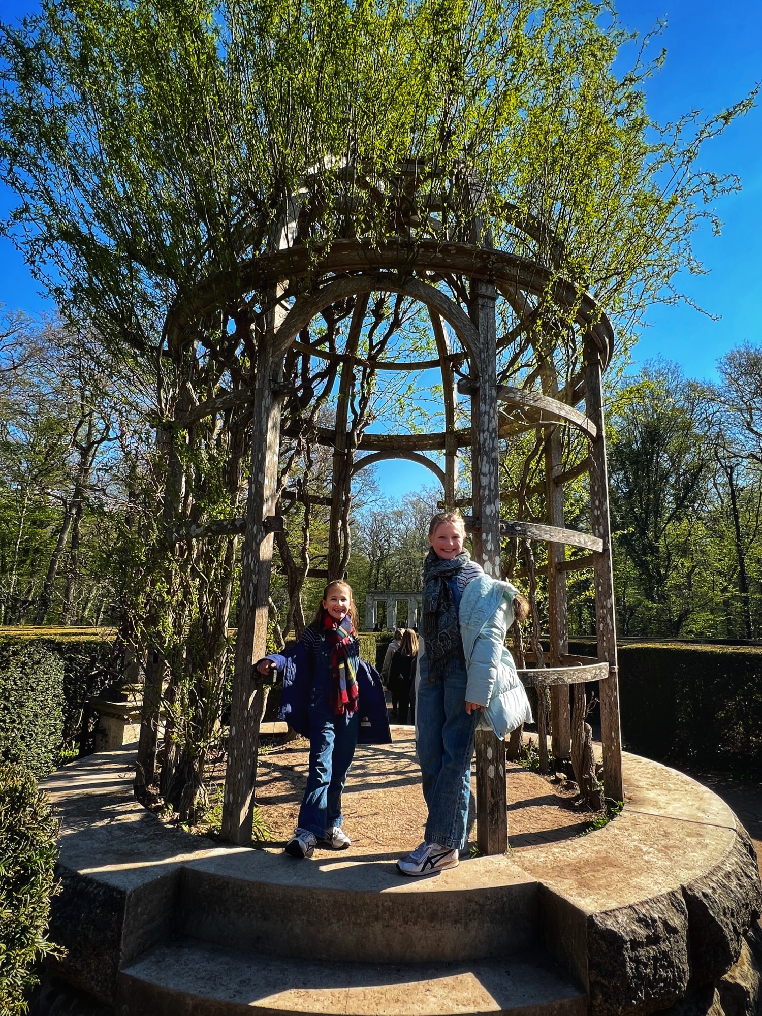 Outside we walked through all the gardens and had them all to ourselves in the morning. The girls loved the “Sun Garden,” as that is where the playground is and it leads to the Maze. I was most impressed by the vegetable and herb gardens and would love to return to see the trellises thick with blooms. We didn’t walk through the woods, but it is possible to take a short, elevated path through the nearby woodlands that ends at the Pavillion d’Audience. For a sunny day, it was bitter cold and we decided to take the most direct path through the gardens to save our finger tips!