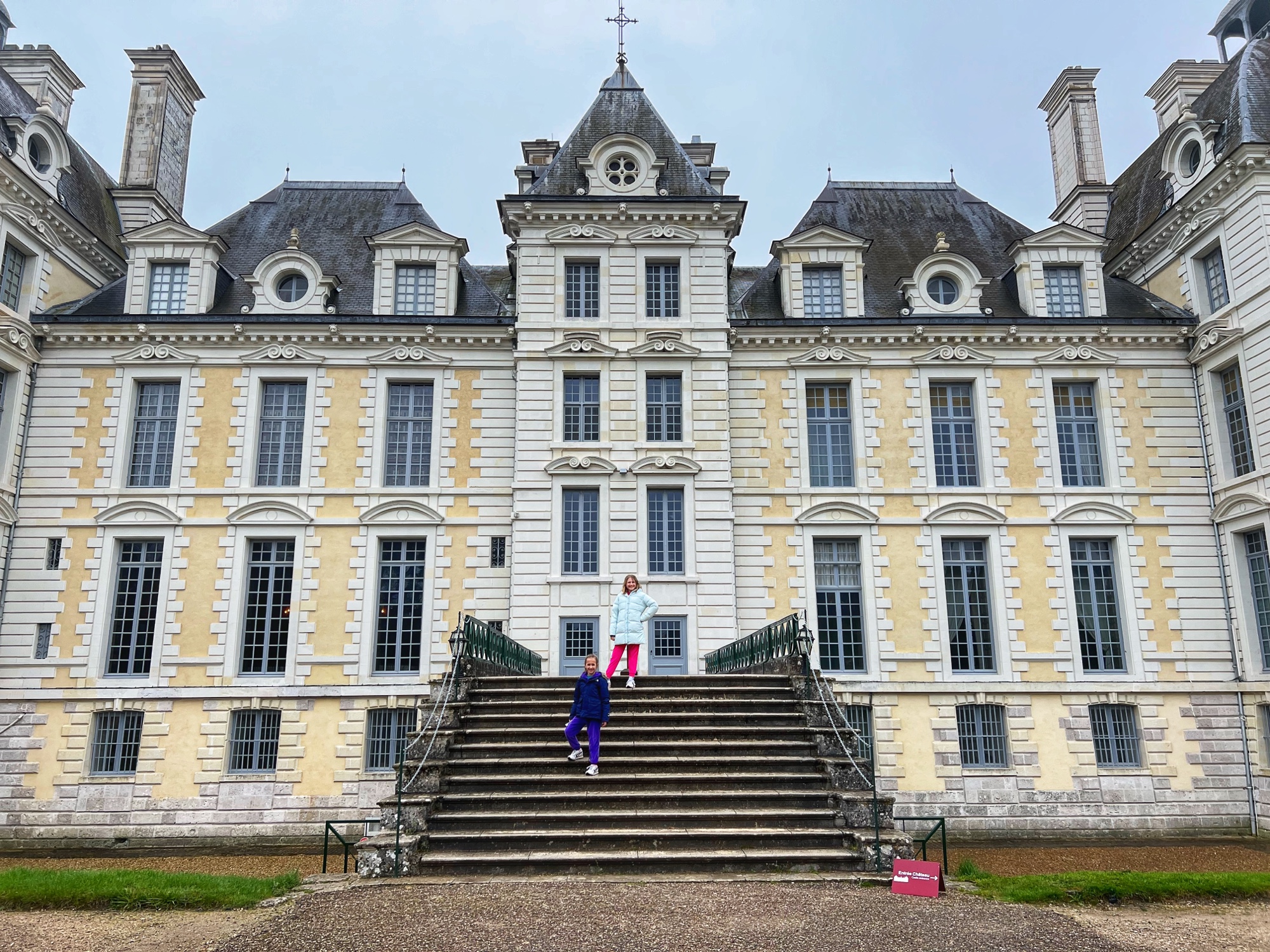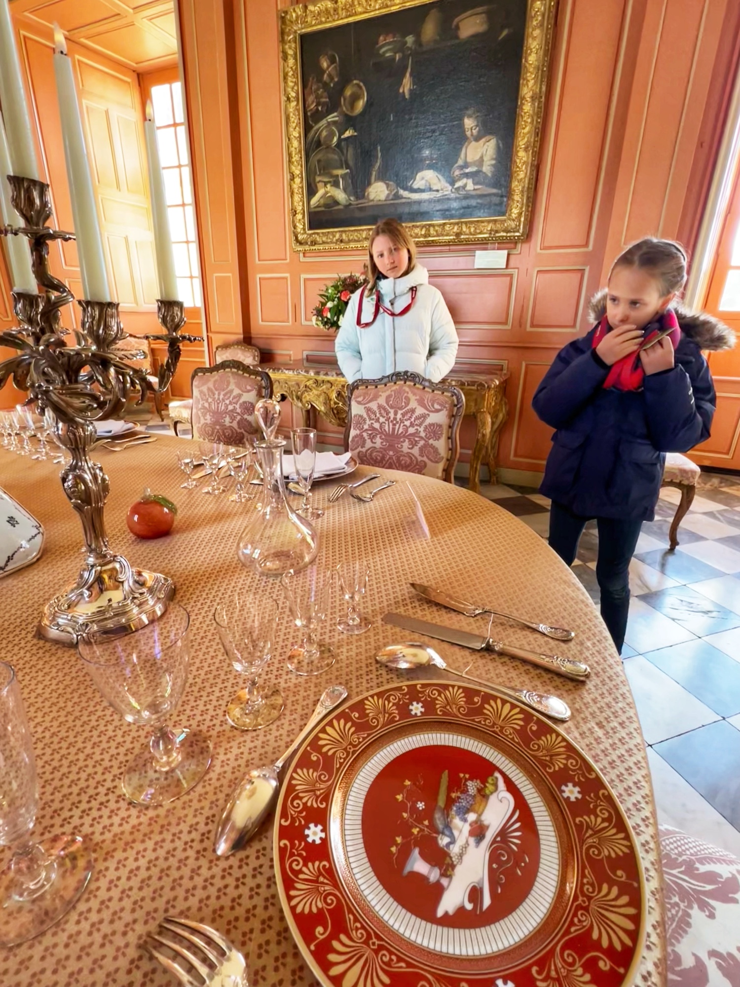 Cheverny was the next most expensive castle and domain we visited, and although it was a very cold and rainy day, it was still well worth the visit! It was hands down the most well decorated and appointed castle we saw. It was kid friendly with the riddle book, and with the extra options (Tin Tin cartoon exhibit, gardens, Orangerie, dogs, boat tour etc) you could easily make a day at Cheverny! We recognized the castle right away from having seen the cartoon “Tin Tin,” that takes place here at the château. It is the most modern looking residence we saw, and we learned it is in the hands of the same family for most of the last 600 years! Currently Charles-Antoine de Vibraye and his family reside in about 10% of the castle while the rest is open to the public and has been since 1922. This private estate is decked out with decor during various holidays and is always full of fresh flowers and marvelous mementos.