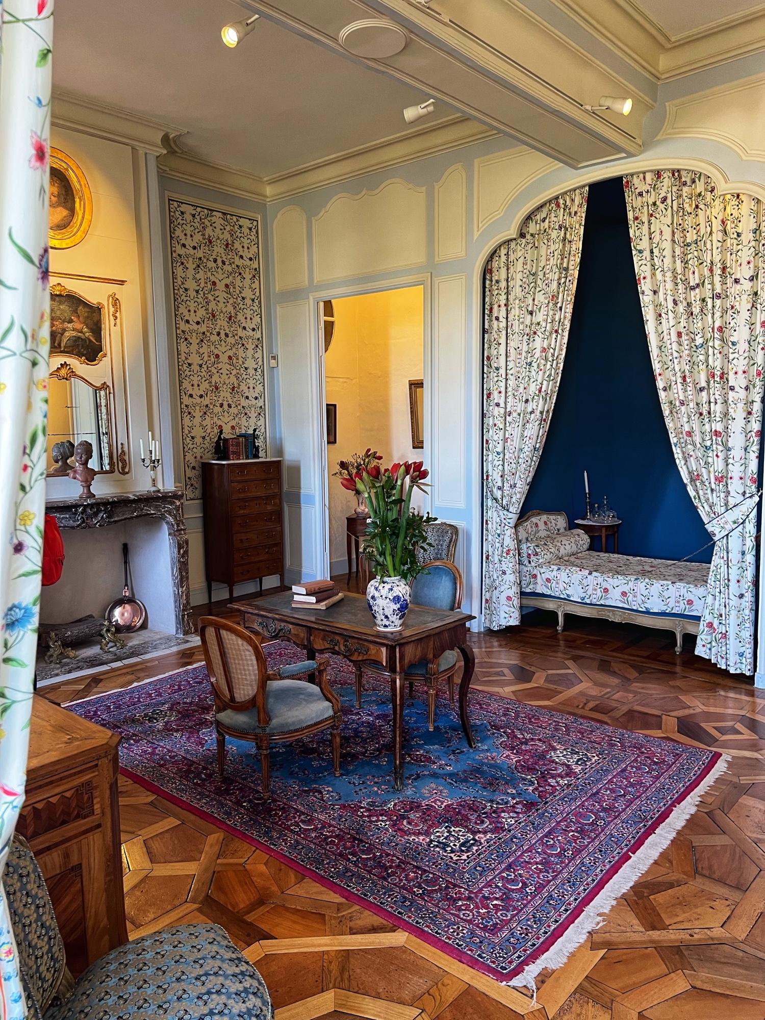 In late April and early May, the wisteria will be fabulous here. Take note of the billiard room – something you don’t see often in these châteaux – as well as the ornate wooden detailing on furniture and doorways.