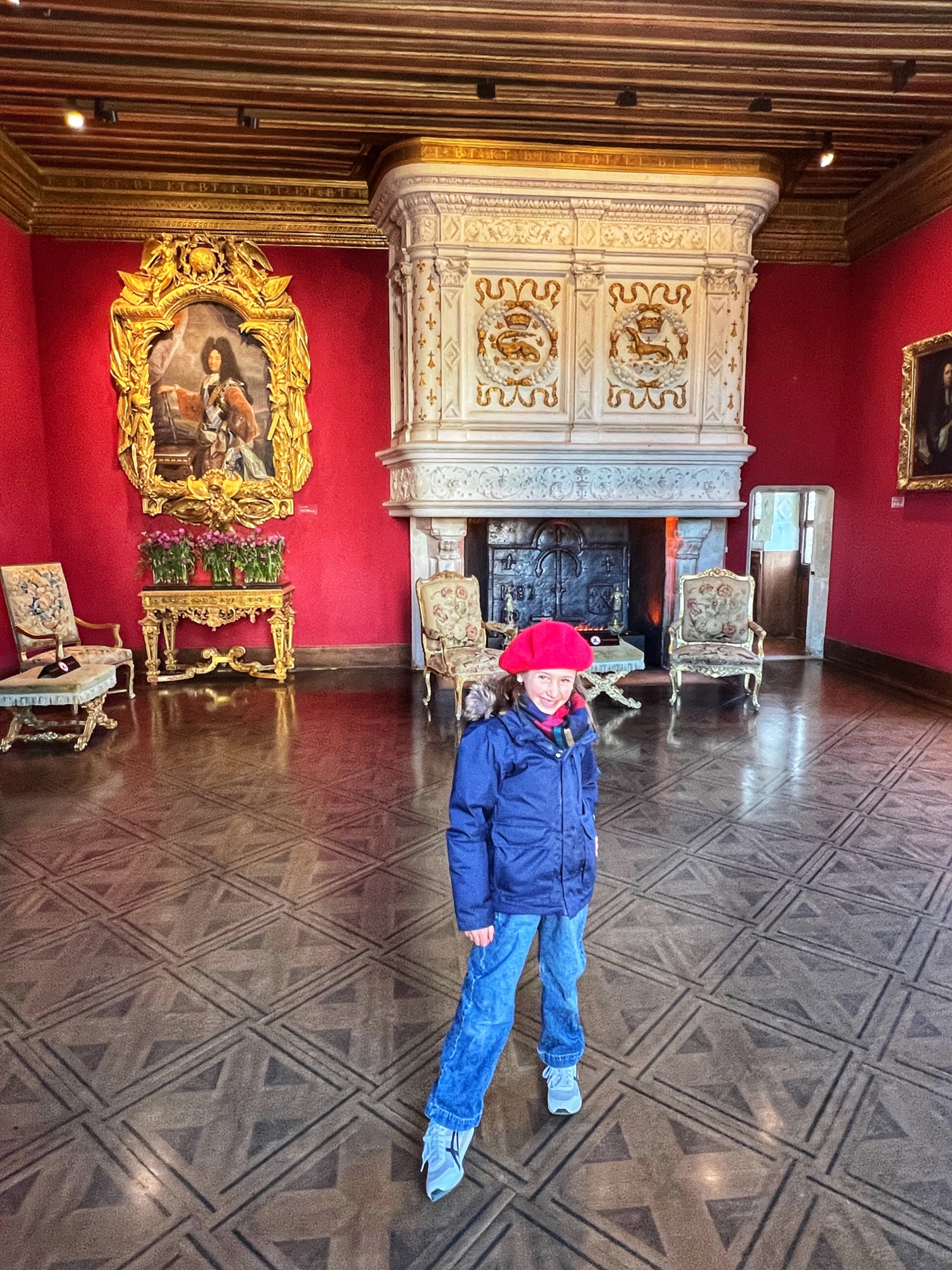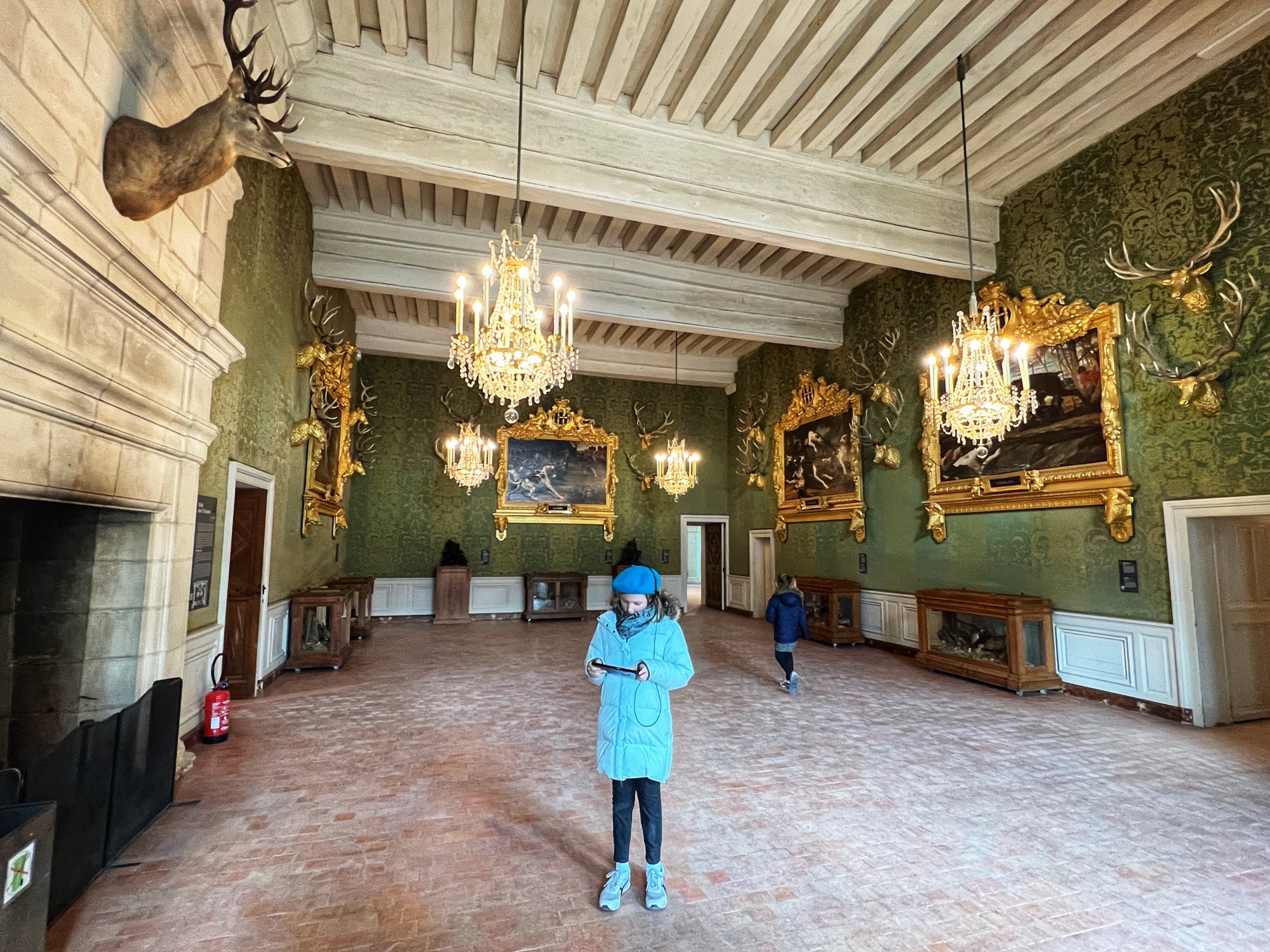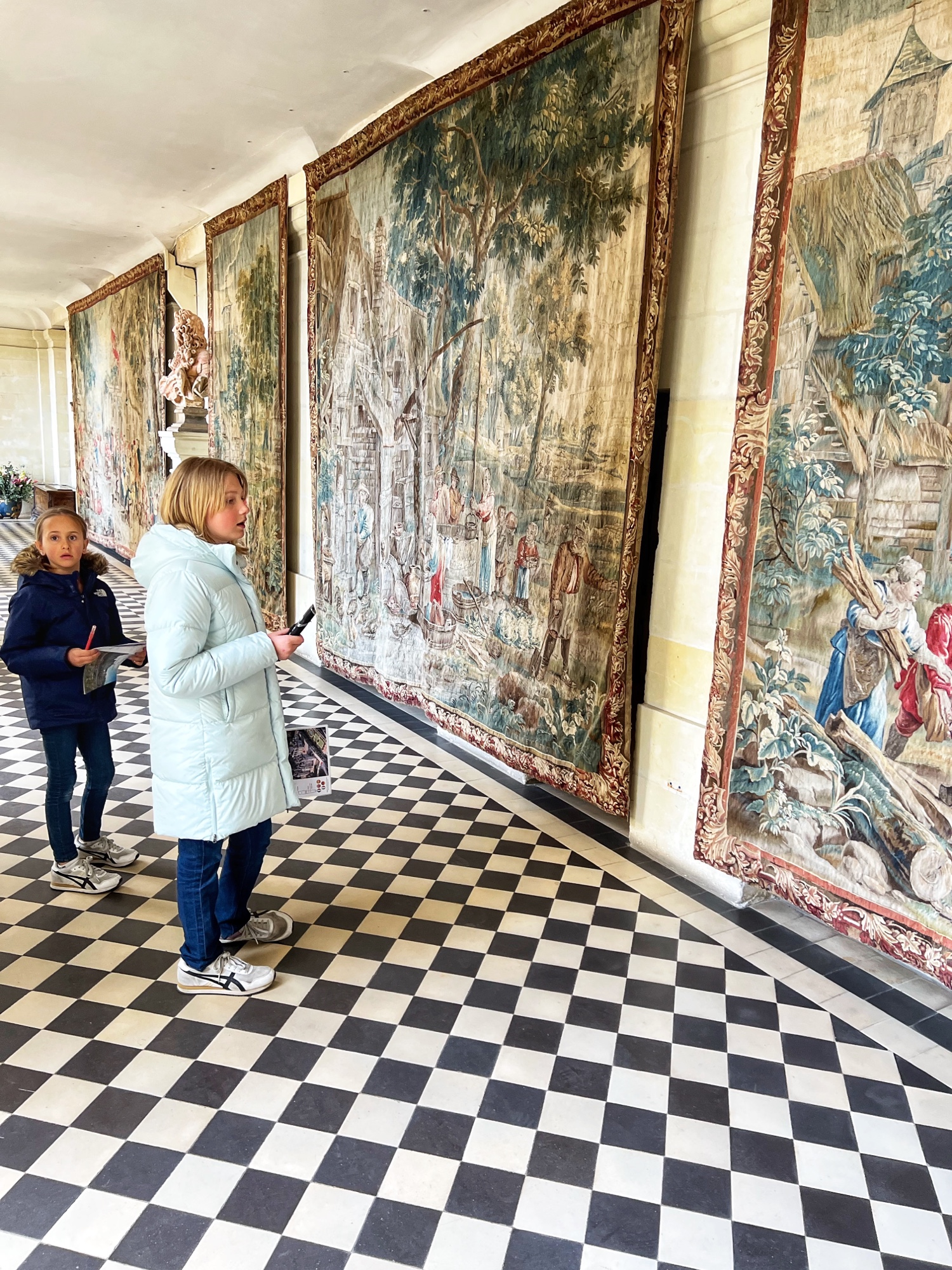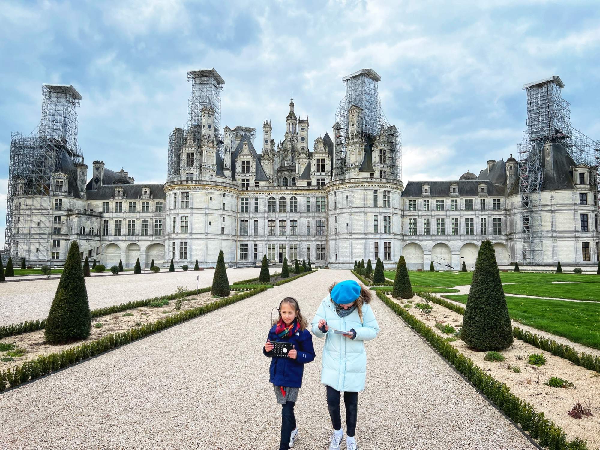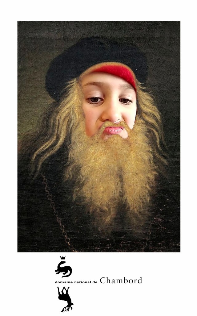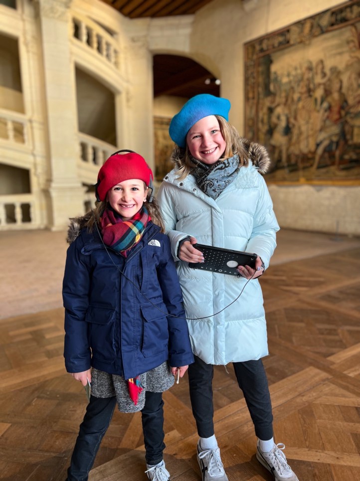 The Histopad was a big hit at Chambord for the kids, bringing the castle to life in each room. If you have never seen a Histopad before, the screen shows what the room would have looked like hundreds of years ago. Also there is a little challenge where you can find hidden coins in the virtual rooms and collect them all for the chance to make silly selfies like this one of Leonardo DaVinci. Some Histopads have audio and some don’t. This particular Histopad had headphones and an audioguide. There was also a room dedicated to a series of informational films with screens in various languages. It was great! The kids also enjoyed the little riddle book they worked on together (in French only) but I’m not sure it’s worth €4. I love Chambord, but I wasn’t impressed with how they nickel and dime patrons. At many castles the audioguides and Histopads are included in the ticket price. We always appreciated that! Another option if you don’t want to tour the castle yourself is to join a tour. Of course this is an extra cost, but if you don’t have children with you, there is no better way to get an earful of history than from a tour guide. With kids, though, I think the Histopad and riddle booklet are the way to go. It certainly kept my girls engaged!