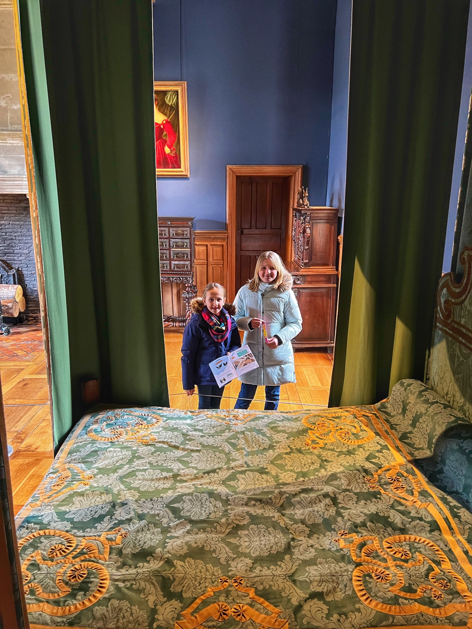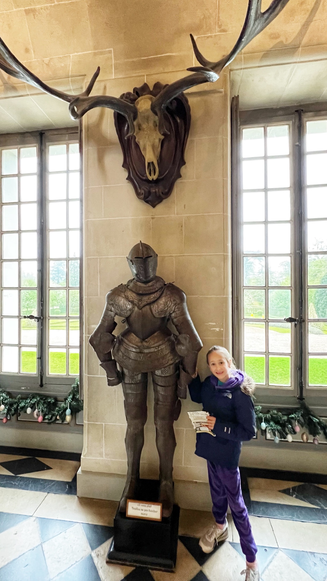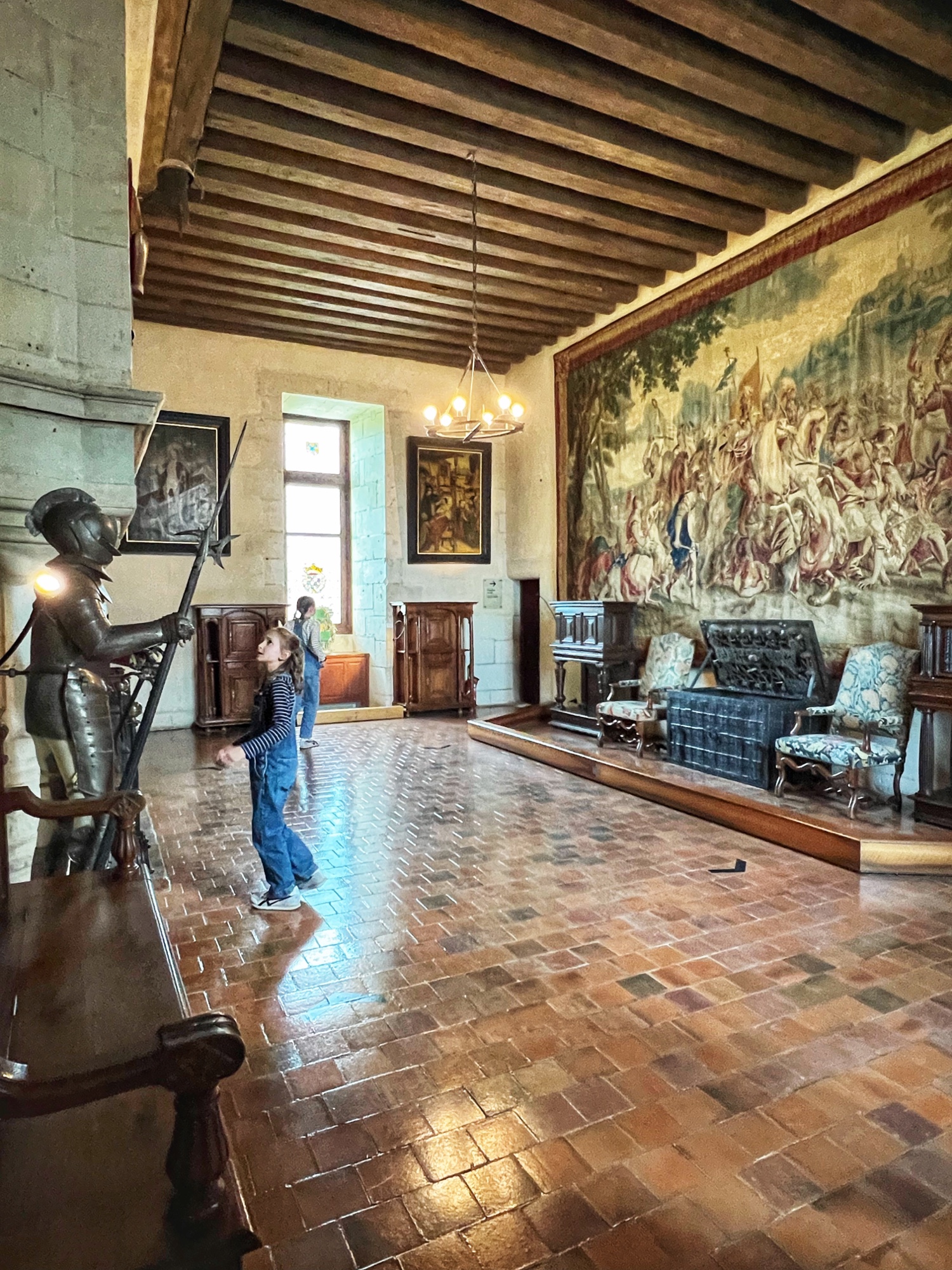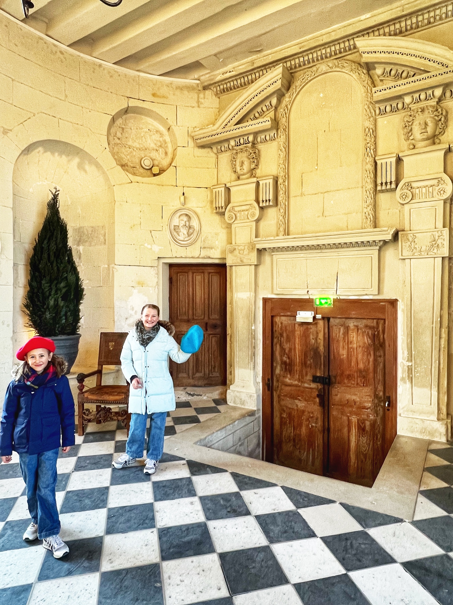 The Histopad was a big hit at Chambord for the kids, bringing the castle to life in each room. If you have never seen a Histopad before, the screen shows what the room would have looked like hundreds of years ago. Also there is a little challenge where you can find hidden coins in the virtual rooms and collect them all for the chance to make silly selfies like this one of Leonardo DaVinci. Some Histopads have audio and some don’t. This particular Histopad had headphones and an audioguide. There was also a room dedicated to a series of informational films with screens in various languages. It was great! The kids also enjoyed the little riddle book they worked on together (in French only) but I’m not sure it’s worth €4. I love Chambord, but I wasn’t impressed with how they nickel and dime patrons. At many castles the audioguides and Histopads are included in the ticket price. We always appreciated that! Another option if you don’t want to tour the castle yourself is to join a tour. Of course this is an extra cost, but if you don’t have children with you, there is no better way to get an earful of history than from a tour guide. With kids, though, I think the Histopad and riddle booklet are the way to go. It certainly kept my girls engaged!