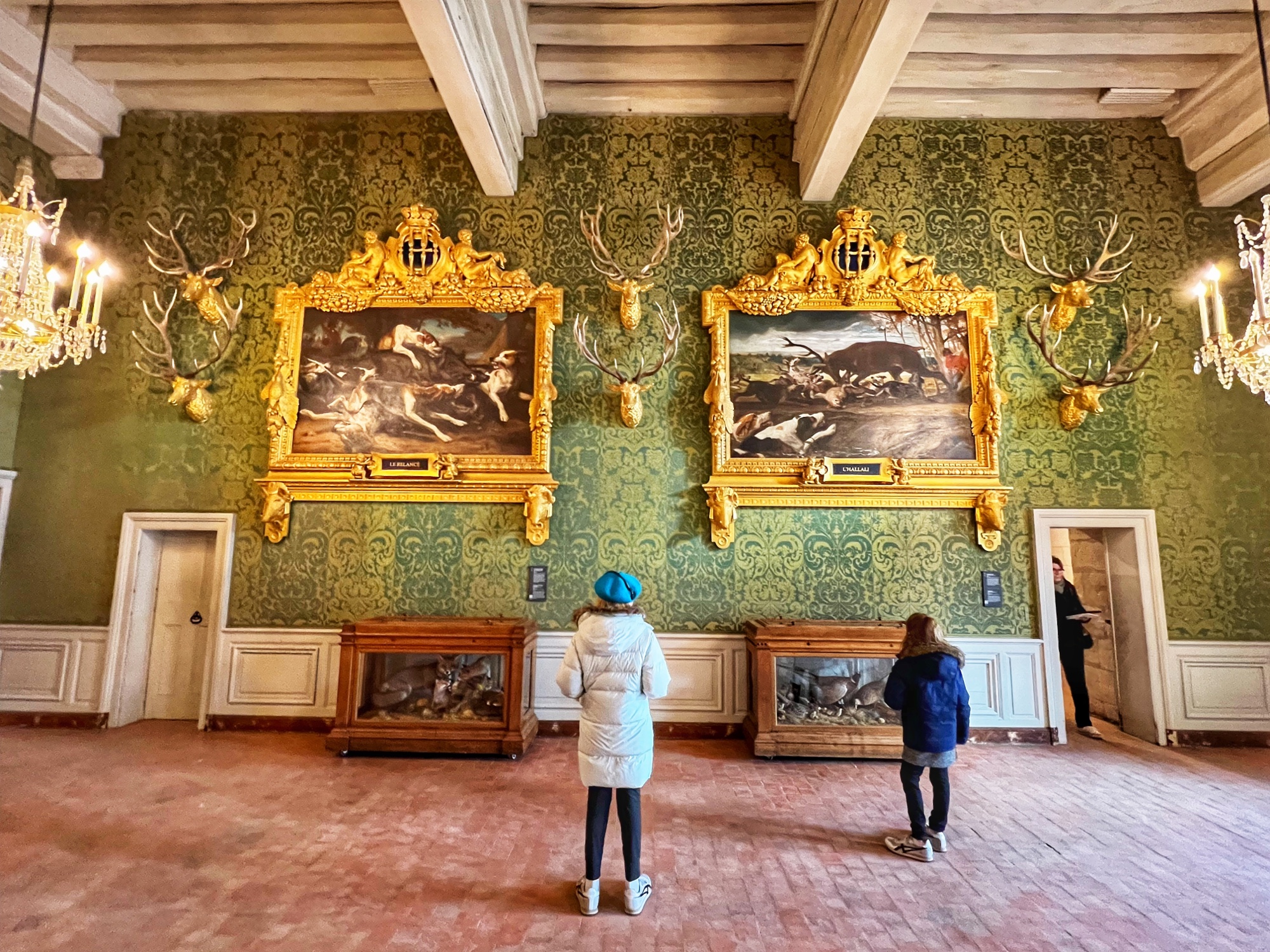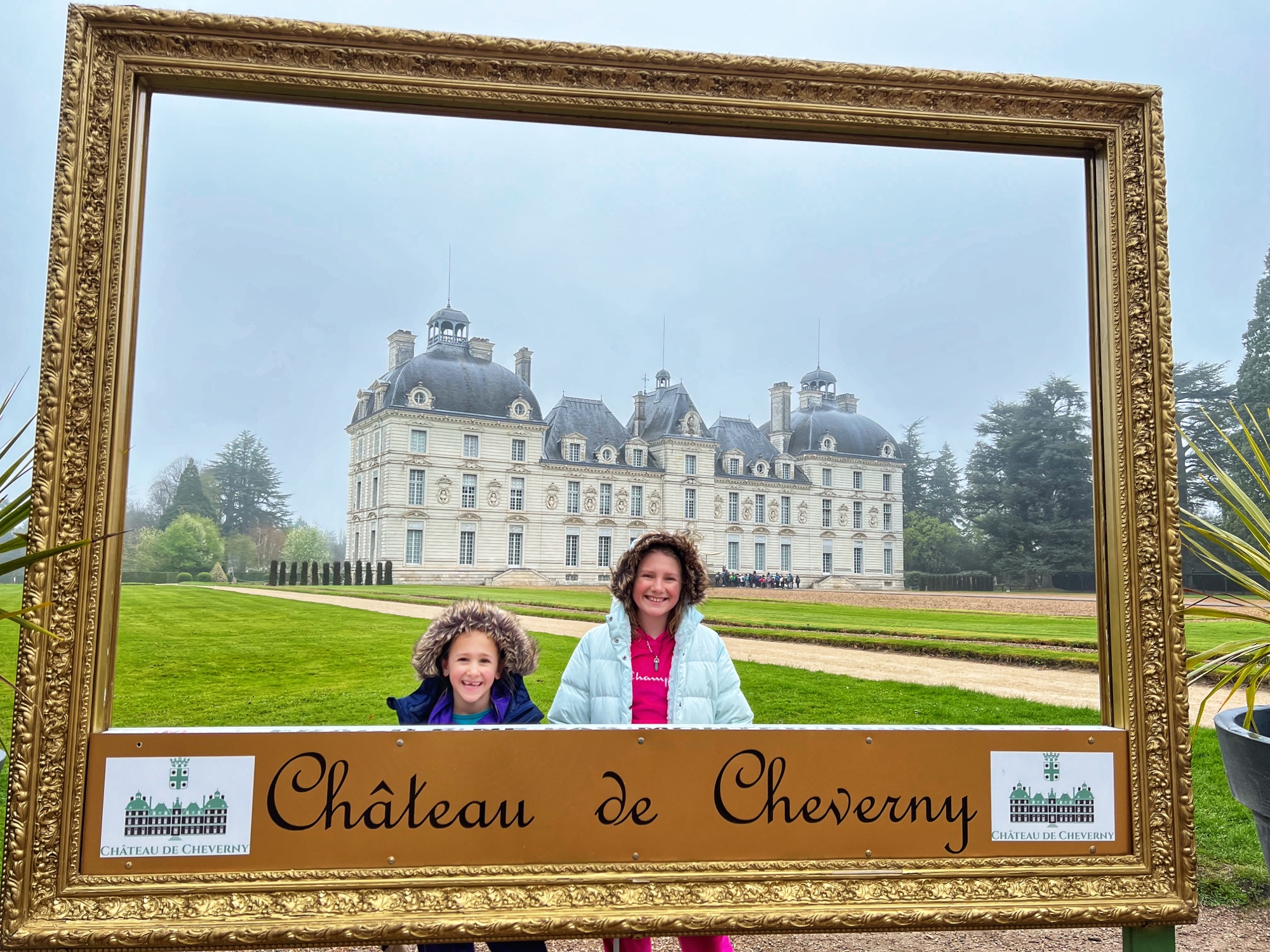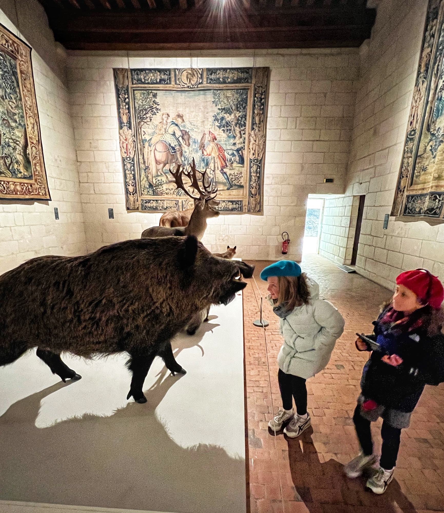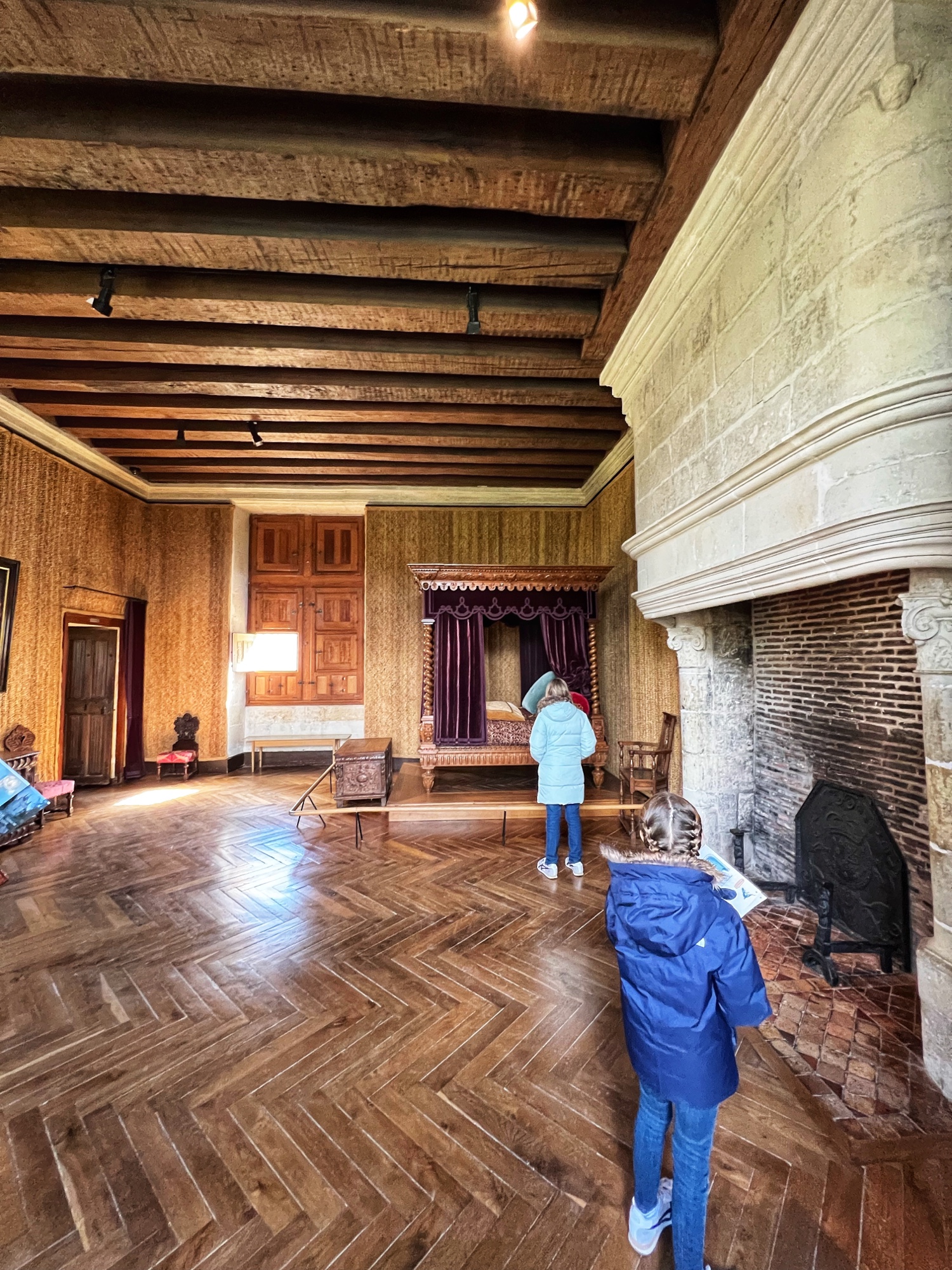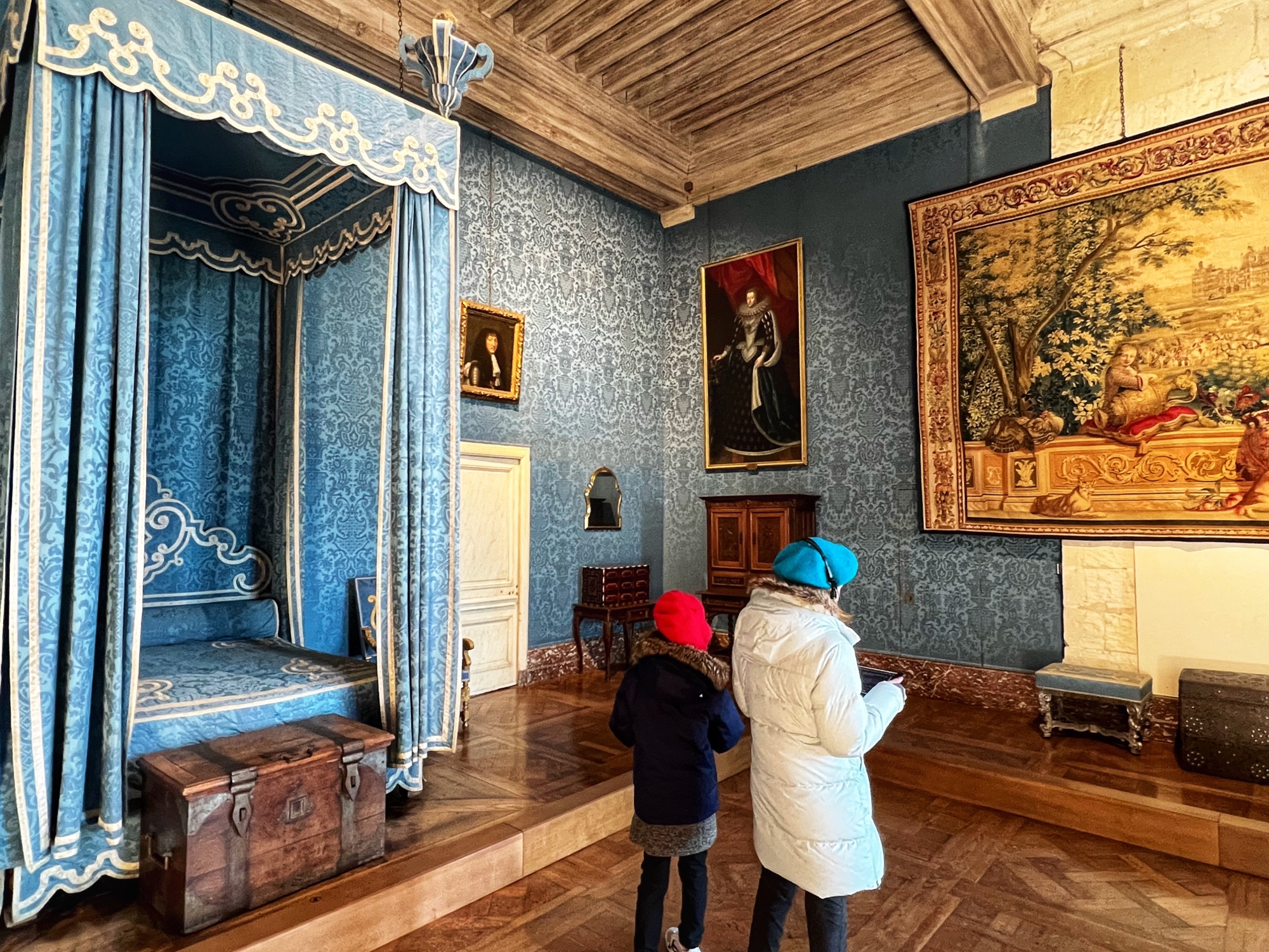 The Histopad was a big hit at Chambord for the kids, bringing the castle to life in each room. If you have never seen a Histopad before, the screen shows what the room would have looked like hundreds of years ago. Also there is a little challenge where you can find hidden coins in the virtual rooms and collect them all for the chance to make silly selfies like this one of Leonardo DaVinci. Some Histopads have audio and some don’t. This particular Histopad had headphones and an audioguide. There was also a room dedicated to a series of informational films with screens in various languages. It was great! The kids also enjoyed the little riddle book they worked on together (in French only) but I’m not sure it’s worth €4. I love Chambord, but I wasn’t impressed with how they nickel and dime patrons. At many castles the audioguides and Histopads are included in the ticket price. We always appreciated that! Another option if you don’t want to tour the castle yourself is to join a tour. Of course this is an extra cost, but if you don’t have children with you, there is no better way to get an earful of history than from a tour guide. With kids, though, I think the Histopad and riddle booklet are the way to go. It certainly kept my girls engaged!