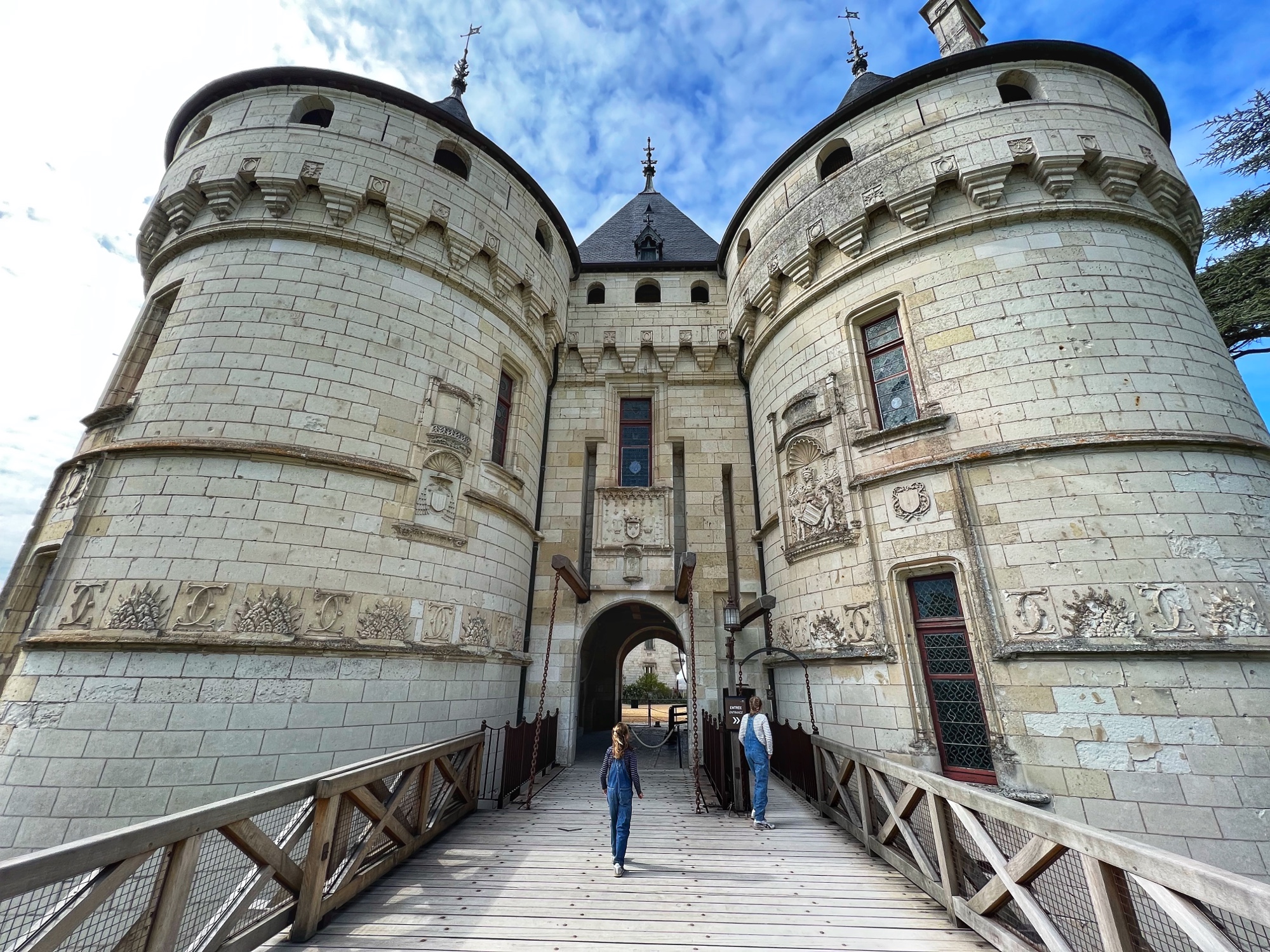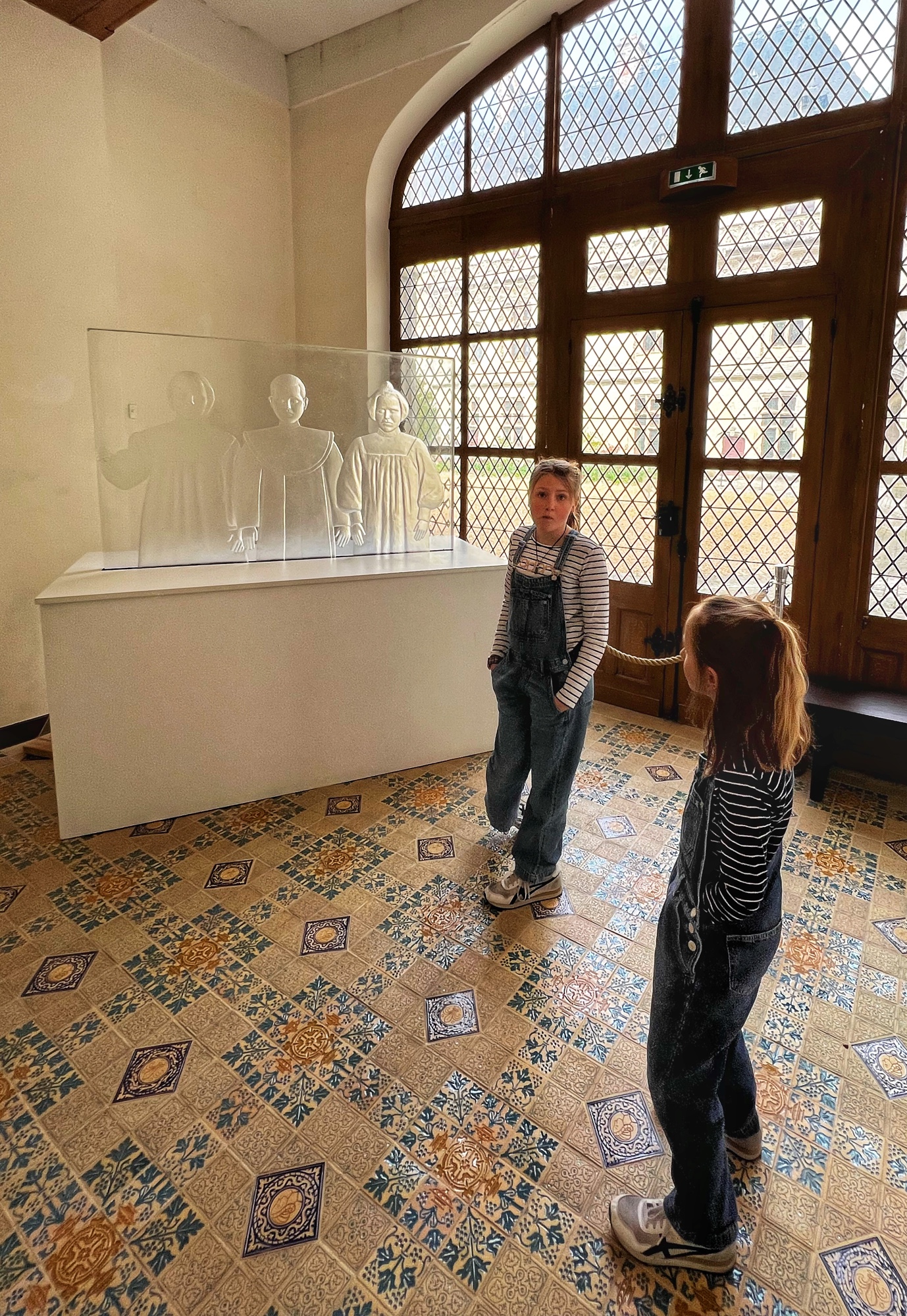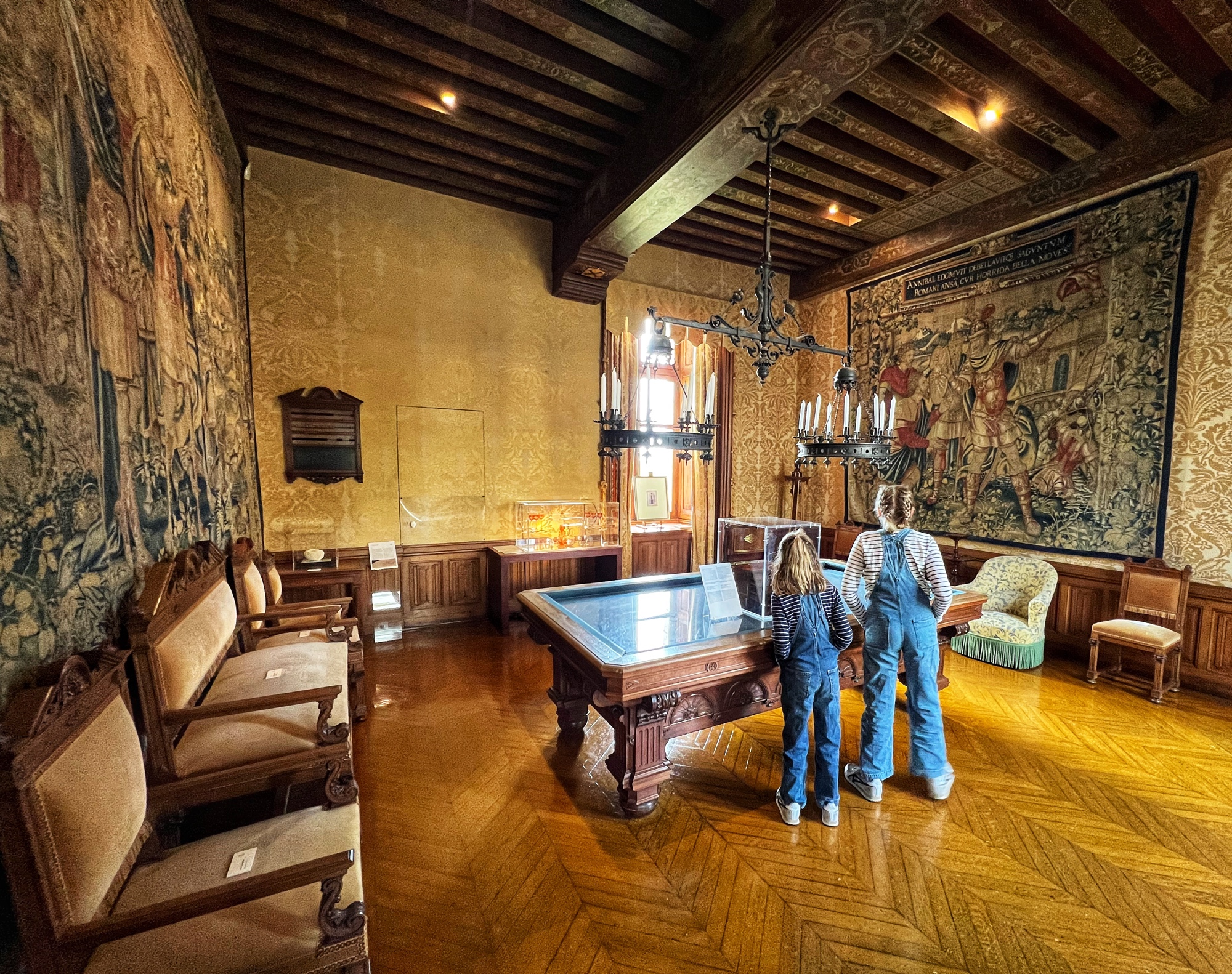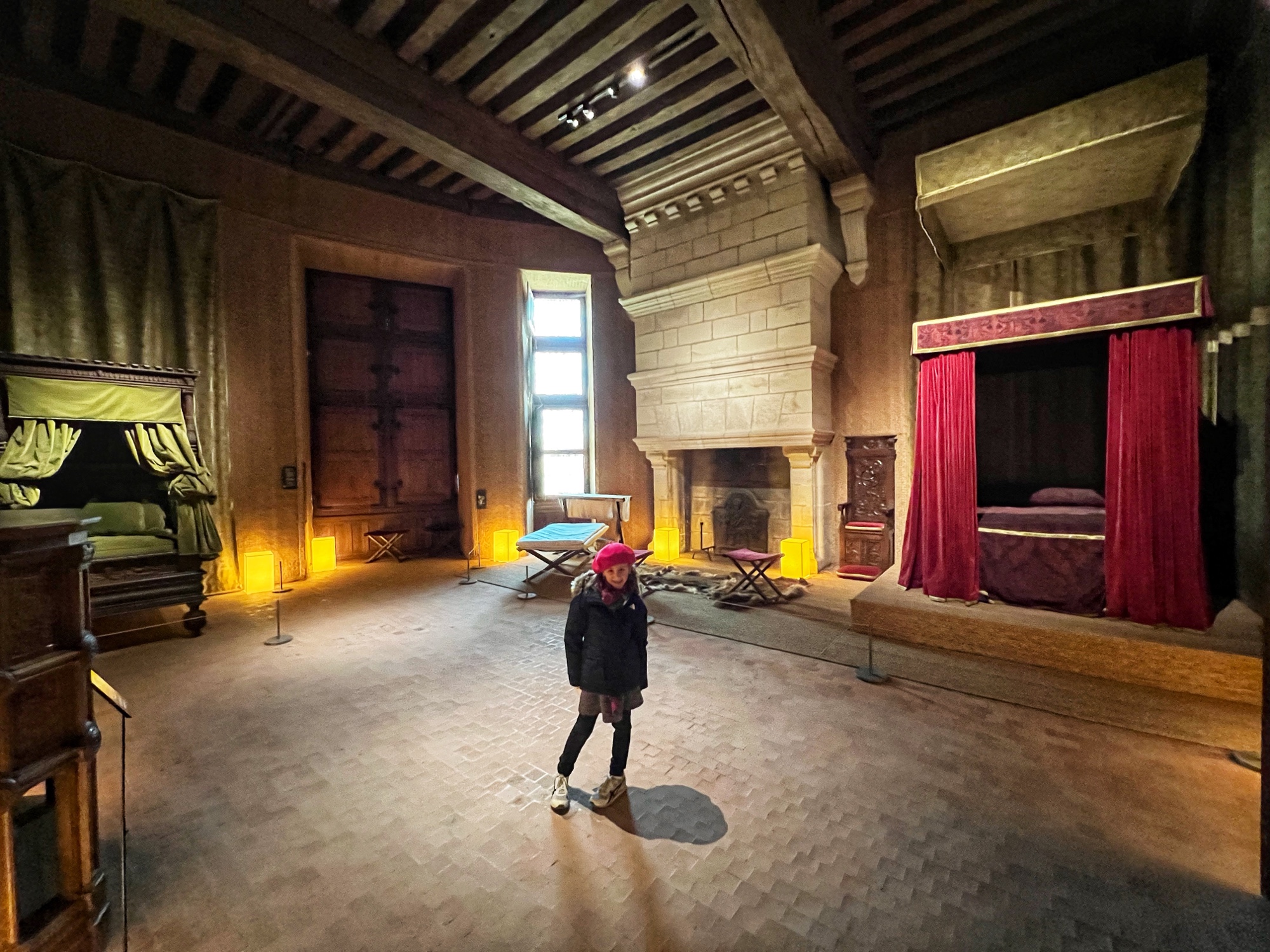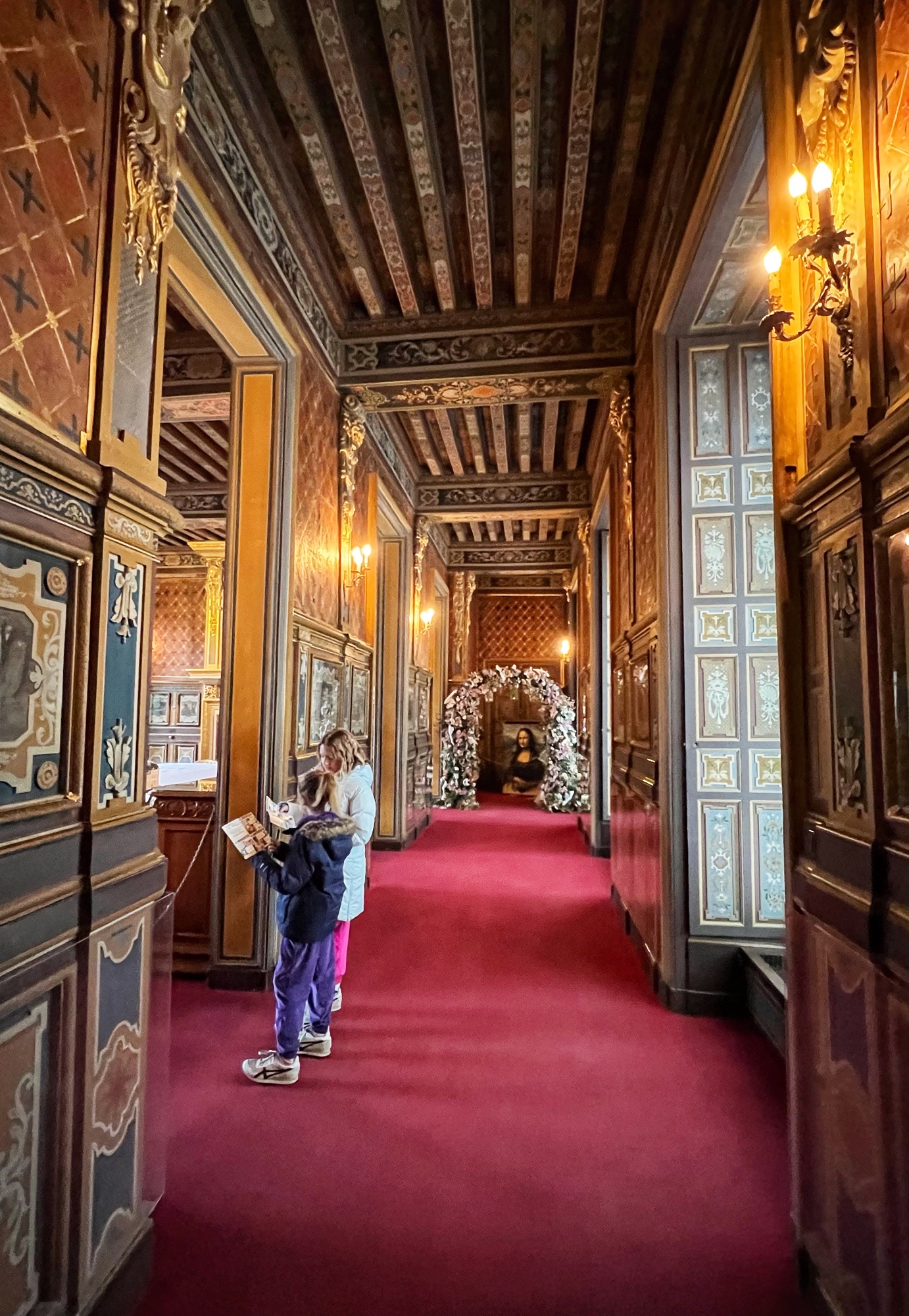 The Histopad was a big hit at Chambord for the kids, bringing the castle to life in each room. If you have never seen a Histopad before, the screen shows what the room would have looked like hundreds of years ago. Also there is a little challenge where you can find hidden coins in the virtual rooms and collect them all for the chance to make silly selfies like this one of Leonardo DaVinci. Some Histopads have audio and some don’t. This particular Histopad had headphones and an audioguide. There was also a room dedicated to a series of informational films with screens in various languages. It was great! The kids also enjoyed the little riddle book they worked on together (in French only) but I’m not sure it’s worth €4. I love Chambord, but I wasn’t impressed with how they nickel and dime patrons. At many castles the audioguides and Histopads are included in the ticket price. We always appreciated that! Another option if you don’t want to tour the castle yourself is to join a tour. Of course this is an extra cost, but if you don’t have children with you, there is no better way to get an earful of history than from a tour guide. With kids, though, I think the Histopad and riddle booklet are the way to go. It certainly kept my girls engaged!