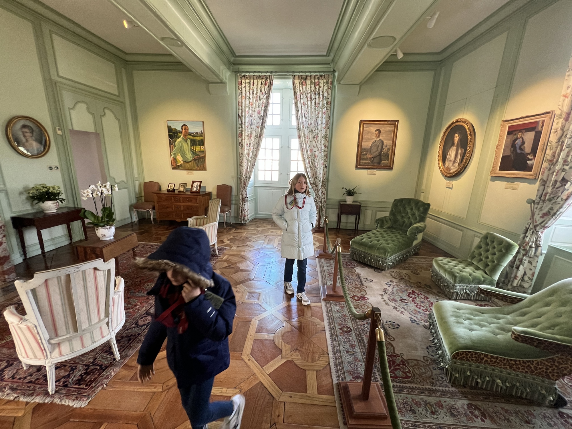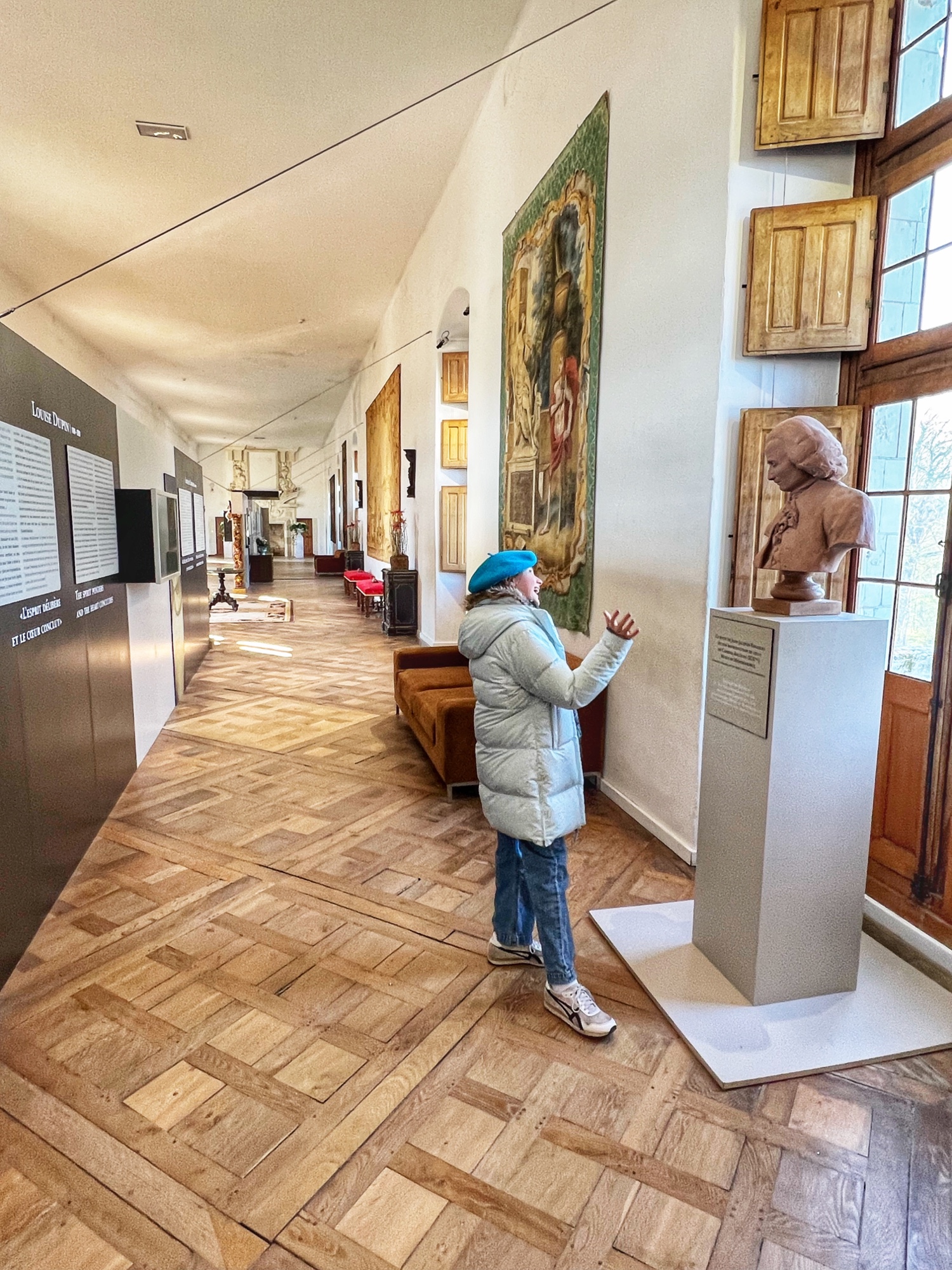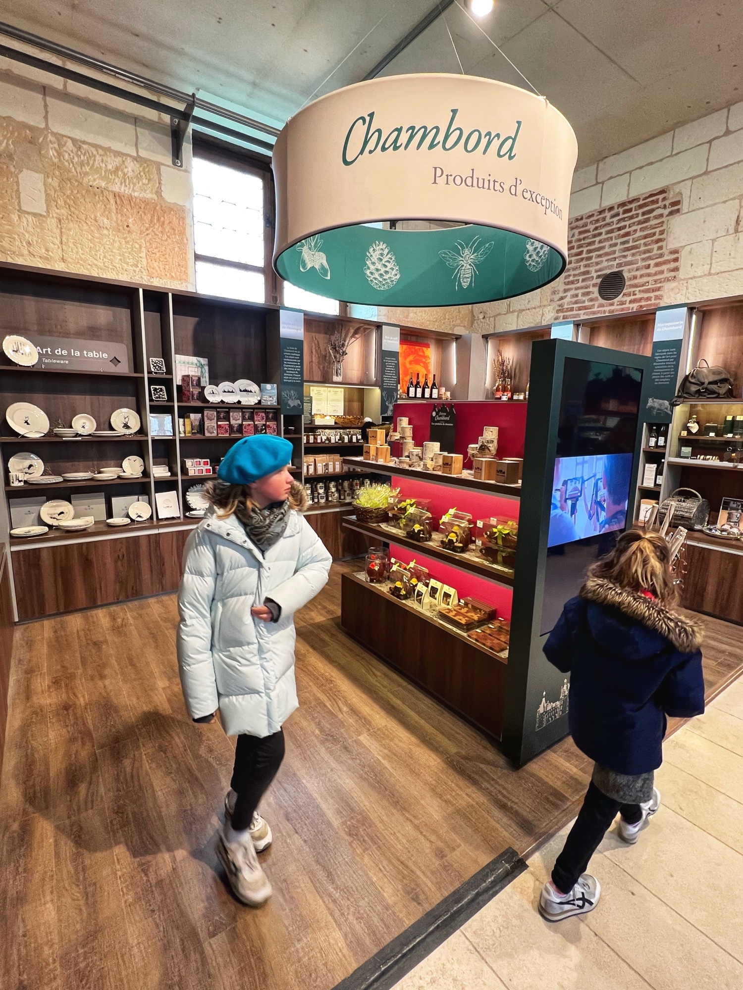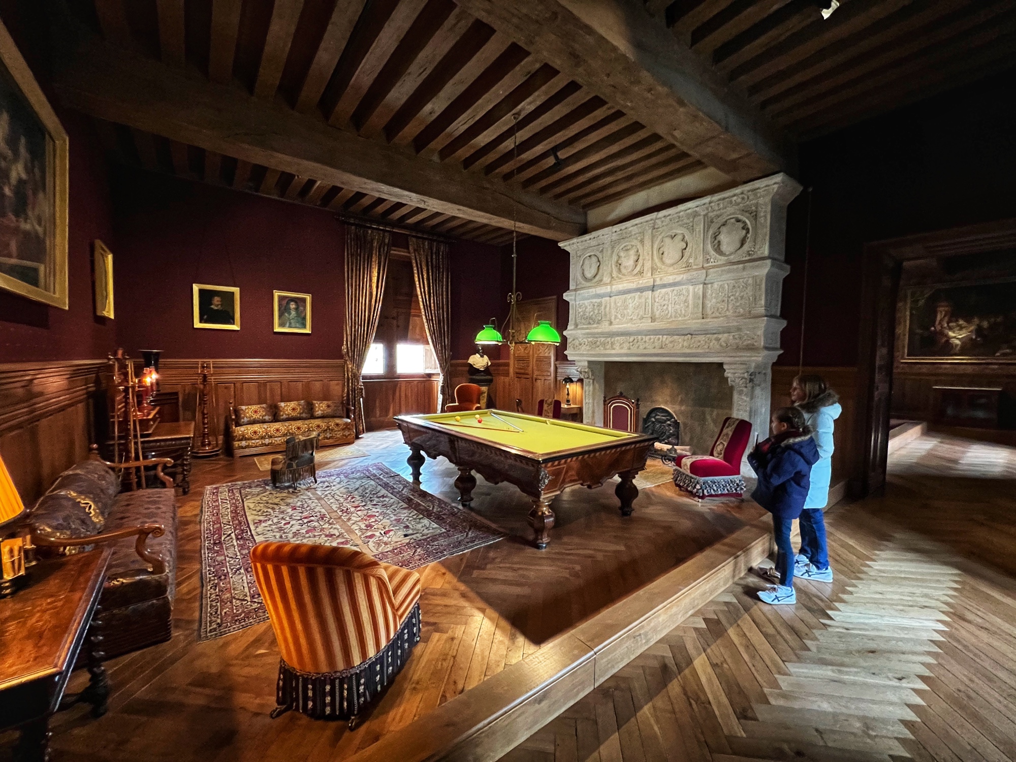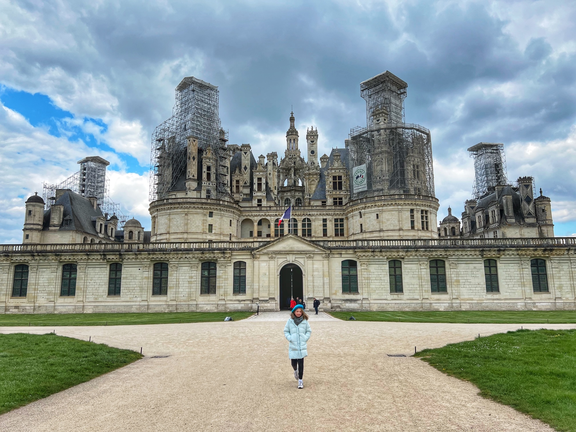 The Histopad was a big hit at Chambord for the kids, bringing the castle to life in each room. If you have never seen a Histopad before, the screen shows what the room would have looked like hundreds of years ago. Also there is a little challenge where you can find hidden coins in the virtual rooms and collect them all for the chance to make silly selfies like this one of Leonardo DaVinci. Some Histopads have audio and some don’t. This particular Histopad had headphones and an audioguide. There was also a room dedicated to a series of informational films with screens in various languages. It was great! The kids also enjoyed the little riddle book they worked on together (in French only) but I’m not sure it’s worth €4. I love Chambord, but I wasn’t impressed with how they nickel and dime patrons. At many castles the audioguides and Histopads are included in the ticket price. We always appreciated that! Another option if you don’t want to tour the castle yourself is to join a tour. Of course this is an extra cost, but if you don’t have children with you, there is no better way to get an earful of history than from a tour guide. With kids, though, I think the Histopad and riddle booklet are the way to go. It certainly kept my girls engaged!