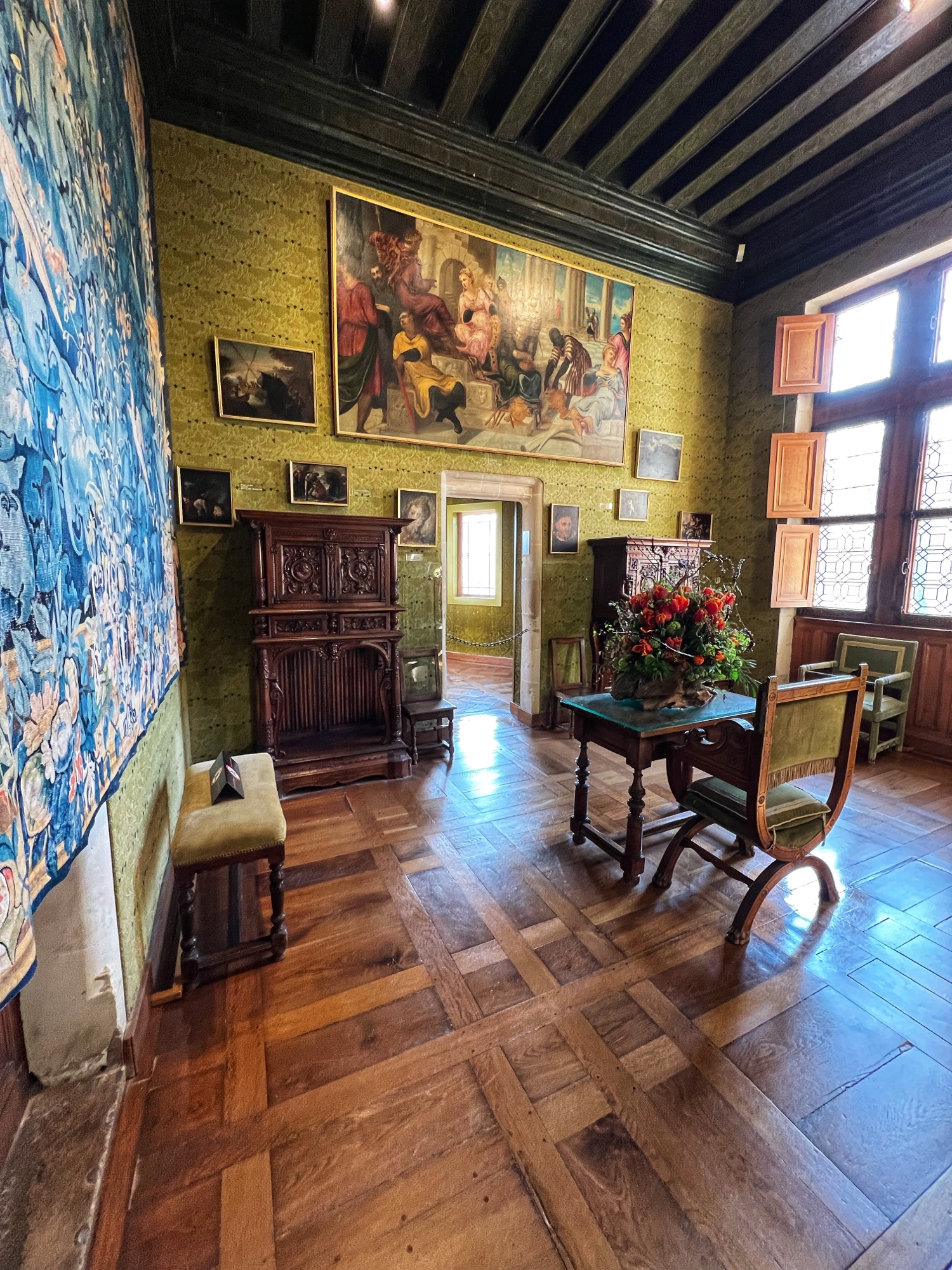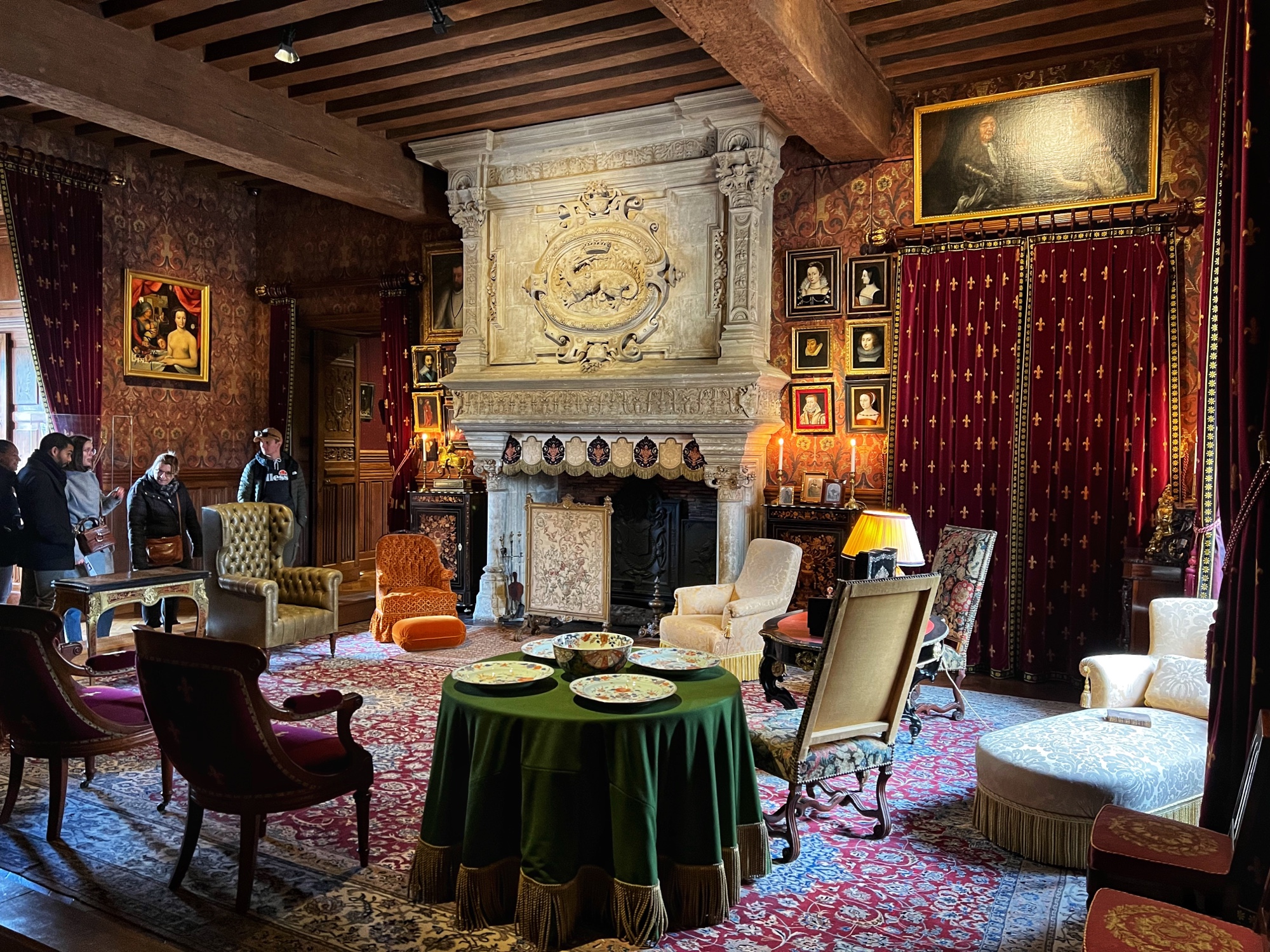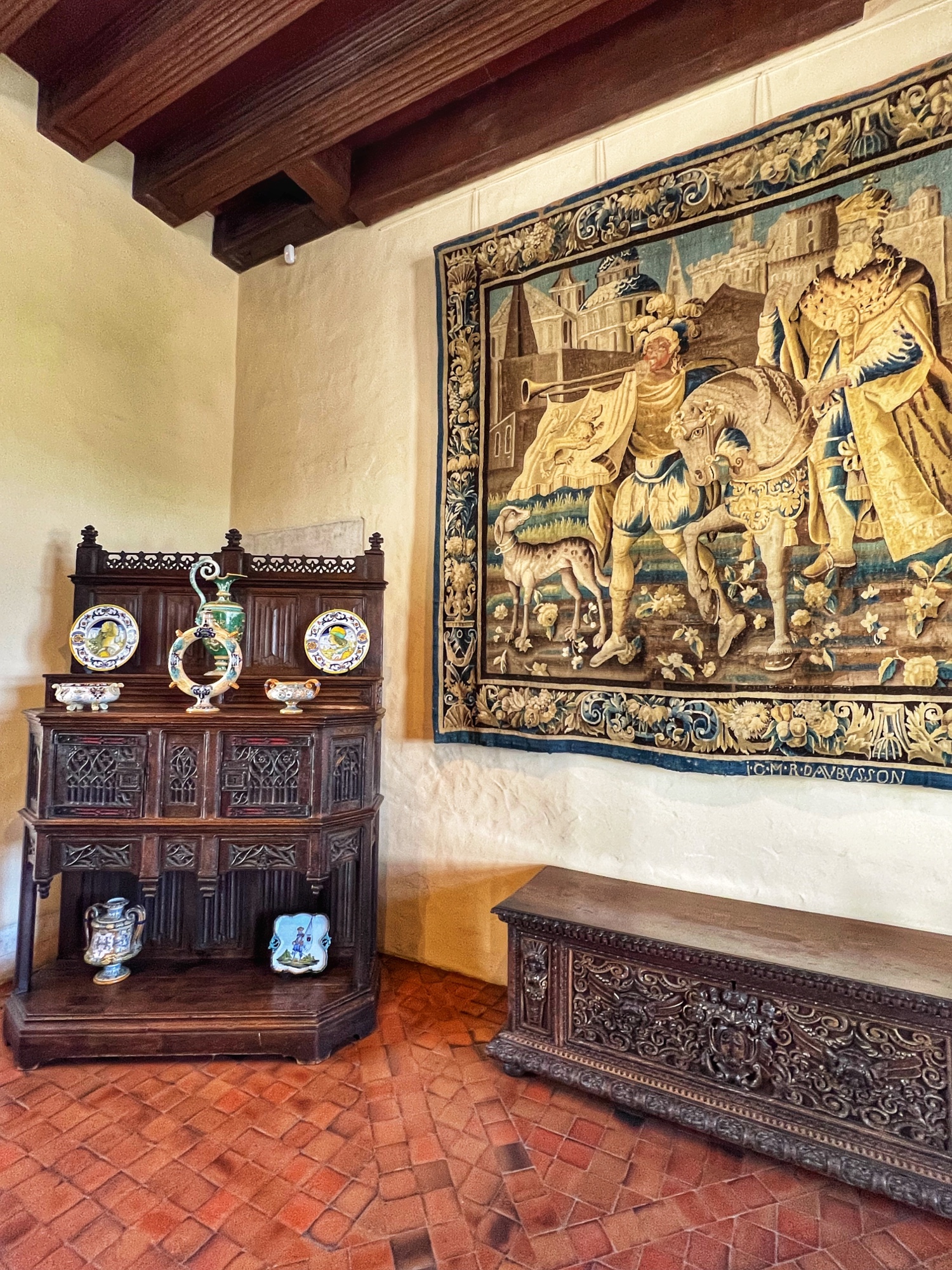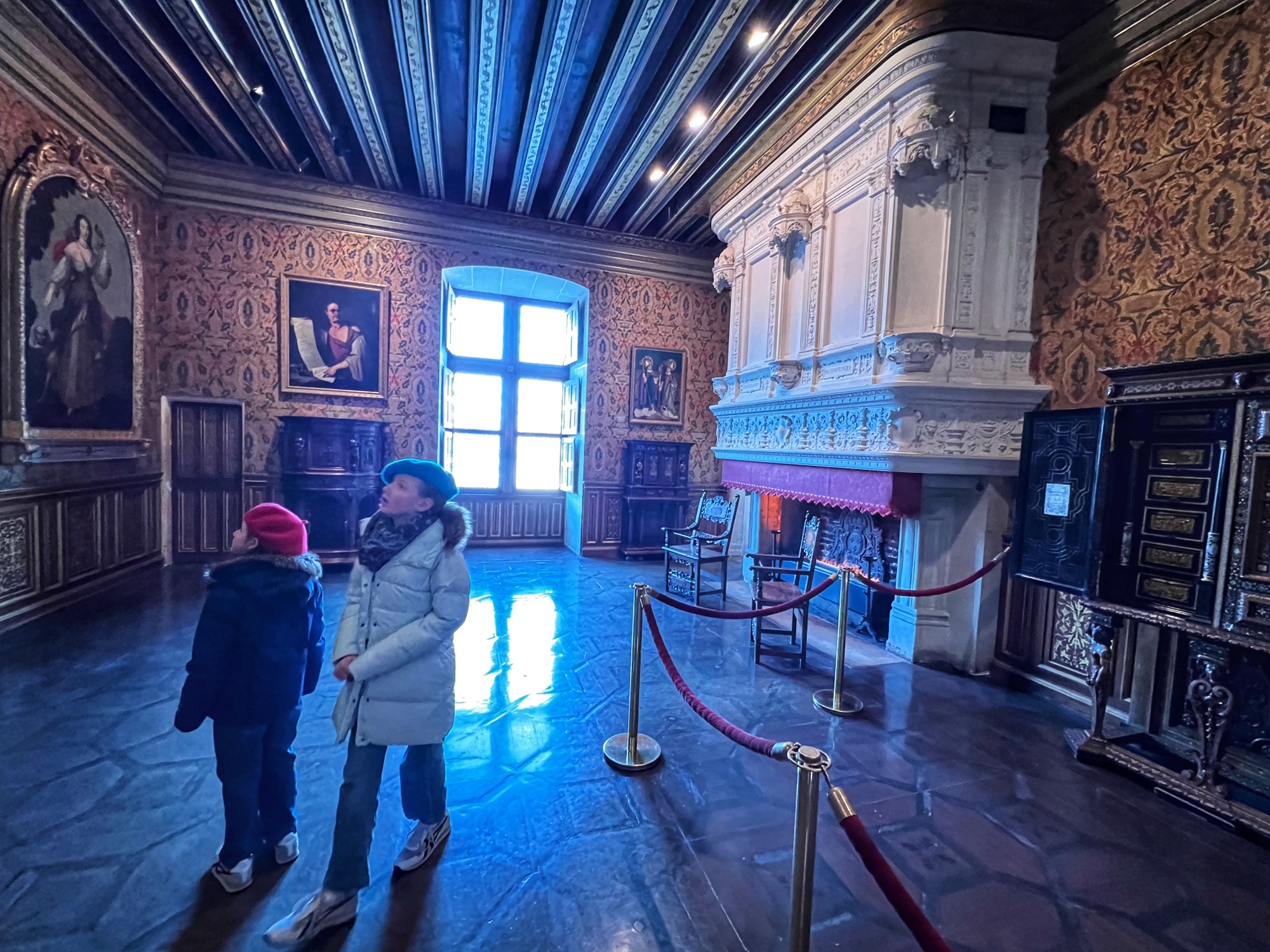 Above is a great view of the Histopad and how it shows a virtual trip through time. The furniture in these rooms were absolutely fabulous – with unbelievable wood carving details. And so colorful! The emblems of Louis XII (porcupine) and Francois 1st (salamander) are evident all through the palace. I loved the up close and personal art collection including busts of all the kings we were learning about, beautiful pottery, and countless paintings.