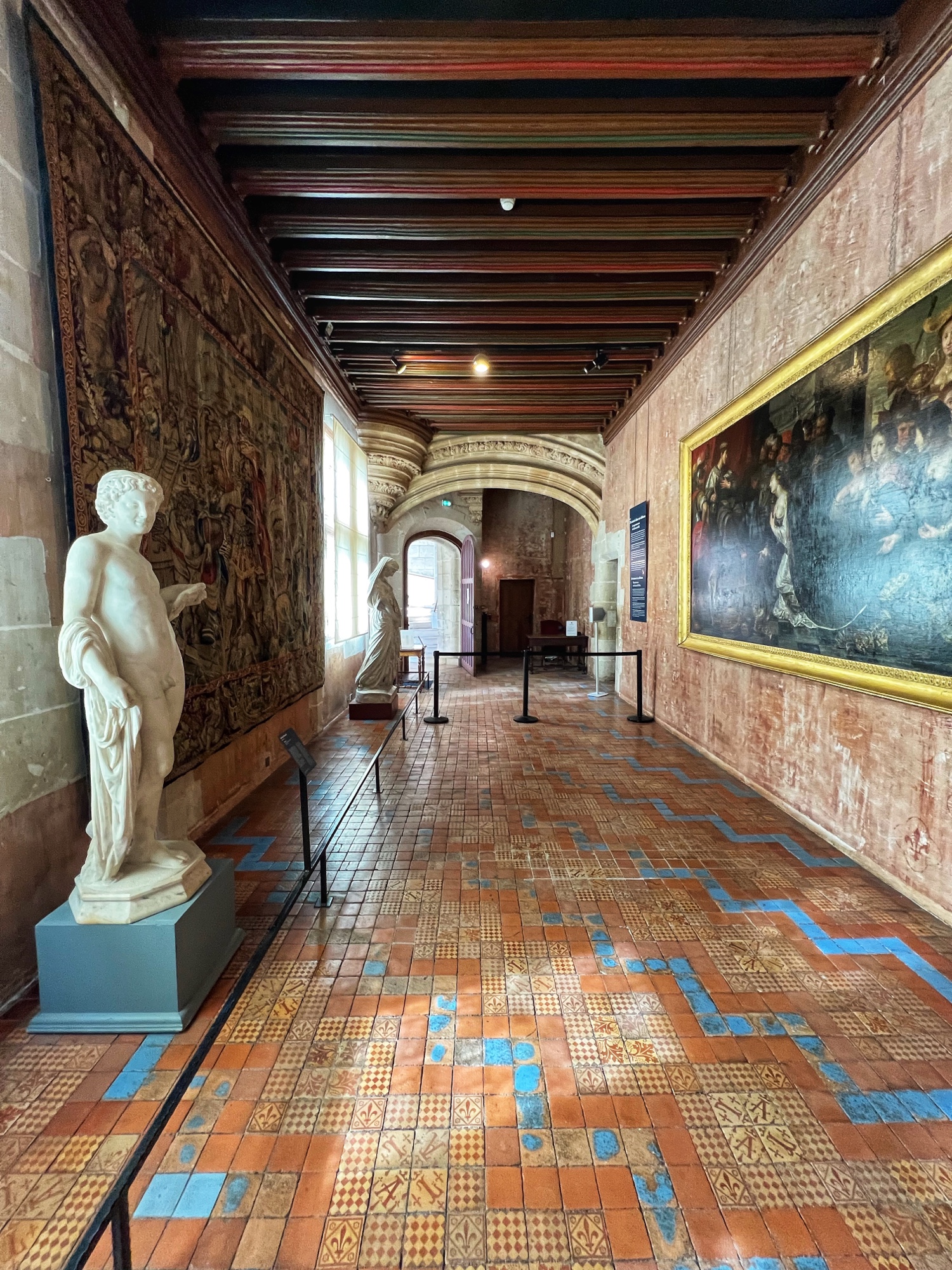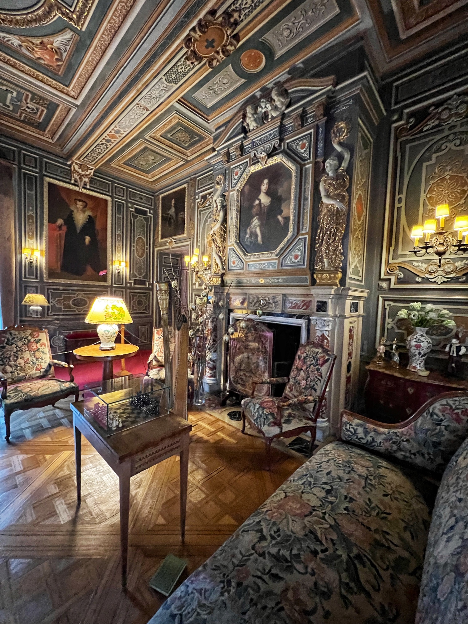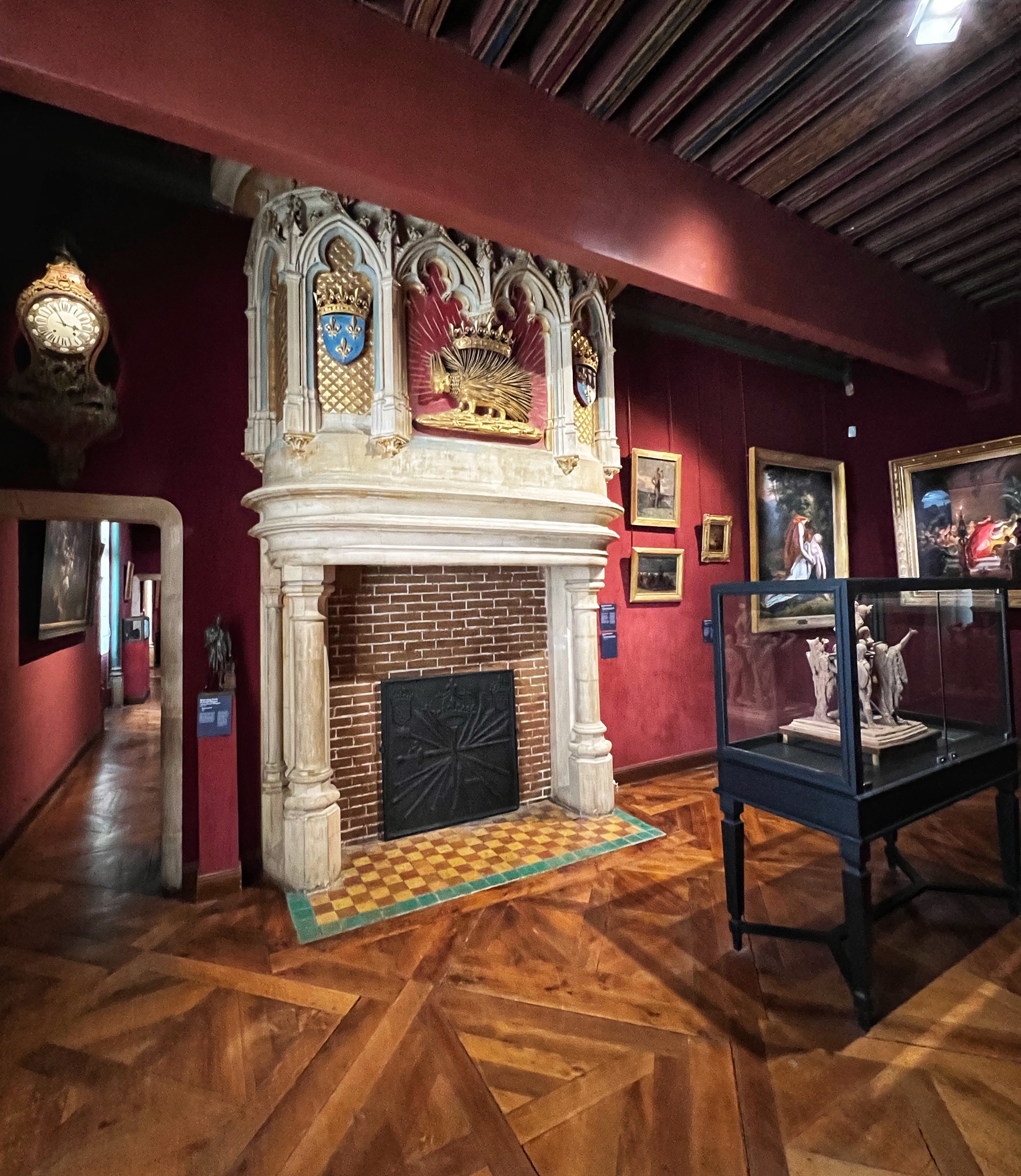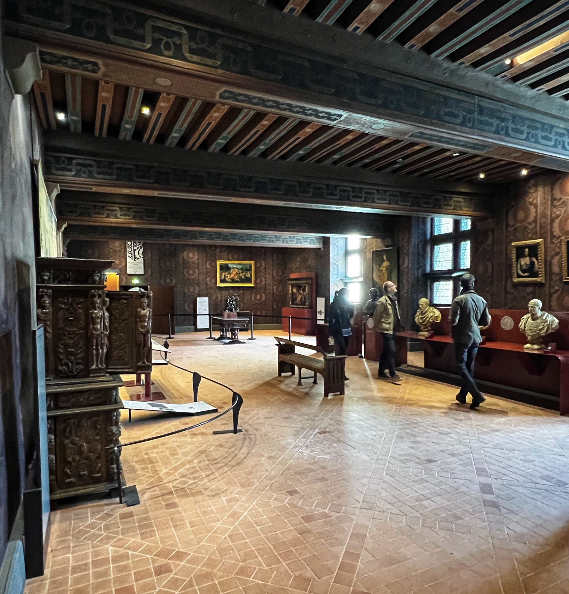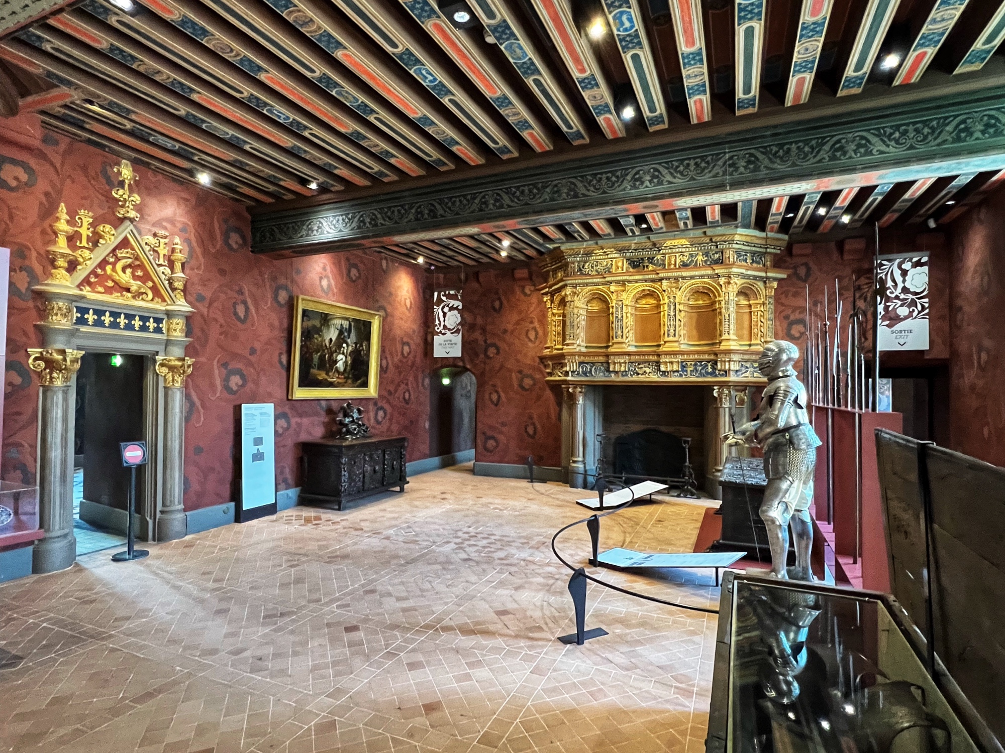 Above is a great view of the Histopad and how it shows a virtual trip through time. The furniture in these rooms were absolutely fabulous – with unbelievable wood carving details. And so colorful! The emblems of Louis XII (porcupine) and Francois 1st (salamander) are evident all through the palace. I loved the up close and personal art collection including busts of all the kings we were learning about, beautiful pottery, and countless paintings.