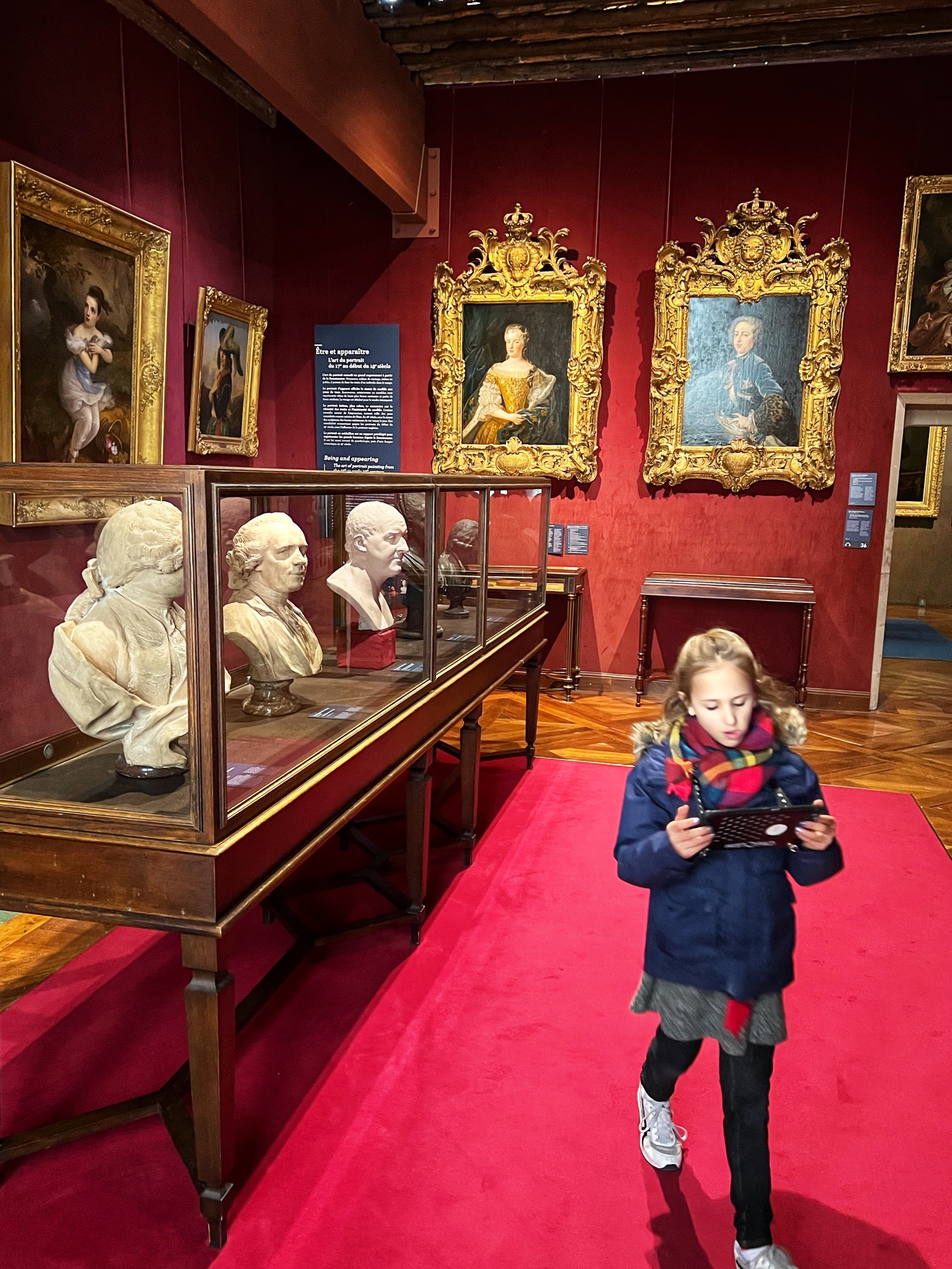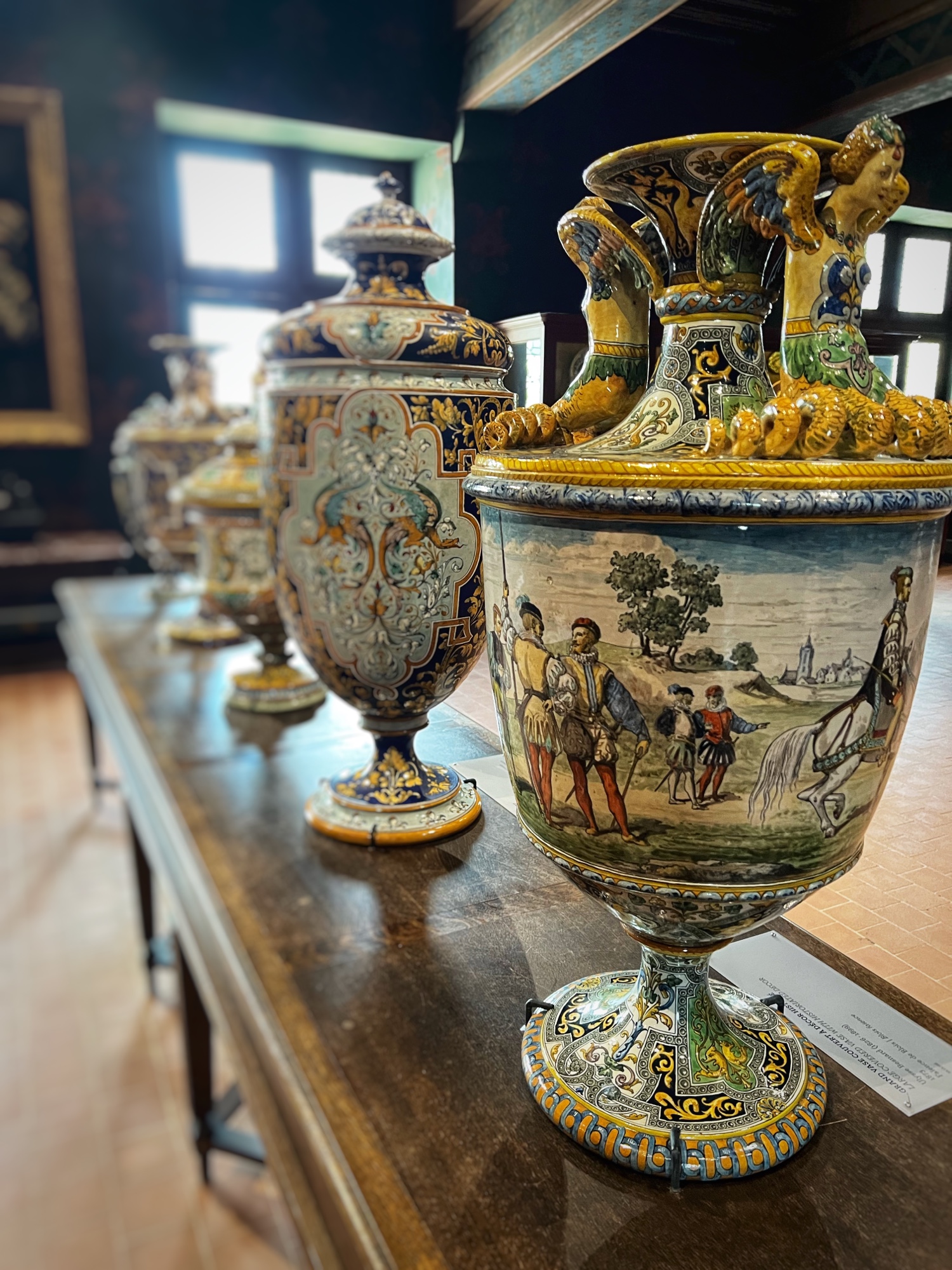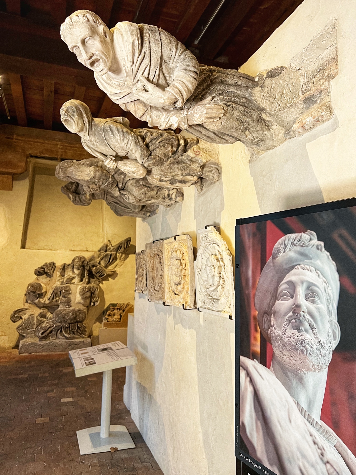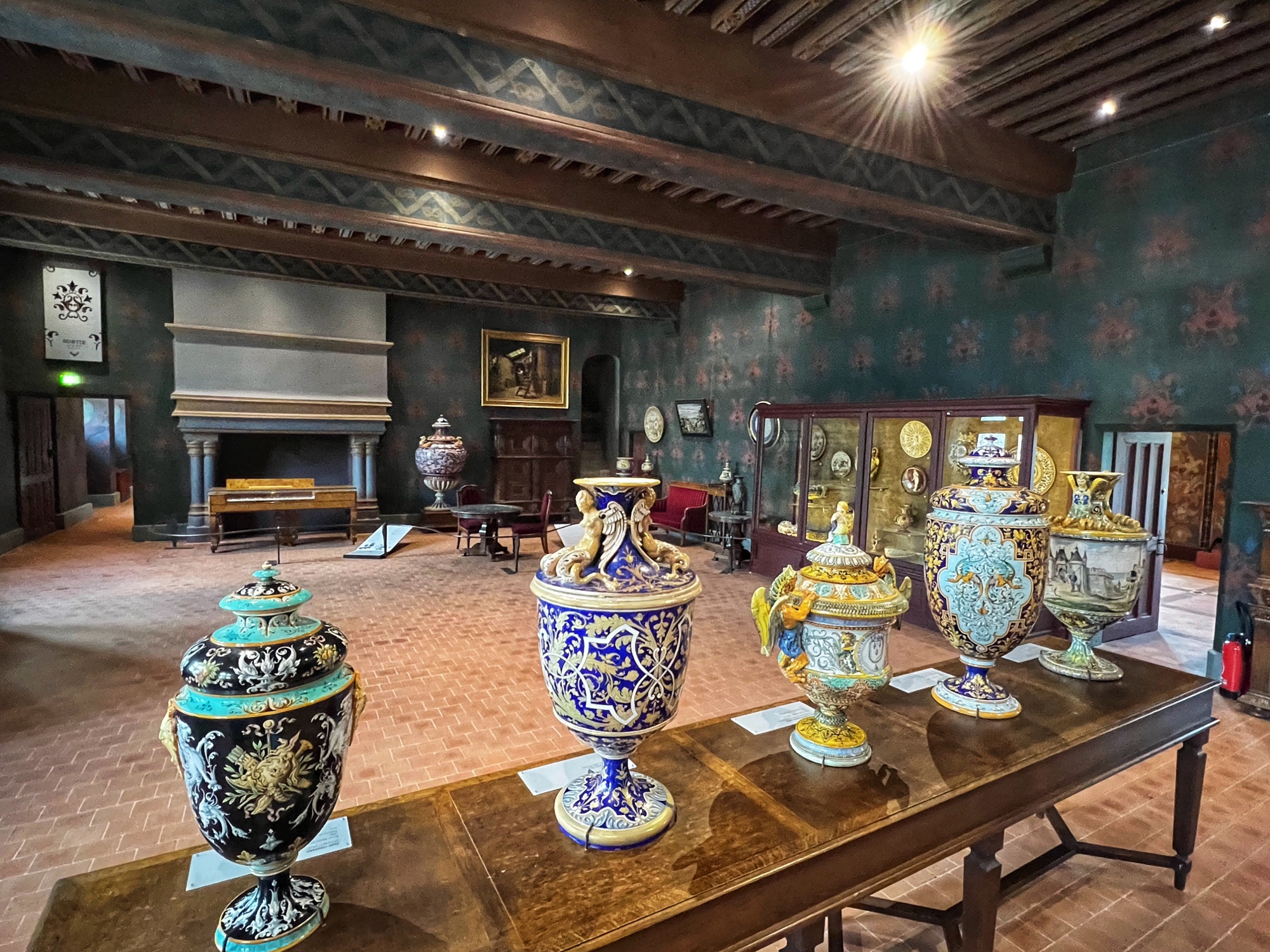 Above is a great view of the Histopad and how it shows a virtual trip through time. The furniture in these rooms were absolutely fabulous – with unbelievable wood carving details. And so colorful! The emblems of Louis XII (porcupine) and Francois 1st (salamander) are evident all through the palace. I loved the up close and personal art collection including busts of all the kings we were learning about, beautiful pottery, and countless paintings.