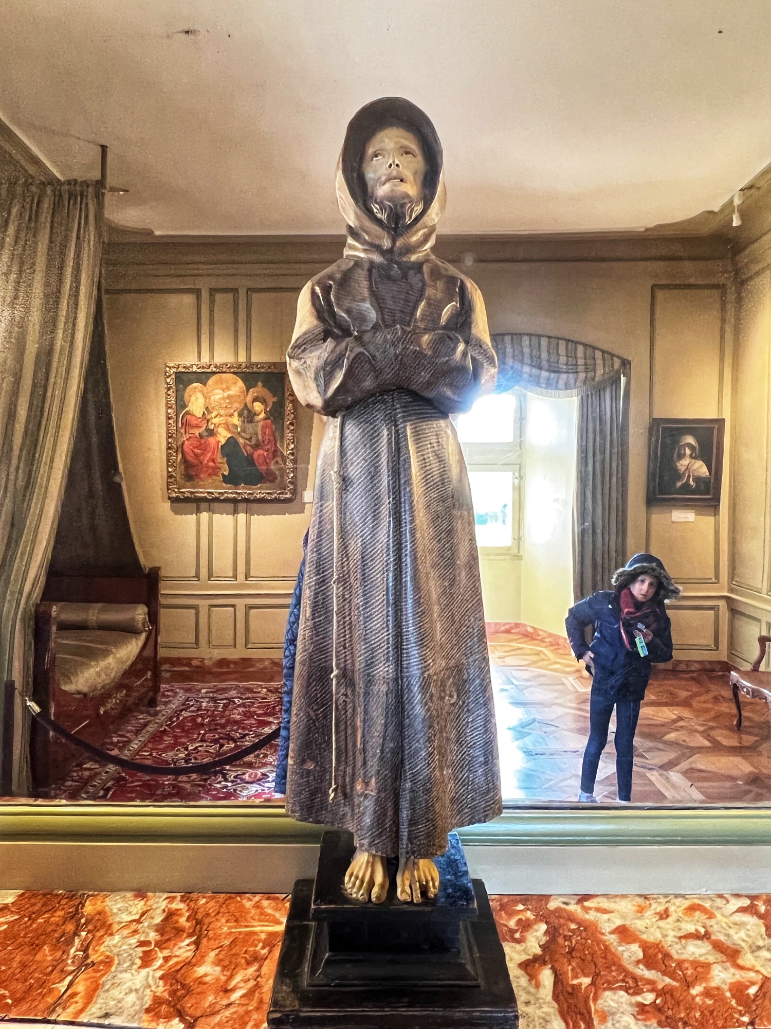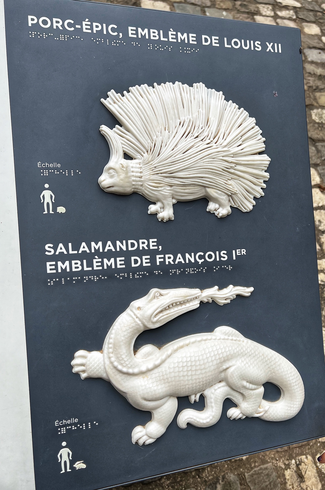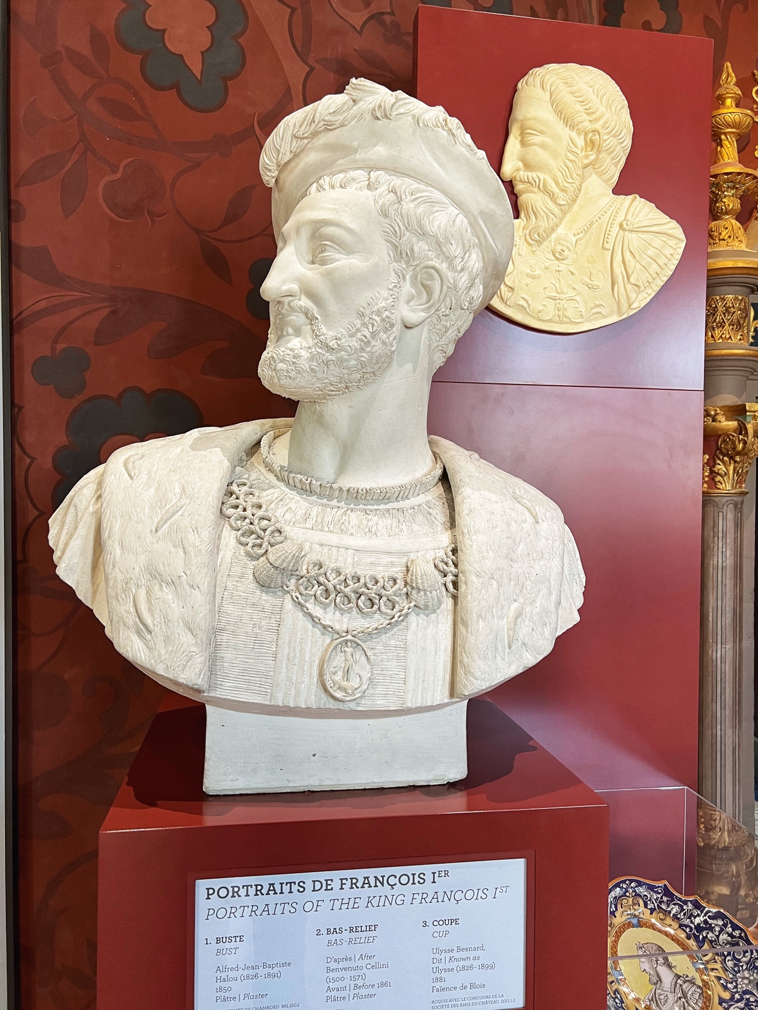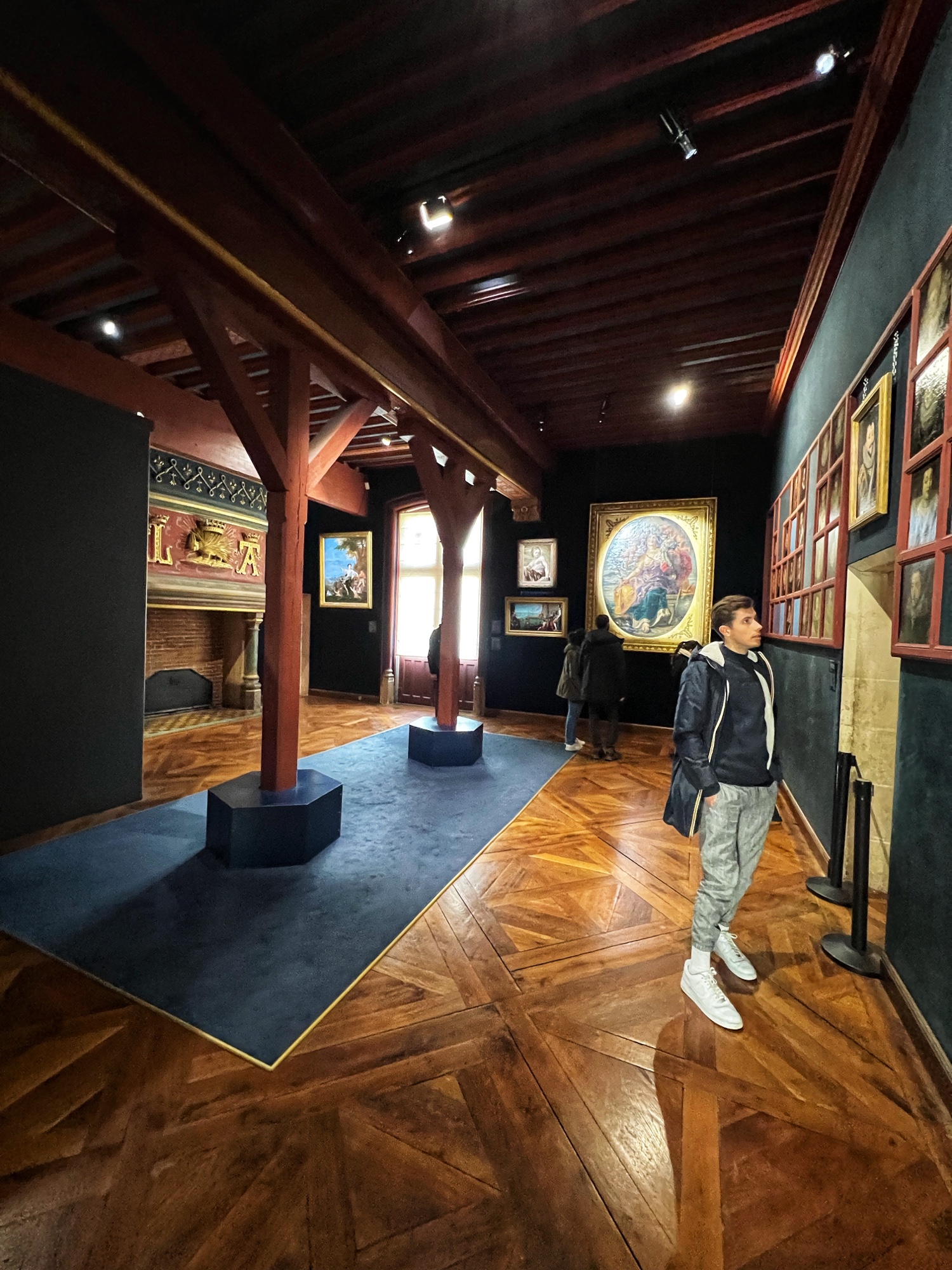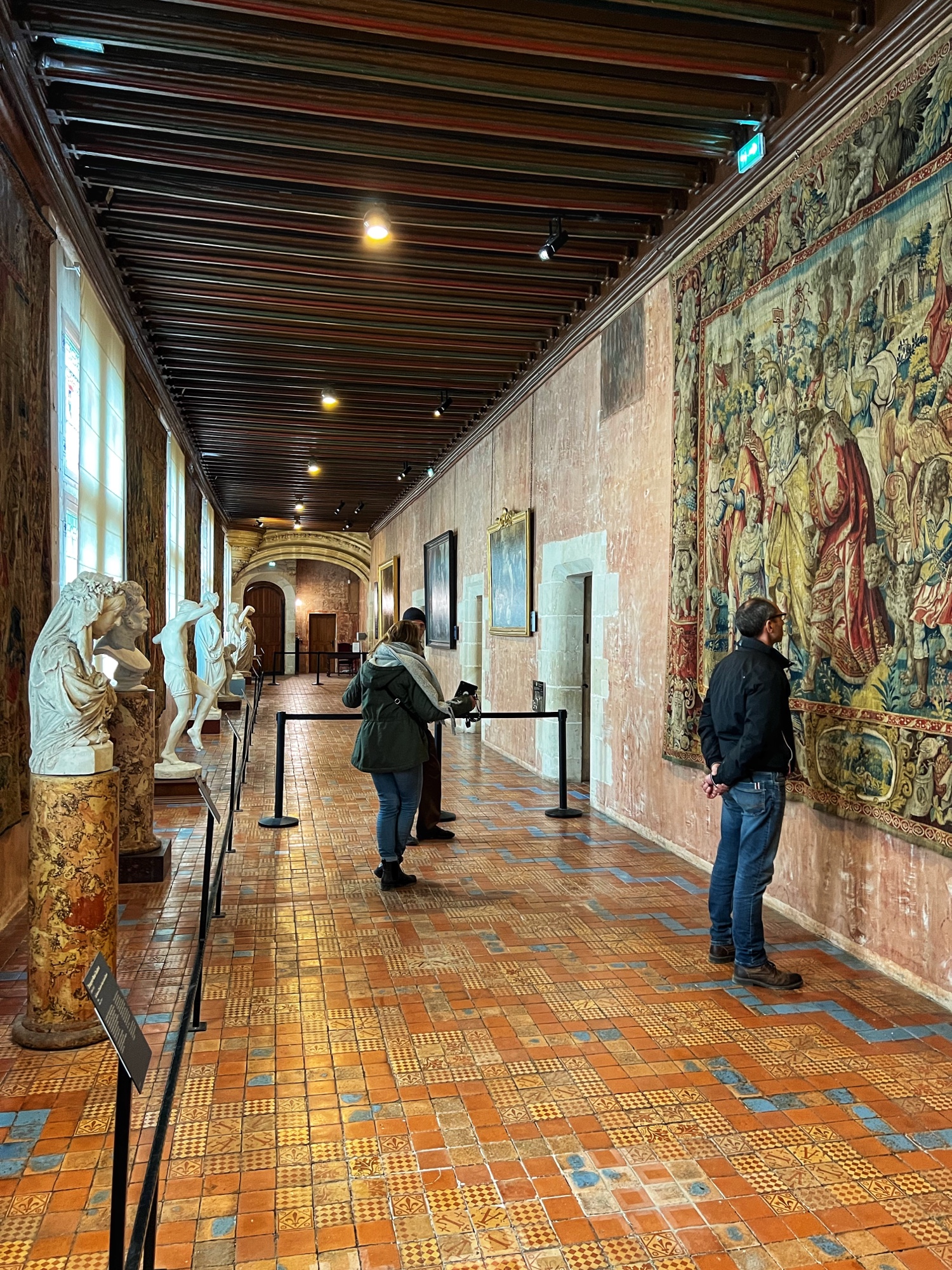 Above is a great view of the Histopad and how it shows a virtual trip through time. The furniture in these rooms were absolutely fabulous – with unbelievable wood carving details. And so colorful! The emblems of Louis XII (porcupine) and Francois 1st (salamander) are evident all through the palace. I loved the up close and personal art collection including busts of all the kings we were learning about, beautiful pottery, and countless paintings.