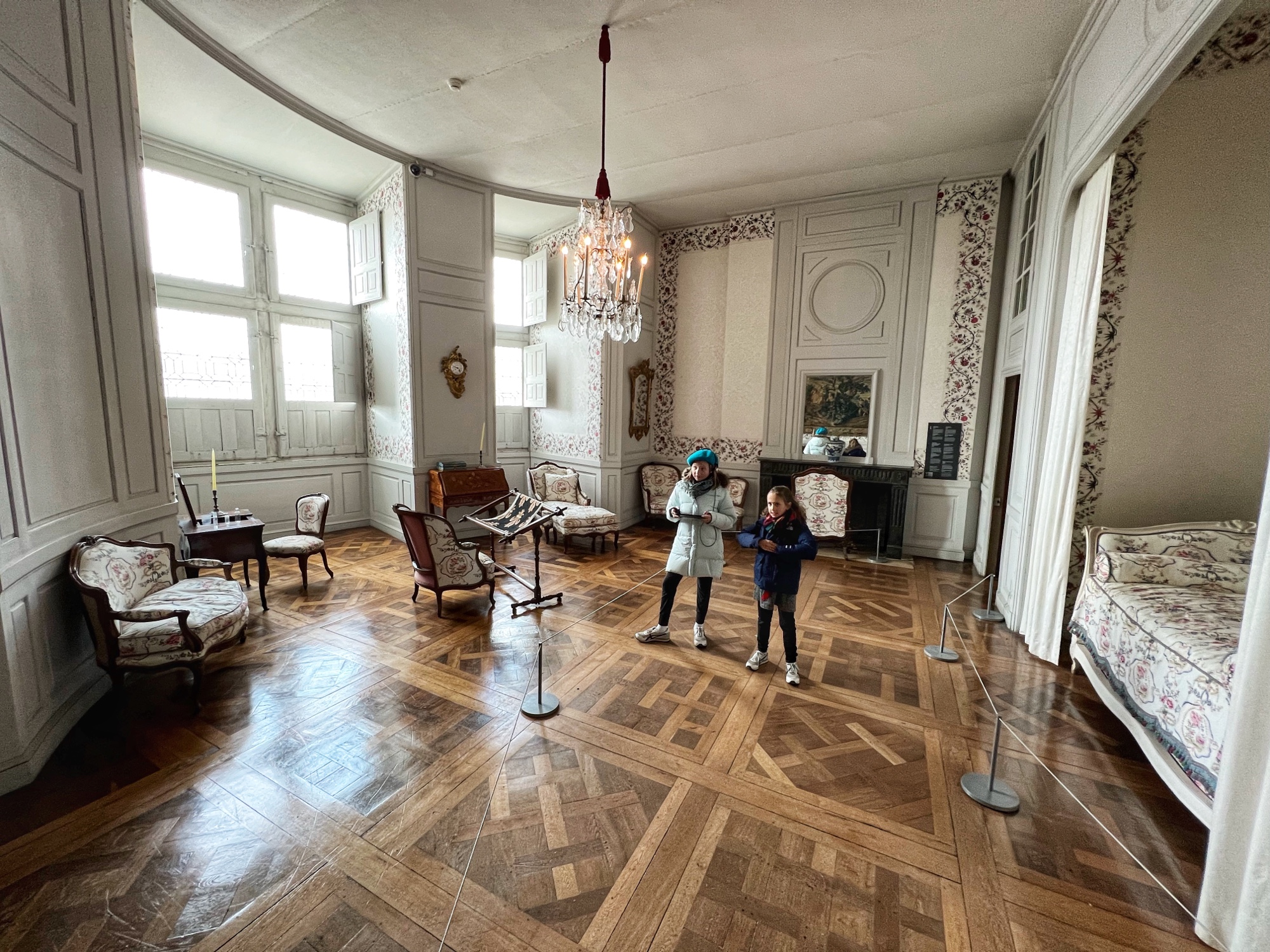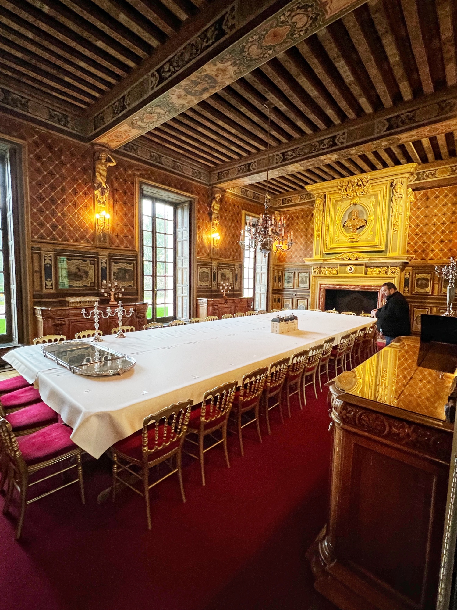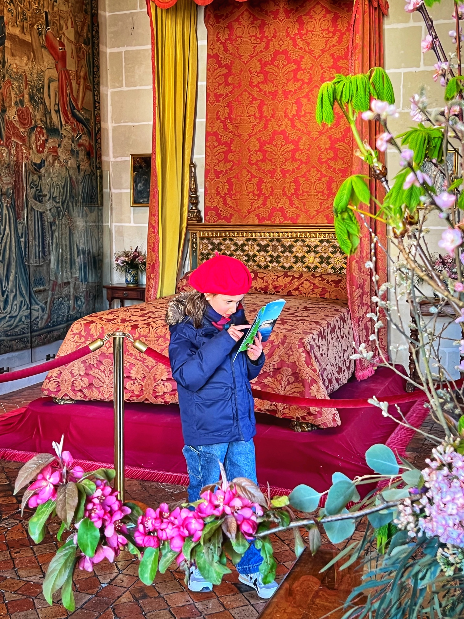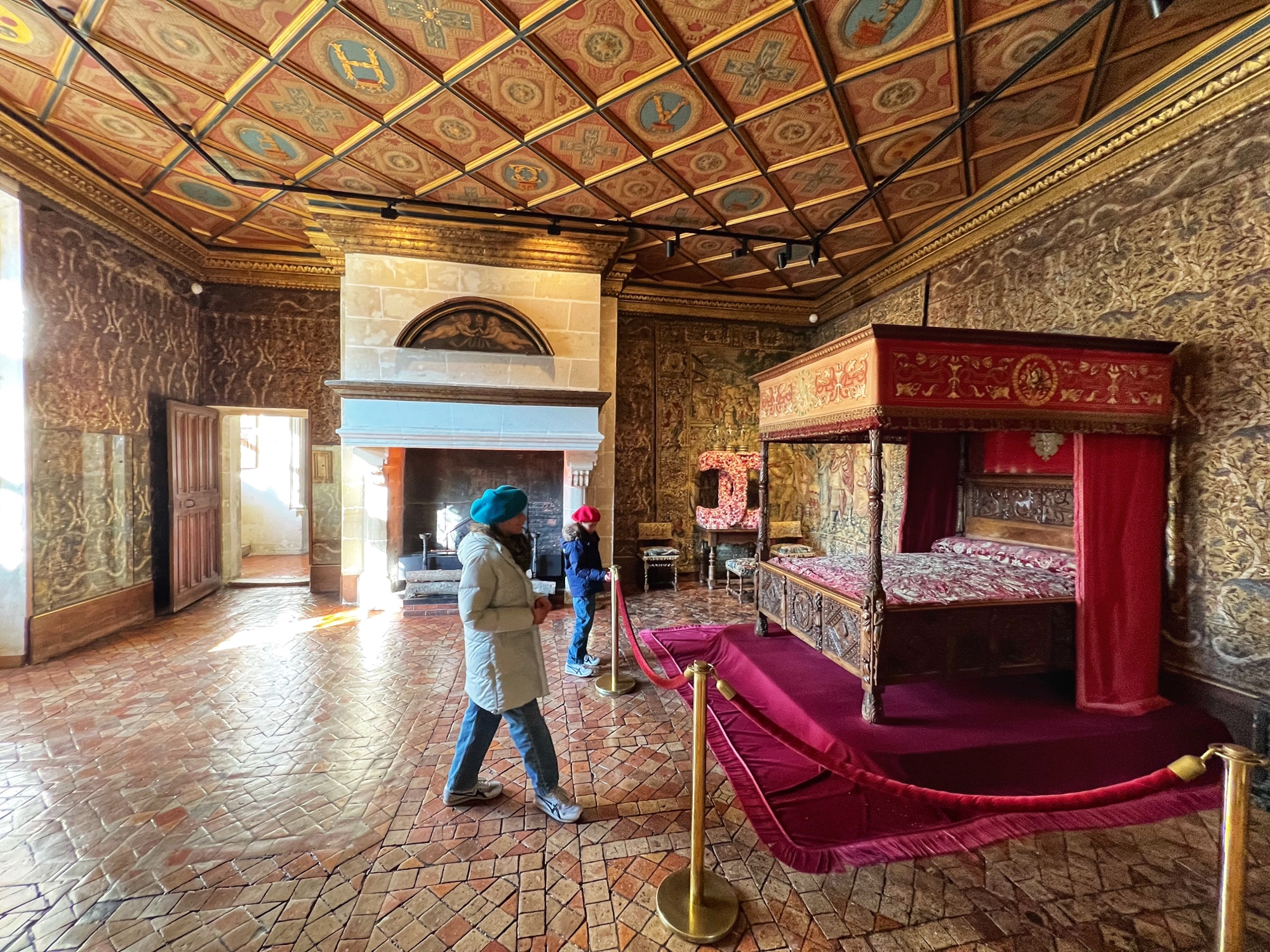 The most hilarious part of the tour was when the audioguide instructed us to inspect the tapestries along the grand gallery (hallway) to count how many people in the image were “peeing.” HA! The girls really got a kick out of this. I also loved the fancy staircases. Something especially interesting was the King’s Chamber (red room). All along the walls and on much of the furniture was a special golden palm designed red fabric. Apparently when they were renovating the château in more recent years, they found giant spools of this red fabric in the attic – and they decided to reupholster a set of chairs to match. You can see the difference in wear and fabric color brilliance in this room. Fascinating! Fabric covers everything. And fabric did not come cheap in the renaissance.