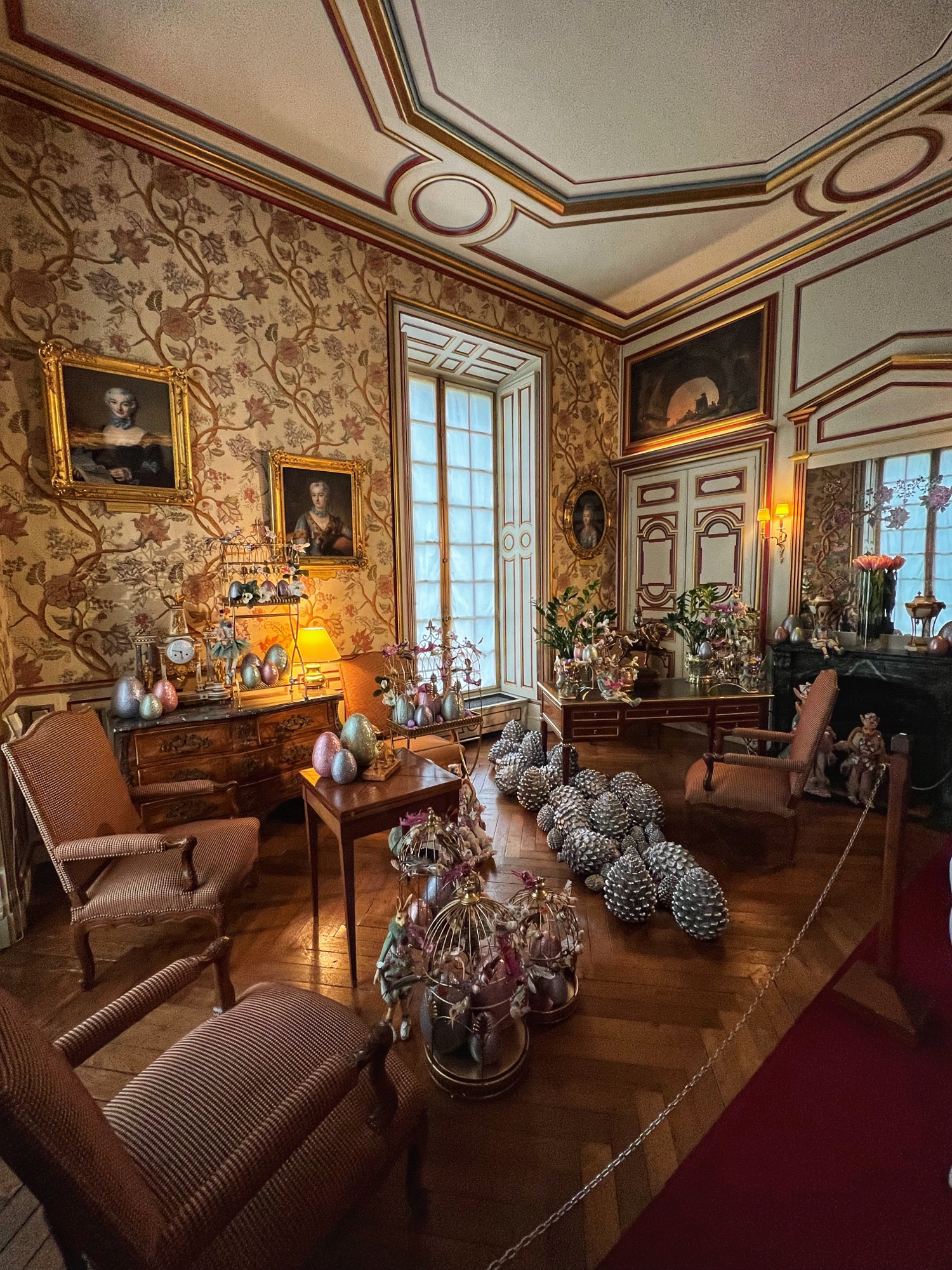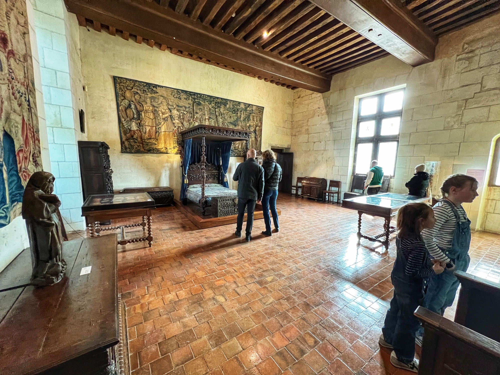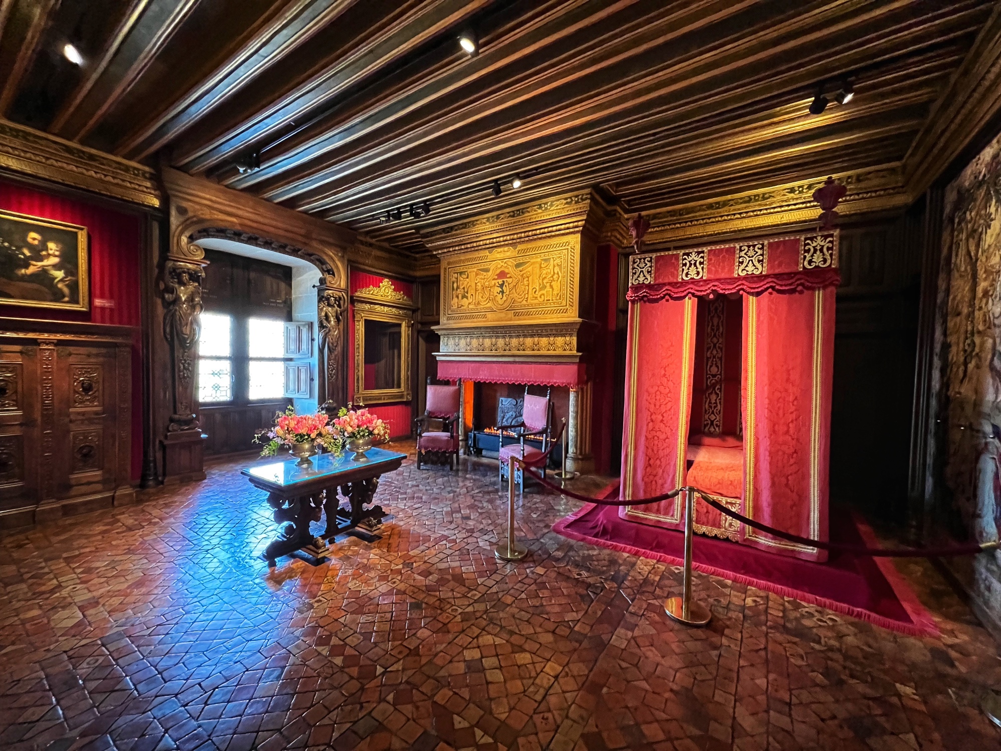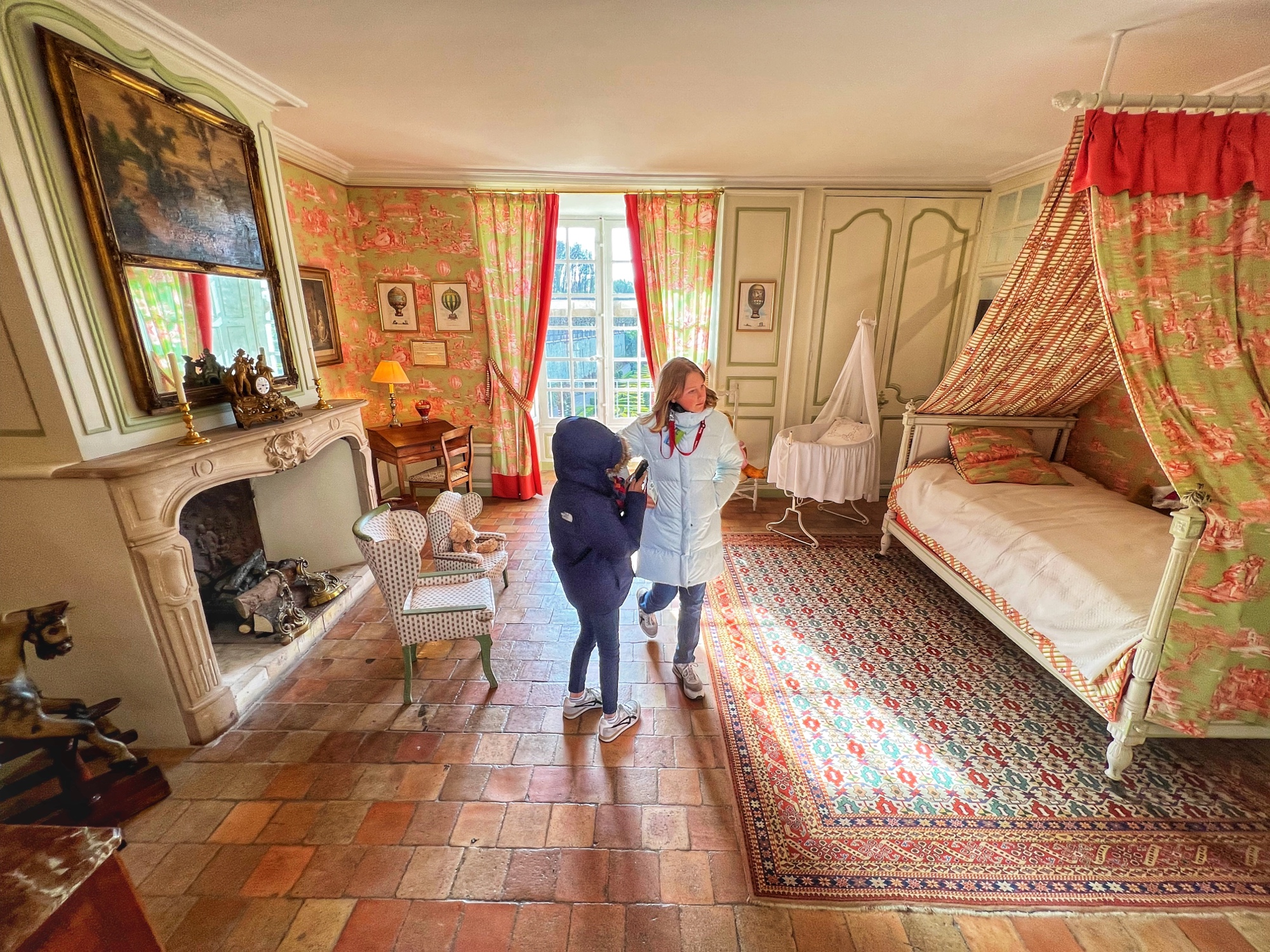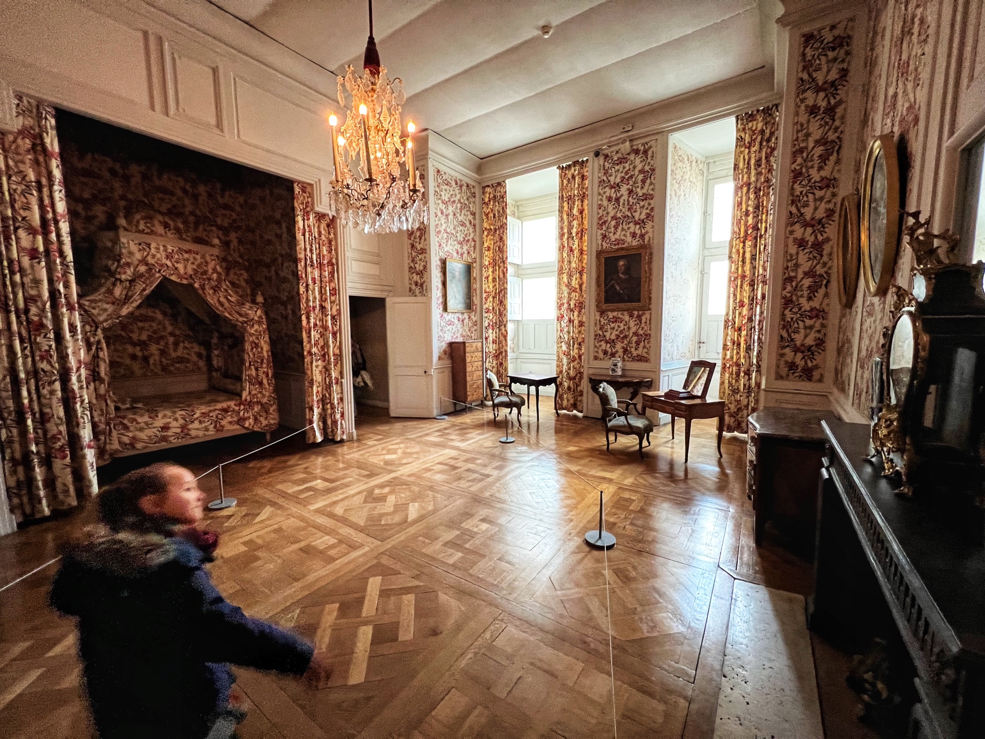 The most hilarious part of the tour was when the audioguide instructed us to inspect the tapestries along the grand gallery (hallway) to count how many people in the image were “peeing.” HA! The girls really got a kick out of this. I also loved the fancy staircases. Something especially interesting was the King’s Chamber (red room). All along the walls and on much of the furniture was a special golden palm designed red fabric. Apparently when they were renovating the château in more recent years, they found giant spools of this red fabric in the attic – and they decided to reupholster a set of chairs to match. You can see the difference in wear and fabric color brilliance in this room. Fascinating! Fabric covers everything. And fabric did not come cheap in the renaissance.