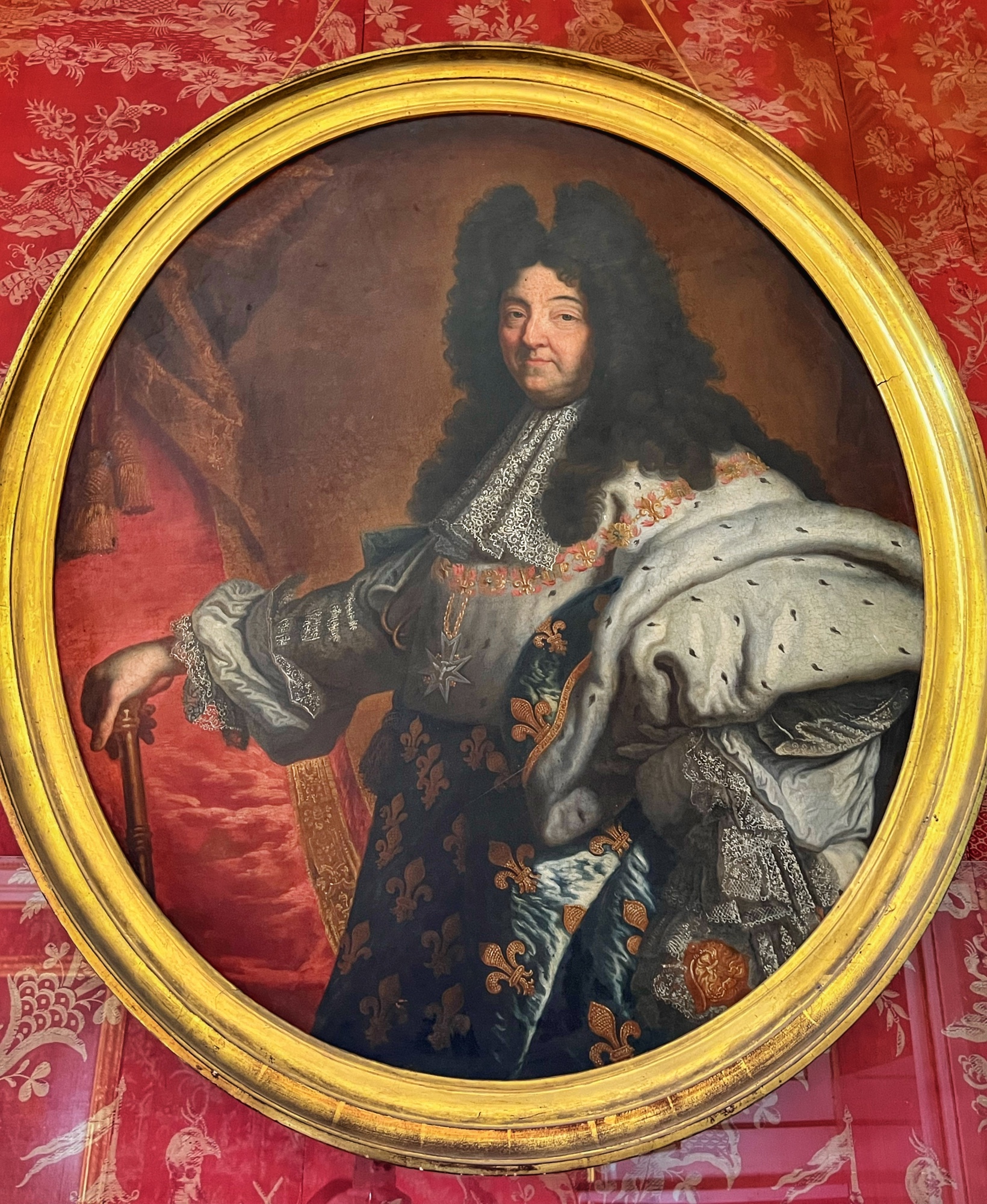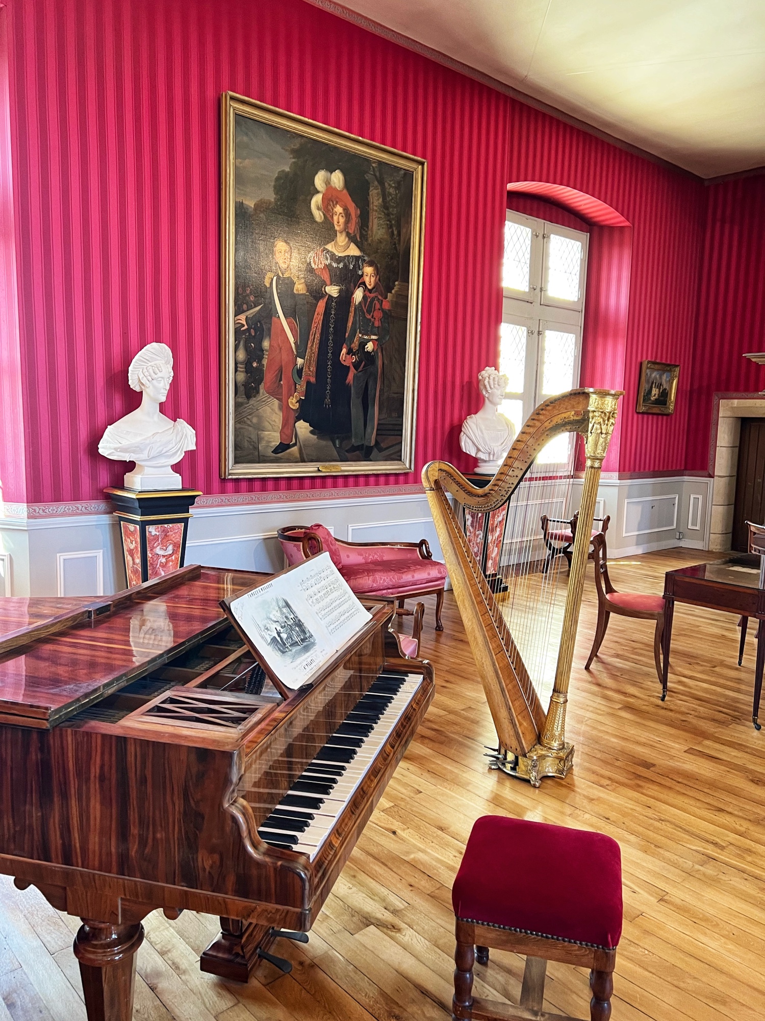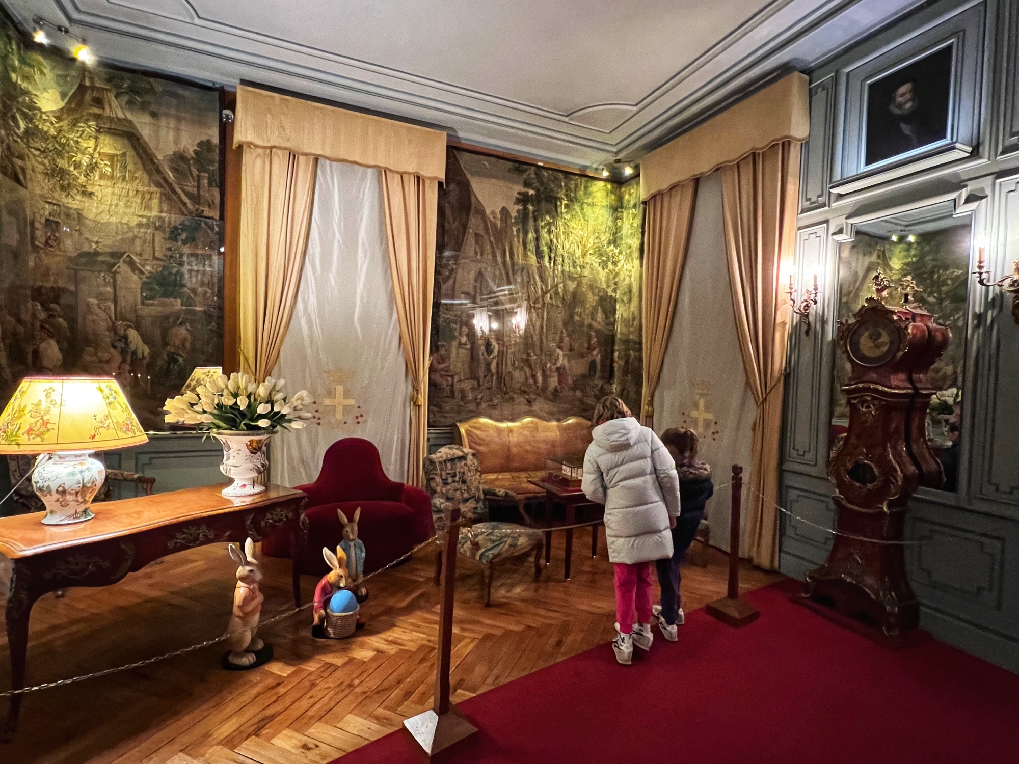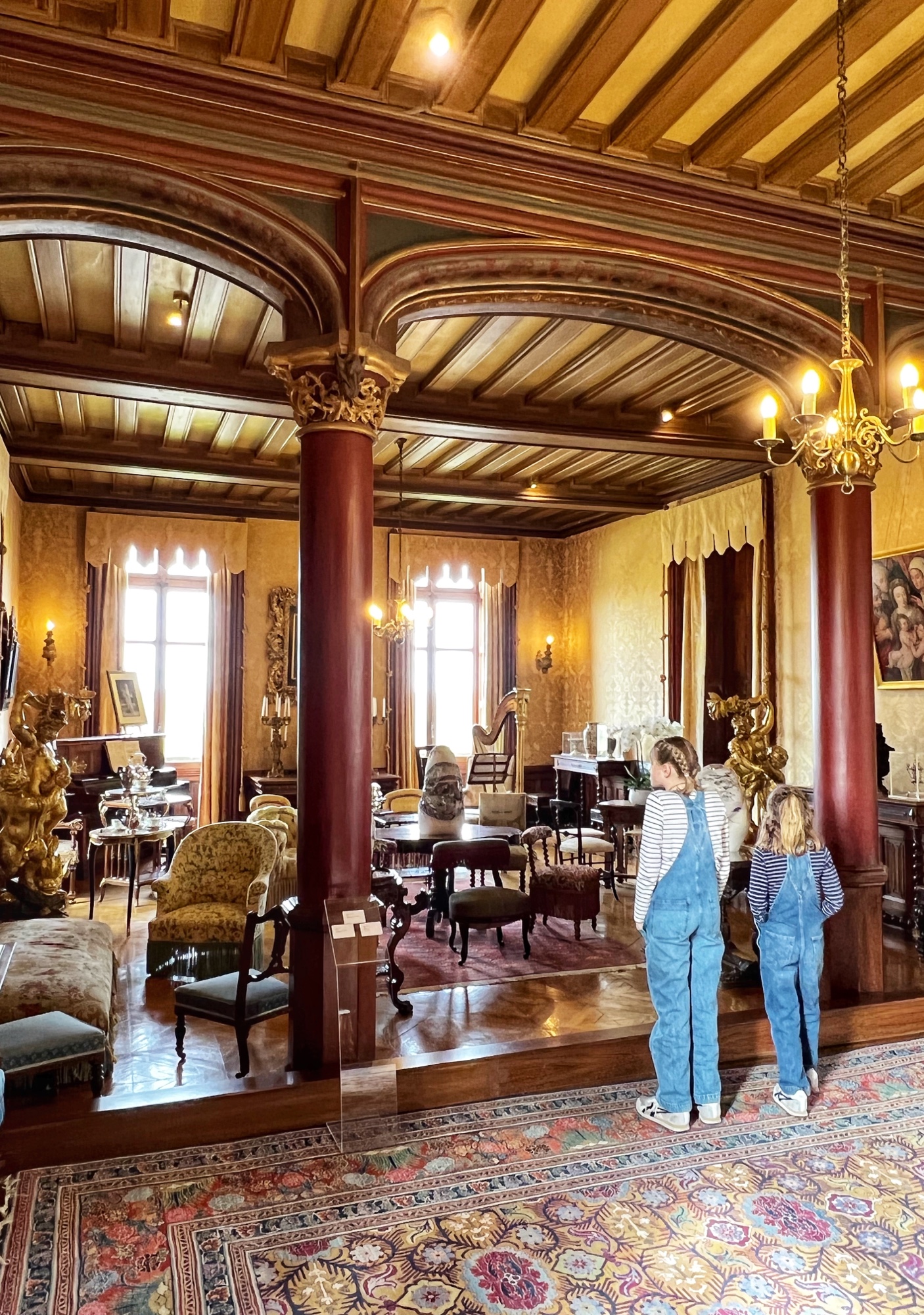The most hilarious part of the tour was when the audioguide instructed us to inspect the tapestries along the grand gallery (hallway) to count how many people in the image were “peeing.” HA! The girls really got a kick out of this. I also loved the fancy staircases. Something especially interesting was the King’s Chamber (red room). All along the walls and on much of the furniture was a special golden palm designed red fabric. Apparently when they were renovating the château in more recent years, they found giant spools of this red fabric in the attic – and they decided to reupholster a set of chairs to match. You can see the difference in wear and fabric color brilliance in this room. Fascinating! Fabric covers everything. And fabric did not come cheap in the renaissance.