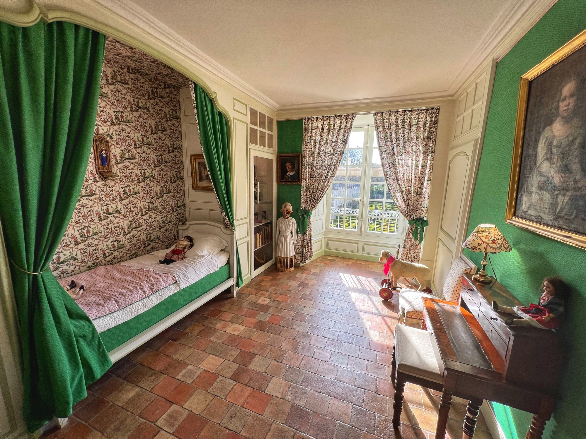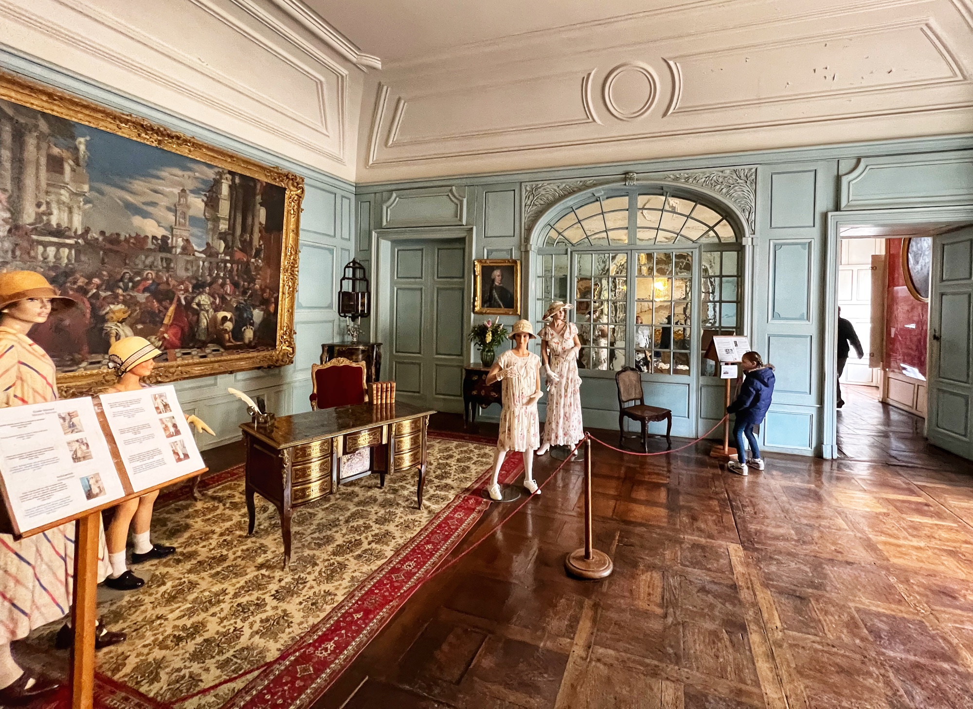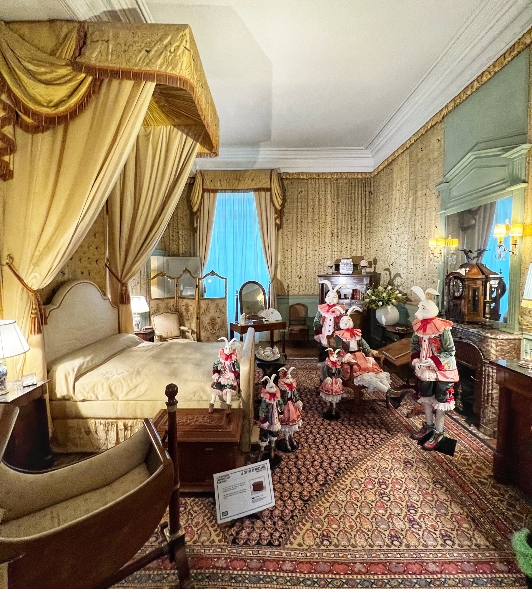 The tour will take you through the extensive rooms of the castle, then outside to a few notable spots (chapel, cave, prison, carriage house in the stables, and gardens). Most notable perhaps is the abundant use of mannequins to display period fashion. The girls said it creeped them out, but I thought it was fascinating to see the clothing of the time. Dresses, shoes, gloves, all meticulously crafted. Keep an eye out for tiny versions of things, as this castle was very kid friendly. Also, although the quiz booklet is in French, it was easy for us to decipher the clues and solve the puzzle. The girls loved finding clues and questions in each room!